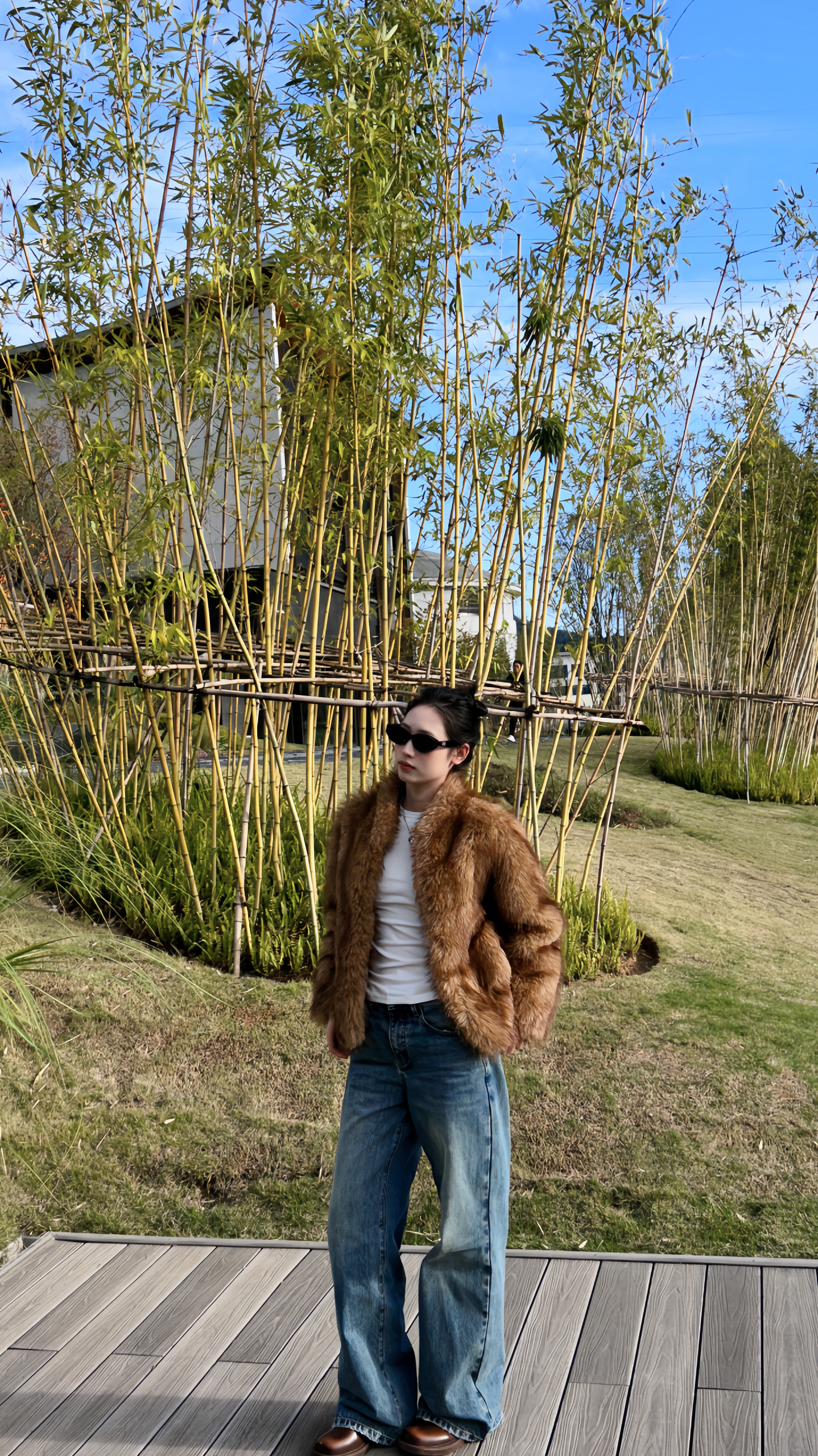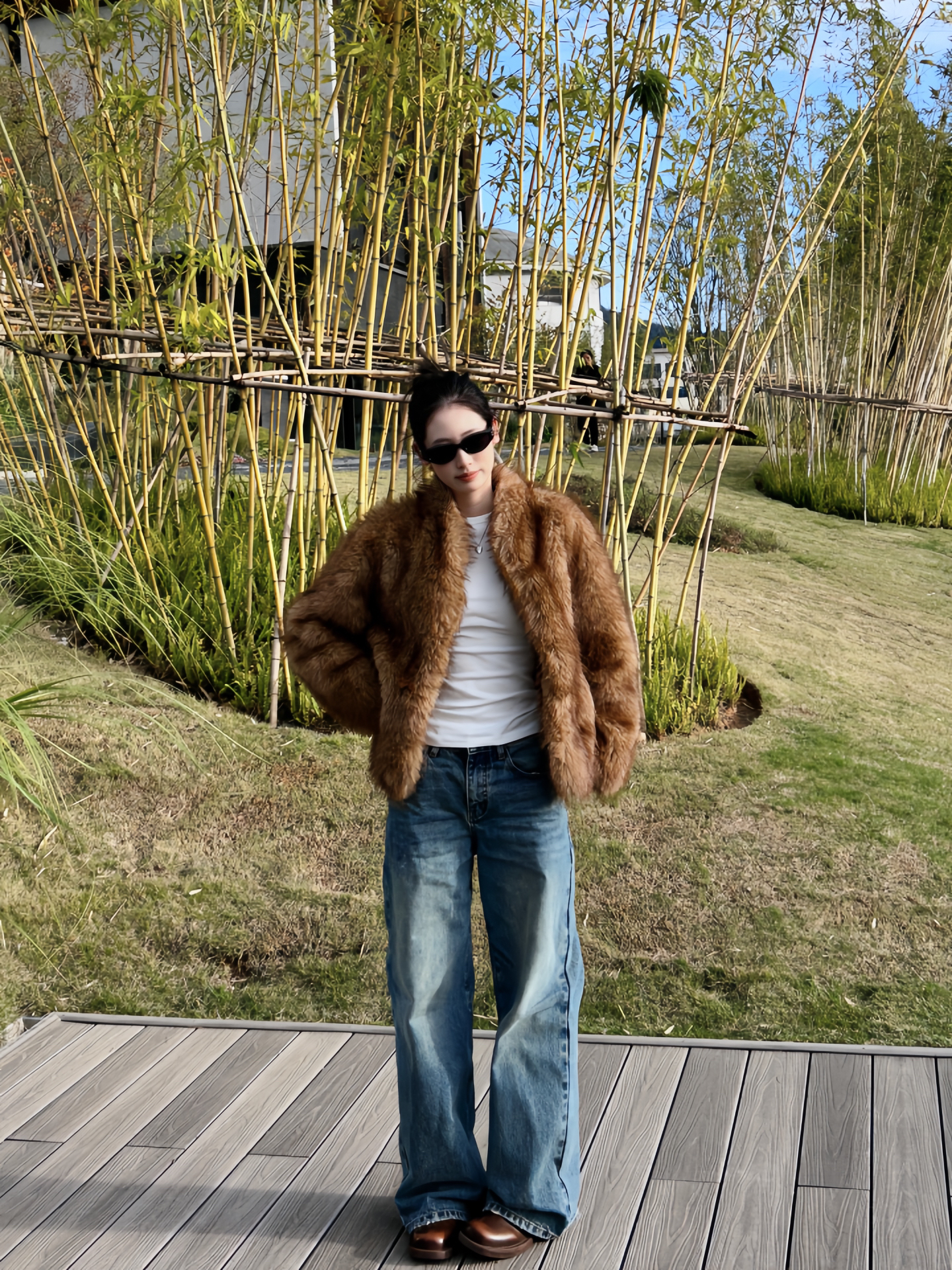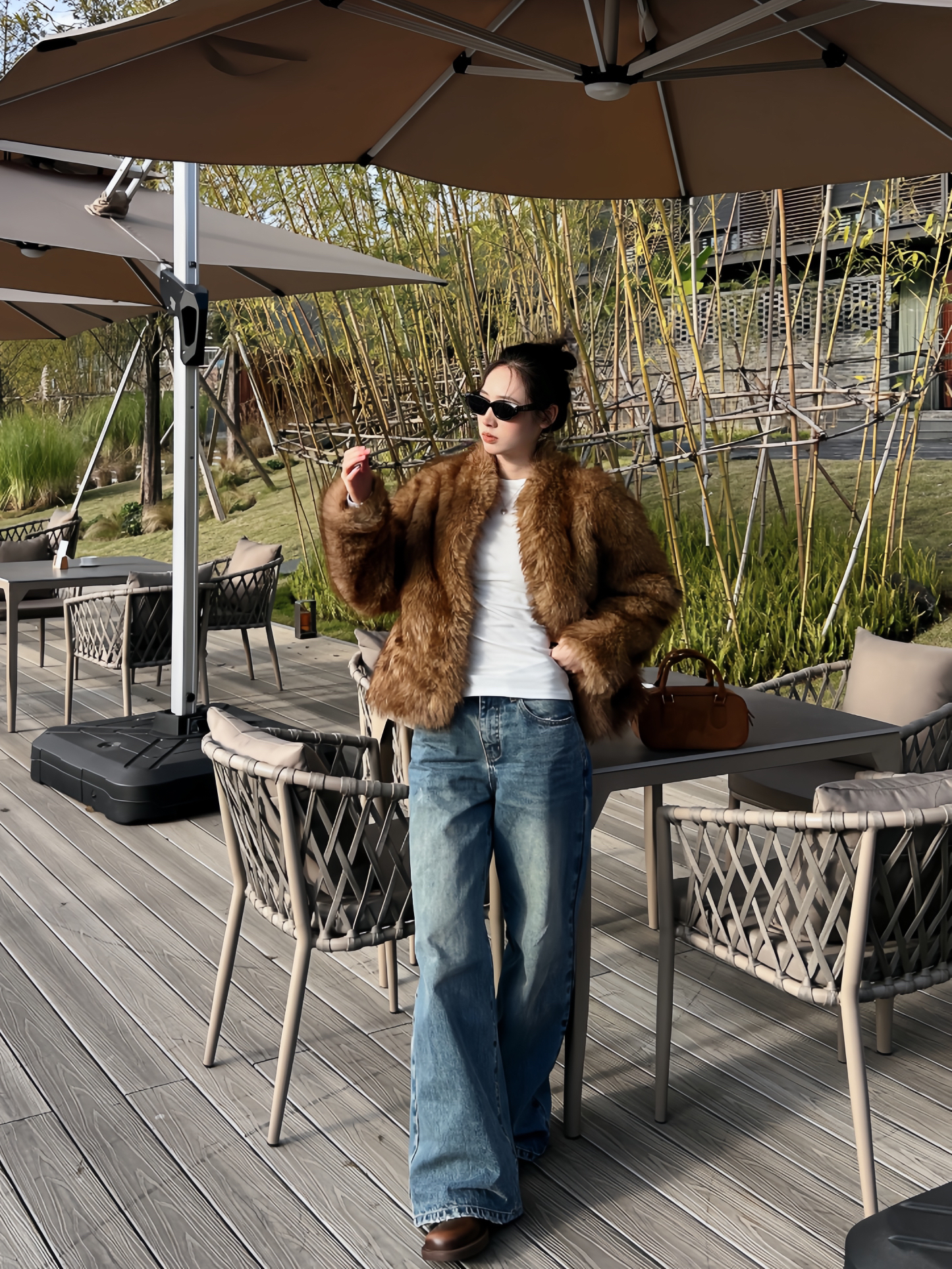 软乎乎的毛绒裹满暖调,配件极简白T压稳底色,再搭条做旧牛仔,把精致揉得随性; 棕棕的小包往桌上一放,和外套色调刚好勾成呼应,往露天座一站,连风里都裹着“不费力的精致”,是秋日光里刚好的松弛感~