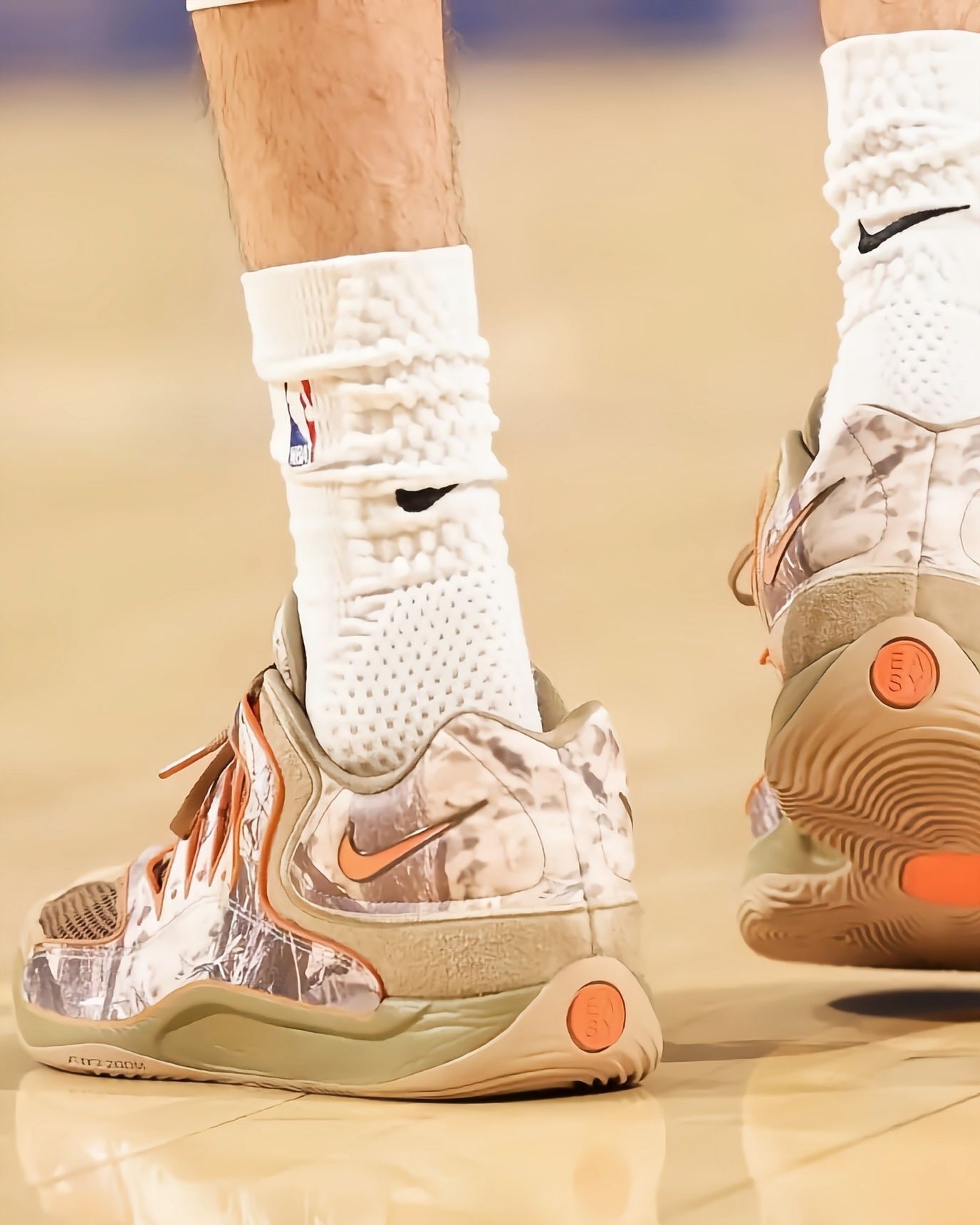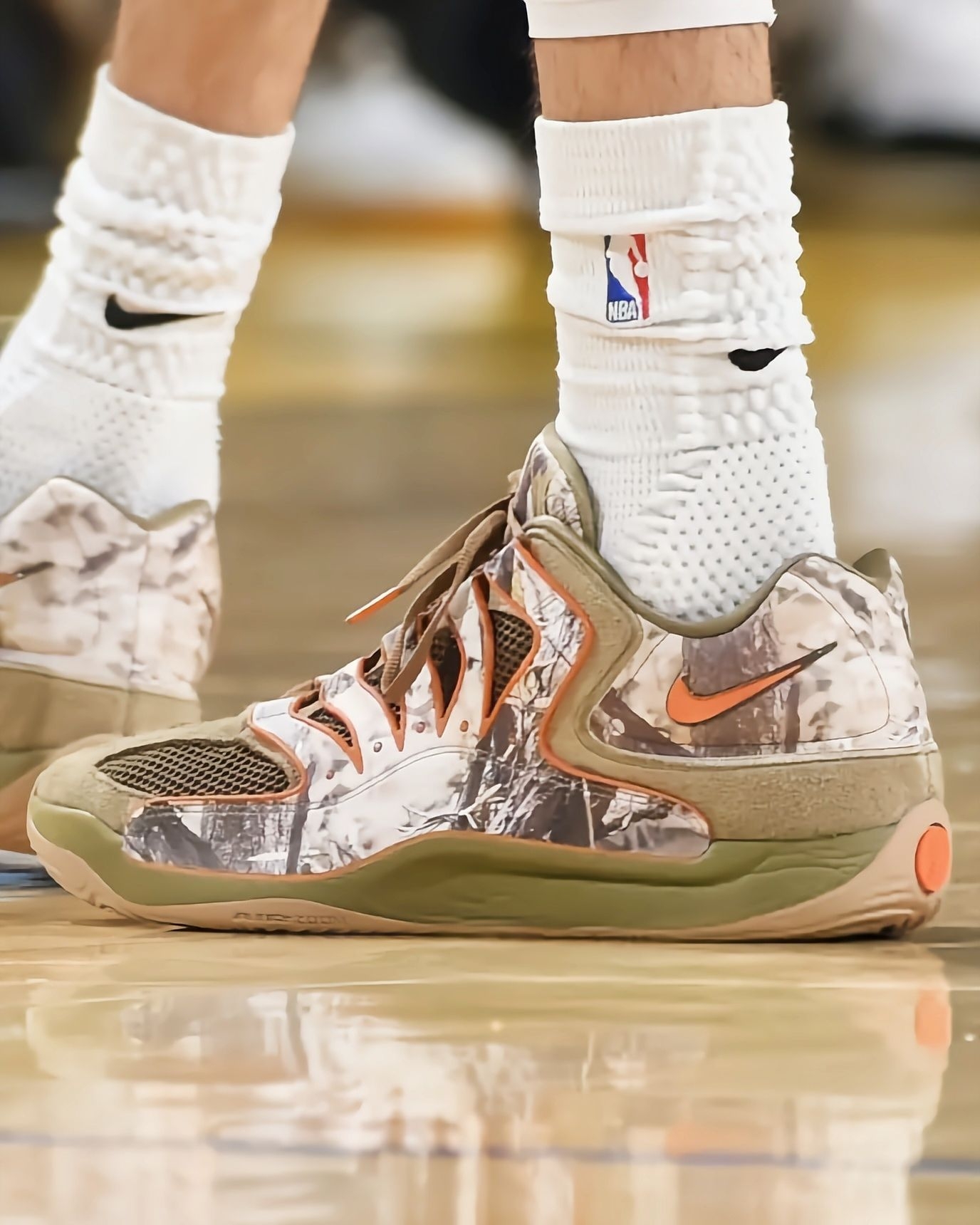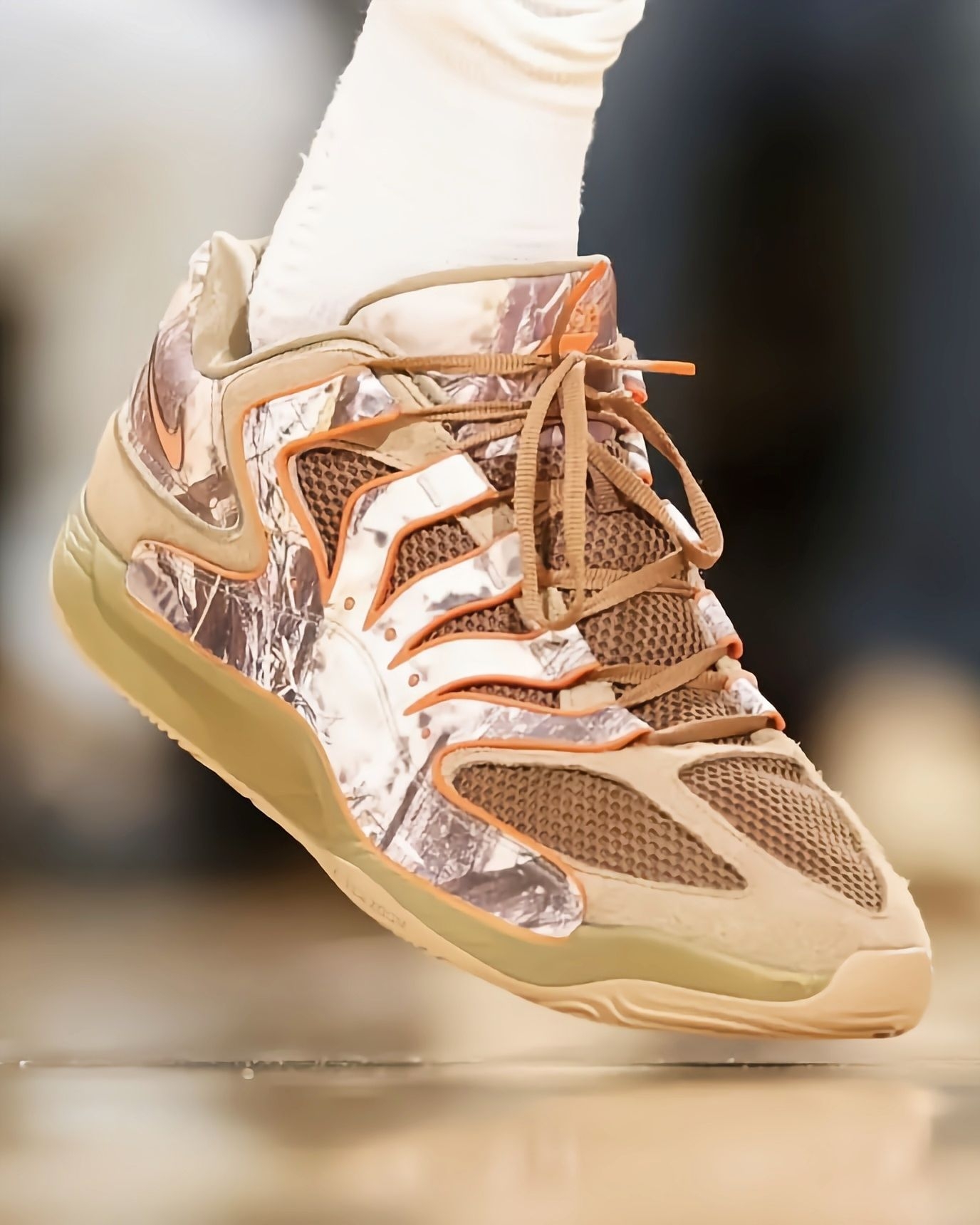 最近看雷霆比赛,总能被切特脚上这双落叶迷彩KD18 PE吸引,关键这鞋现在还买不到,要等到明年春天才正式发售,真的越看越期待!先说说从比赛里观察到的实战表现:切特作为瘦高型锋线,频繁要做变向突破和急停跳投,这鞋的中足TPU笼结构是真顶用,好几次对抗中他侧身发力,鞋身都没出现变形,支撑性肉眼可见靠谱。前掌Zoom气垫的反馈特别直接,他快攻时的蹬地加速,能感觉到气垫瞬间回弹,完全不拖启动节奏,比上一代...