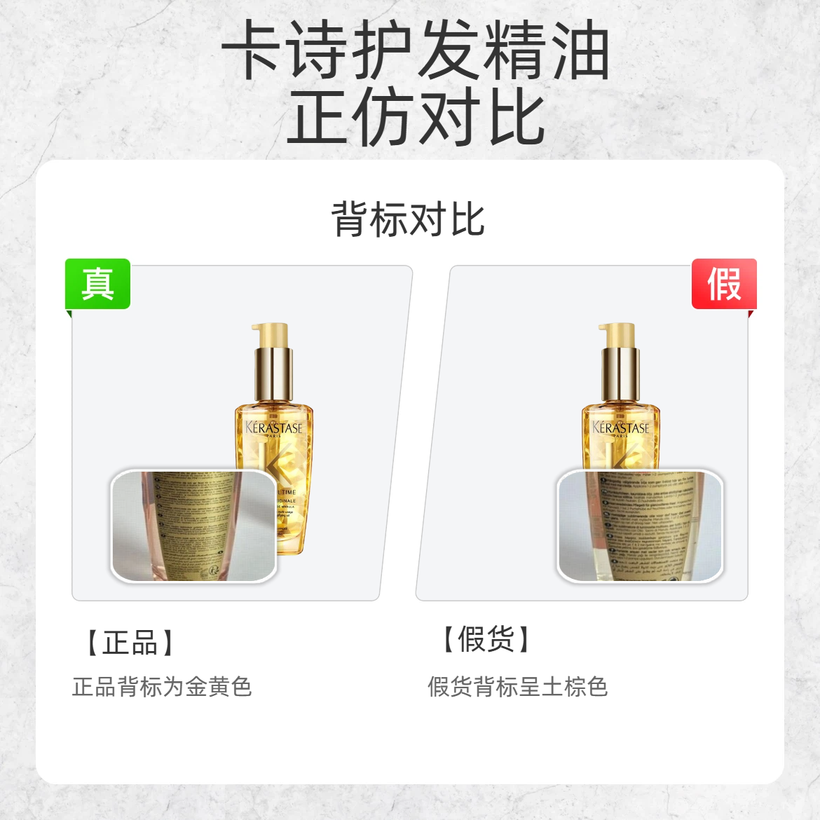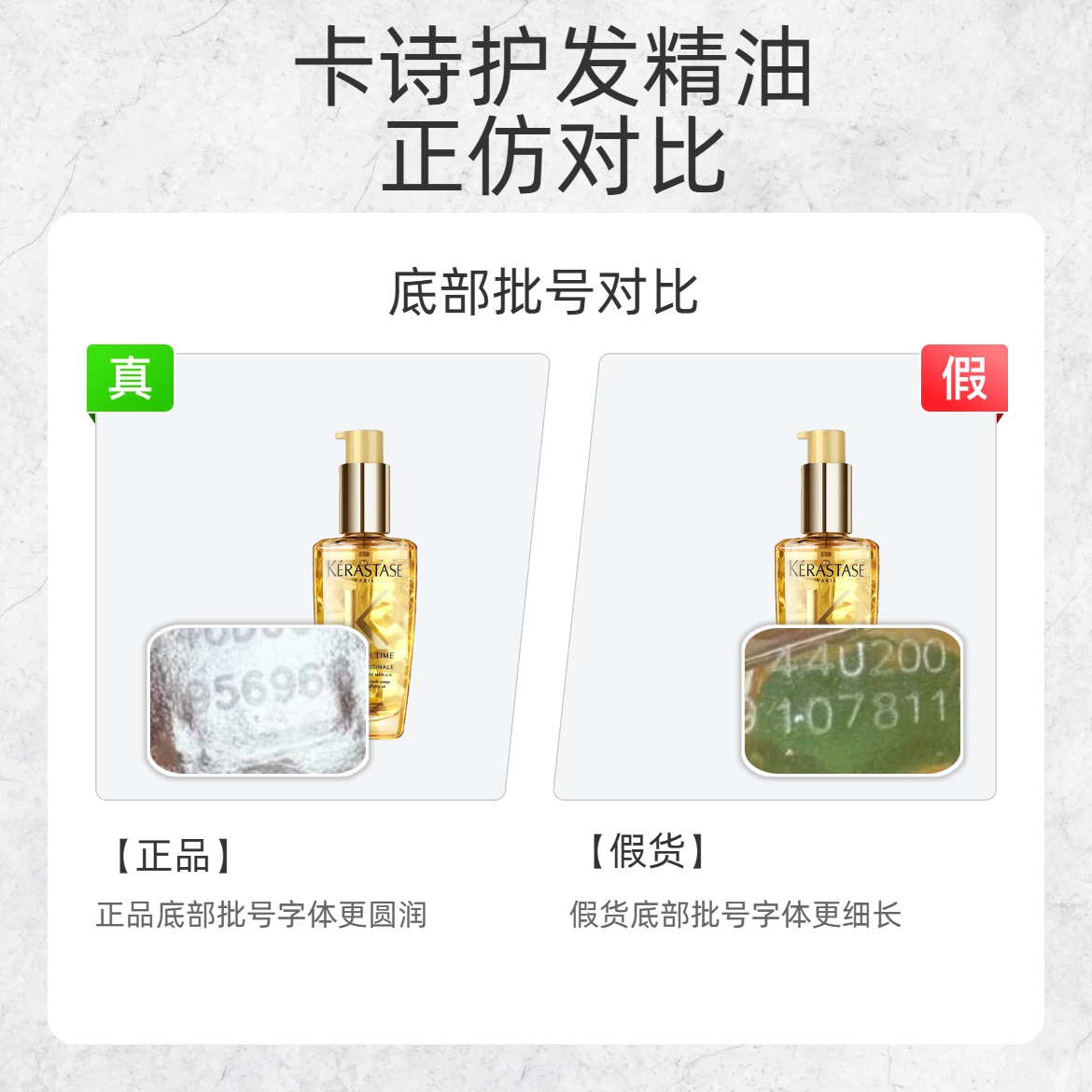 花大几百买的护发精油居然是假的?这波真的会谢!3 个超直观鉴别点,看完直接避雷! 1️⃣ 吸管形状 ✅正品:内部吸管是直的 ❌假货:吸管是弯的 2️⃣ 底部批号 ✅正品:批号字体圆润饱满 ❌假货:字体细长 3️⃣ 背标颜色 ✅正品:背标是明亮的金黄色 ❌假货:背标呈土棕色,颜色暗沉 💡划重点:卡诗正品的细节质感很精致,假货一对比就露馅!