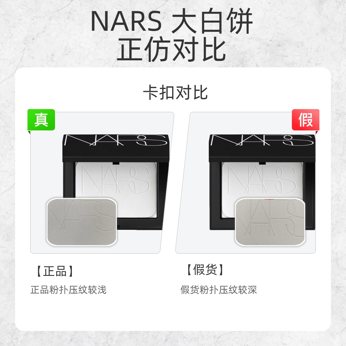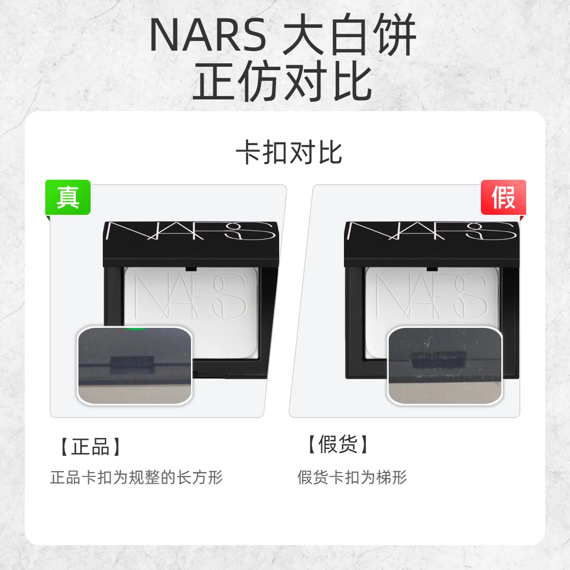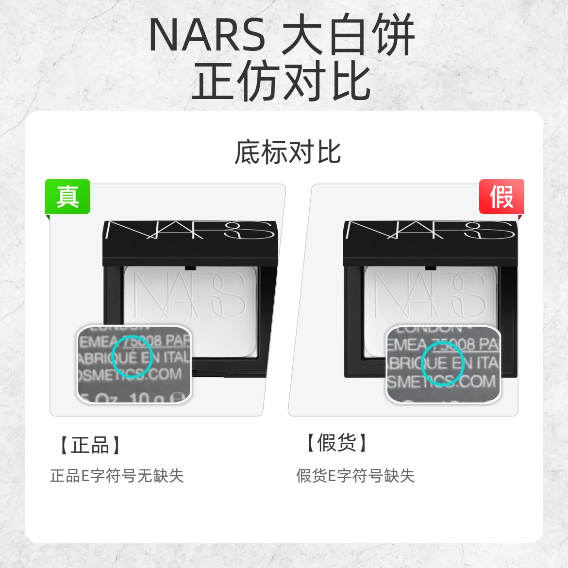 定妆界 “扛把子” 大白饼也有假货?这波细节教你一眼辨真假! 1️⃣ 底标字符 ✅正品:底标 “E” 字母上有变音符号 ❌假货:底标“E”字母上的变音符号有缺失 2️⃣ 卡扣形状 ✅正品:卡扣是规整的长方形,做工精致 ❌假货:卡扣呈梯形,边缘不平整 3️⃣ 粉扑压纹 ✅正品:粉扑上的 “NARS” 压纹较浅,质感细腻 ❌假货:压纹较深,纹路生硬 💡划重点:大白饼的正品细节是仿品 “偷工减料...