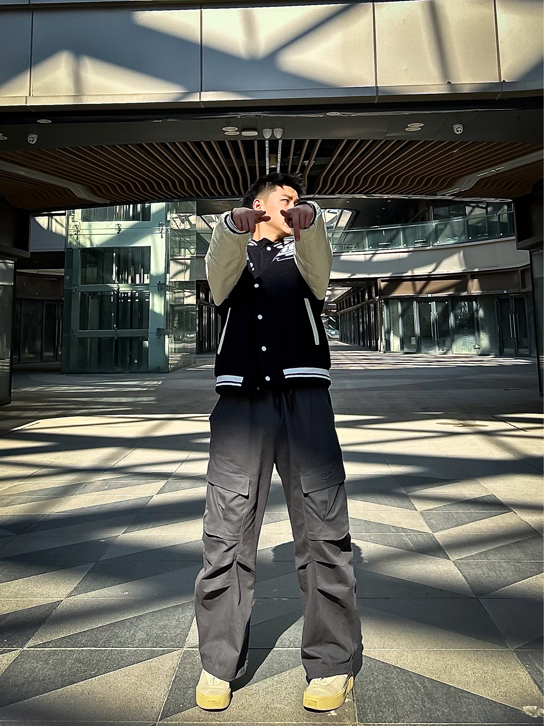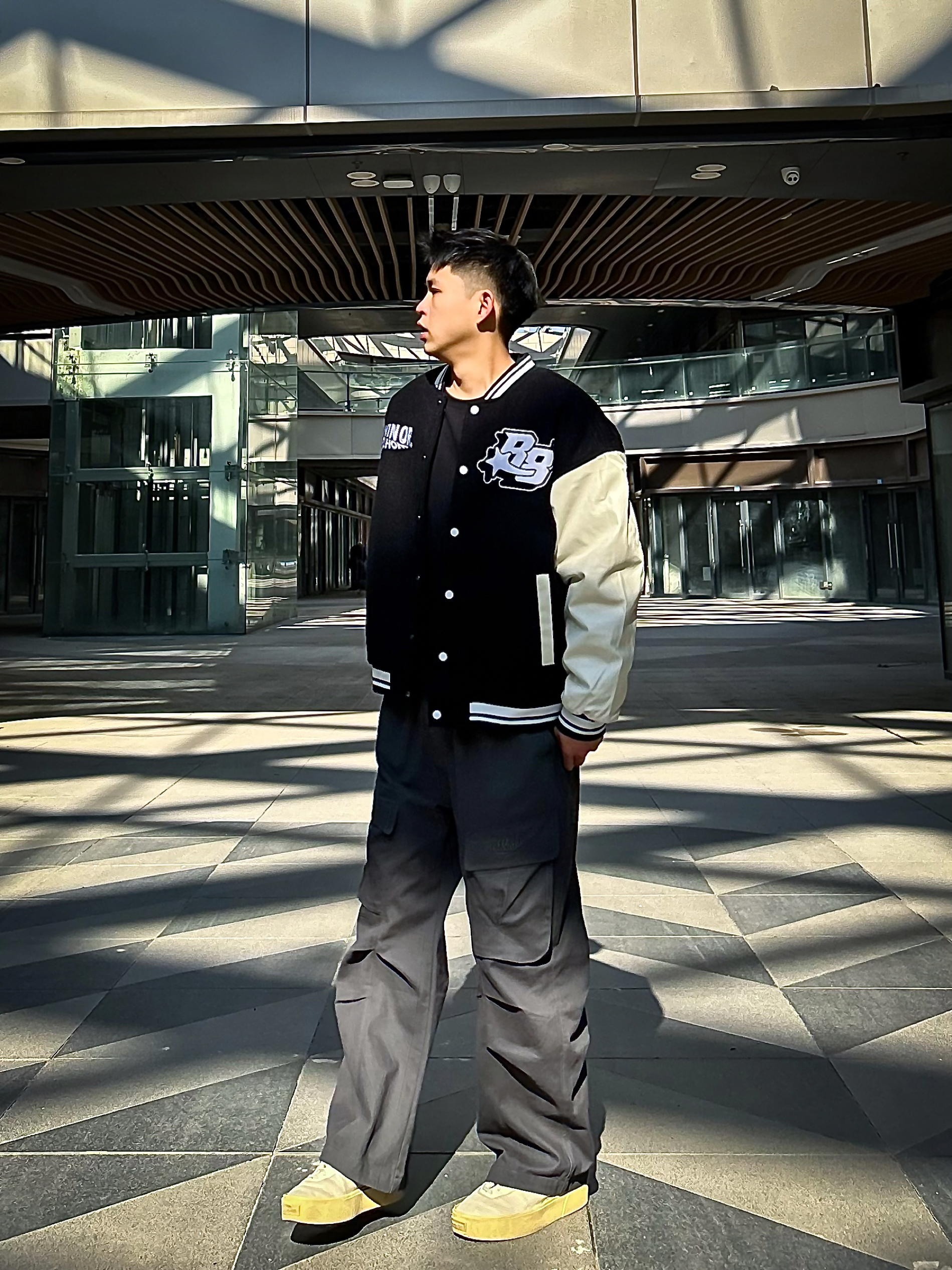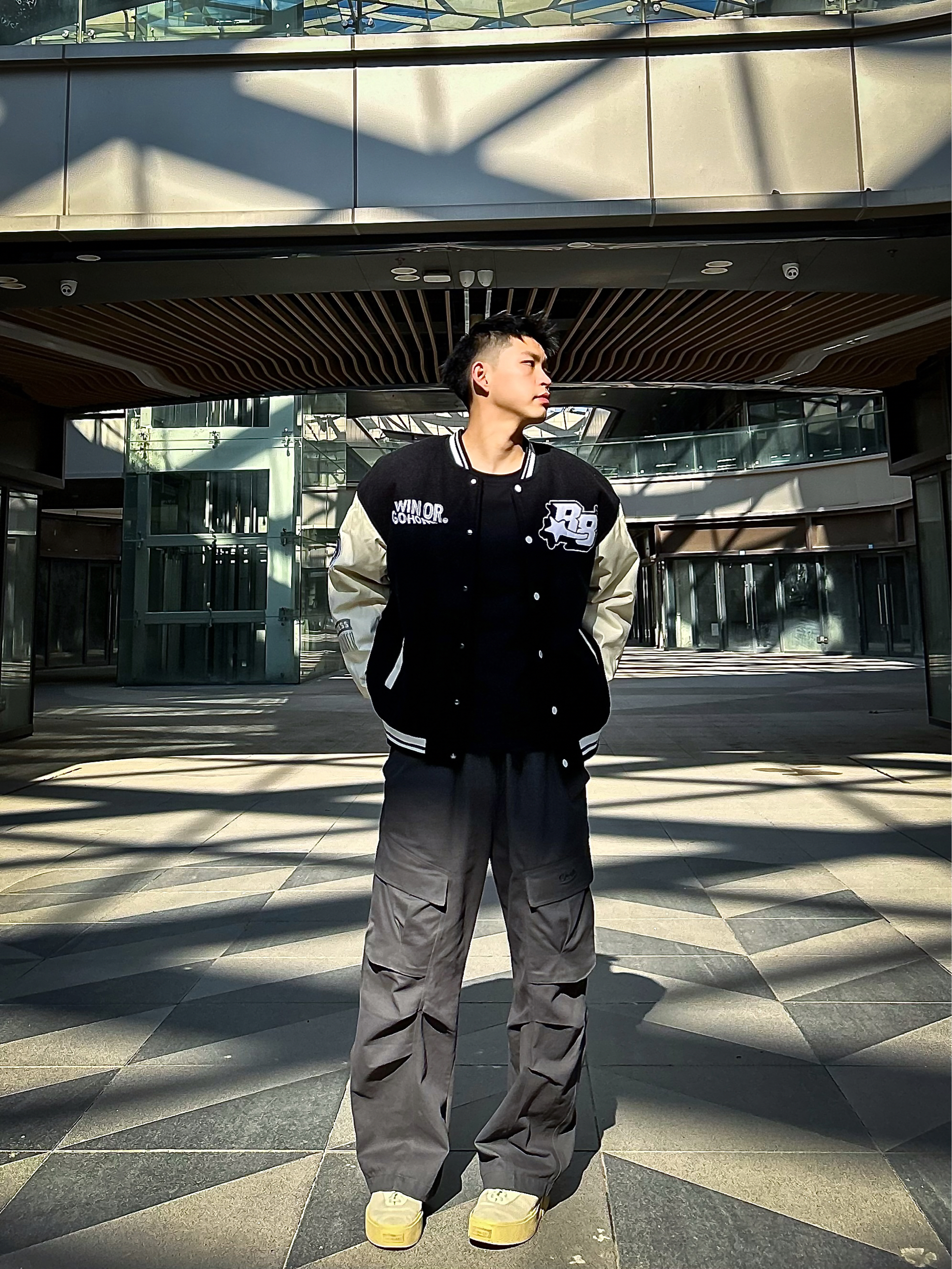 哈咯,这里是爱打球爱穿搭的卢_SG 年度穿搭秋冬美式复古运动风松弛感公式! 上身选了黑杏拼色棒球夹克 毛呢主体+皮质袖面的材质碰撞,自带复古质感 胸前字母刺绣+袖身印花细节,简约又不单调 罗纹领口/袖口/下摆的设计,防风保暖还能修饰身形,打球外穿都适配 下身搭了条渐变灰工装阔腿裤 渐变色调打破纯色沉闷,大口袋+立体剪裁兼顾实用性与街头感 宽松裤型藏肉又显瘦,裤长刚好盖住鞋帮,轻松穿出“上短下...