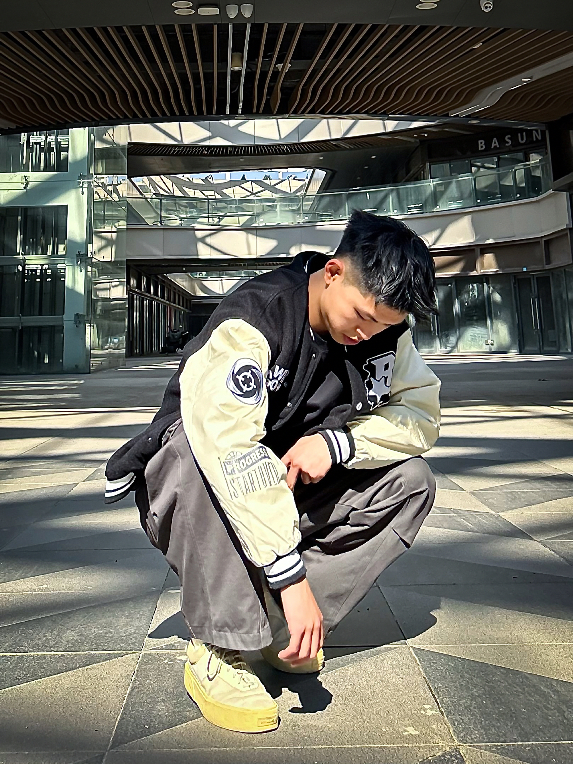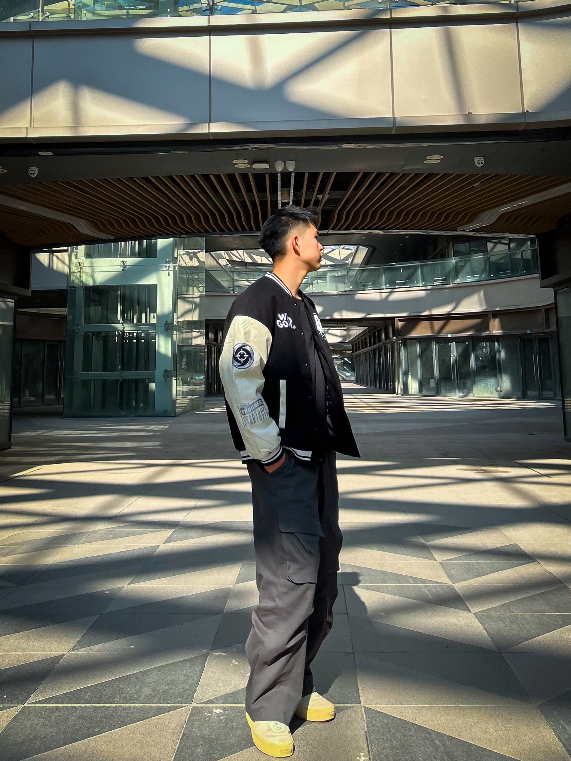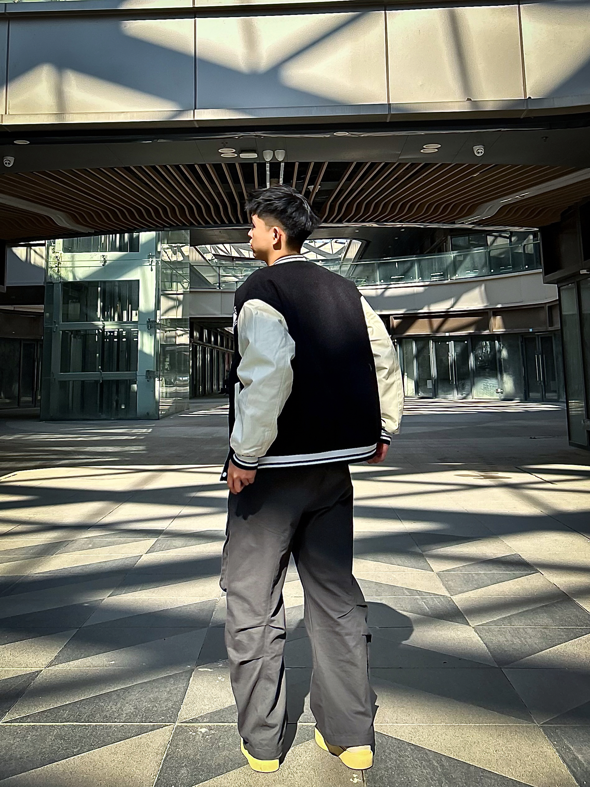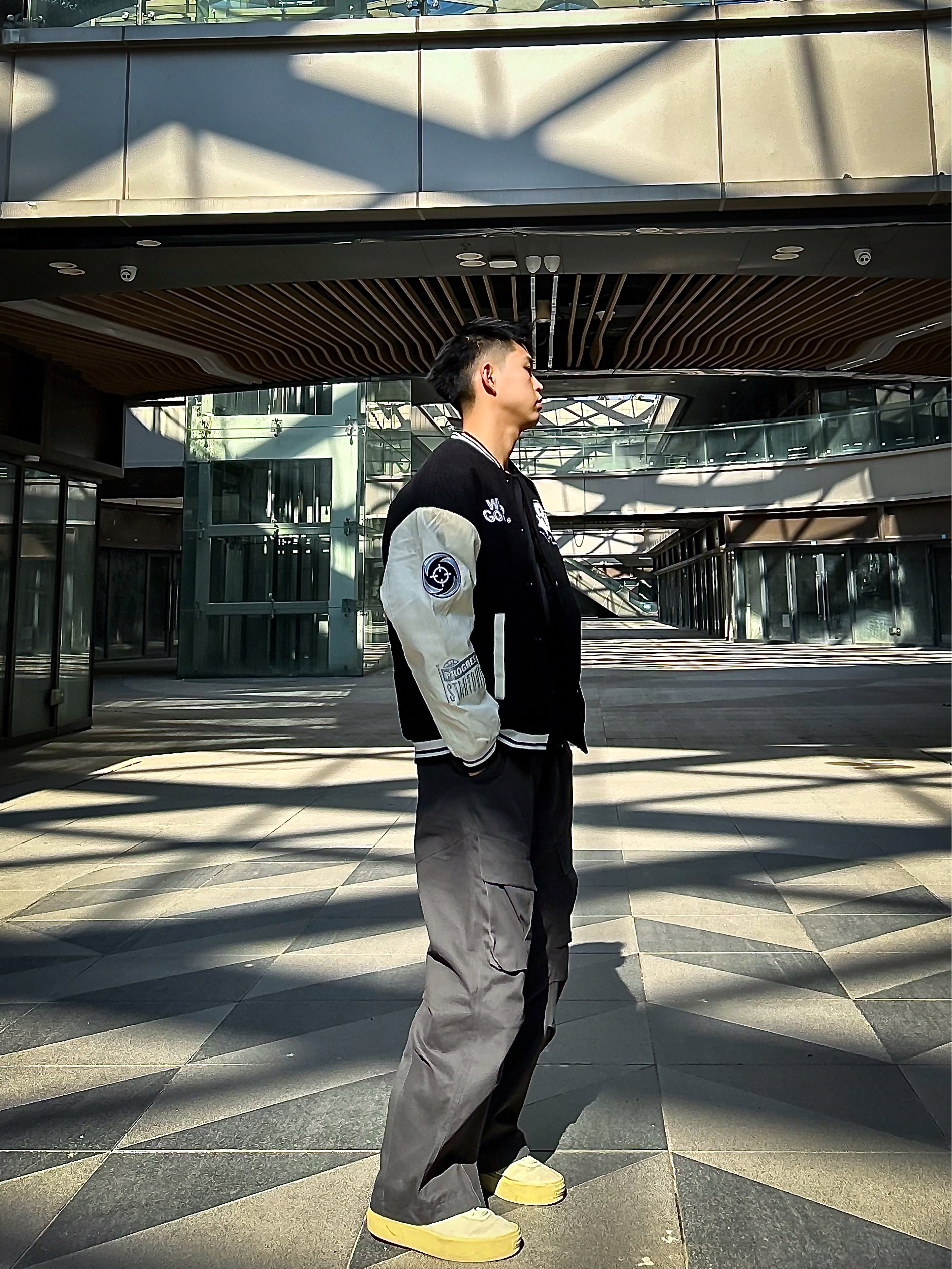 哈咯,这里是爱打球爱穿搭的卢_SG 年度穿搭秋冬美式复古运动风松弛感公式! 上身选了黑杏拼色棒球夹克 毛呢主体+皮质袖面的材质碰撞,自带复古质感 胸前字母刺绣+袖身印花细节,简约又不单调 罗纹领口/袖口/下摆的设计,防风保暖还能修饰身形,打球外穿都适配 下身搭了条渐变灰工装阔腿裤 渐变色调打破纯色沉闷,大口袋+立体剪裁兼顾实用性与街头感 宽松裤型藏肉又显瘦,裤长刚好盖住鞋帮,轻松穿出“上短下...
