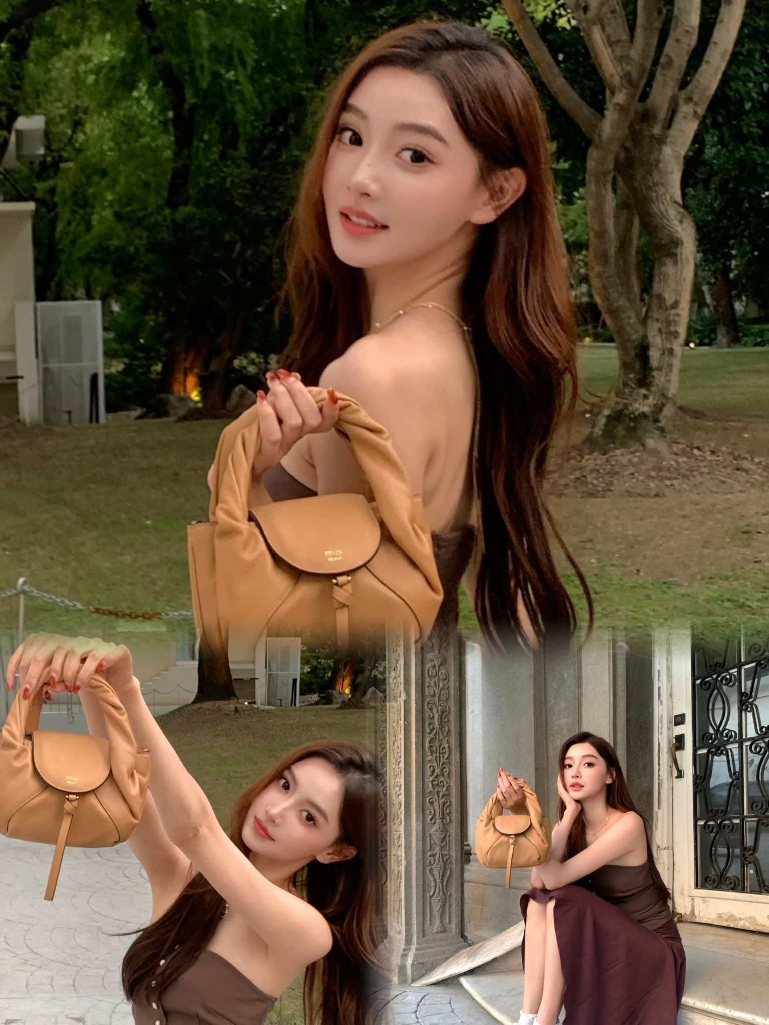 谁看了不说金佳悦这波穿搭是“人间富贵花”本人🌷 抹胸上衣+不规则半裙搭FENDI全套,轻奢慵懒的性感氛围感直接拉满! - 👕上衣:棕调紧身抹胸(贴身版型掐出沙漏腰,哑光质感高级又显贵) - 👗半裙:酒红不规则褶皱裙(垂坠感满分+斜裁设计,走路带风还显腿长) - 👜包包:FENDI驼色牛皮手提包(软乎乎皮质+金标细节,温柔贵气的点睛之笔) - 👟鞋子:FENDI Wave休闲鞋(华夫纹鞋身+低帮...