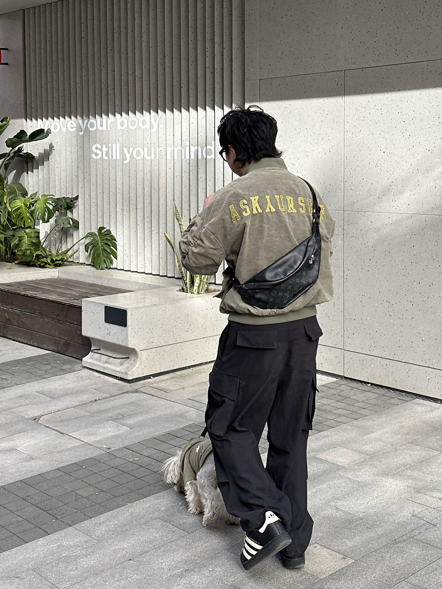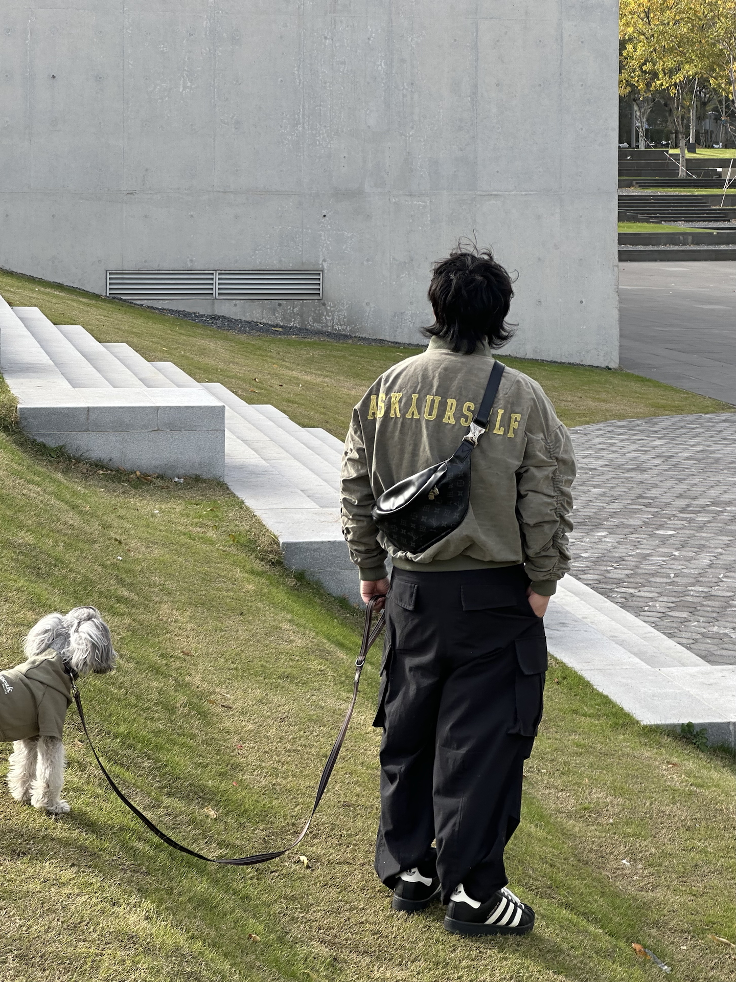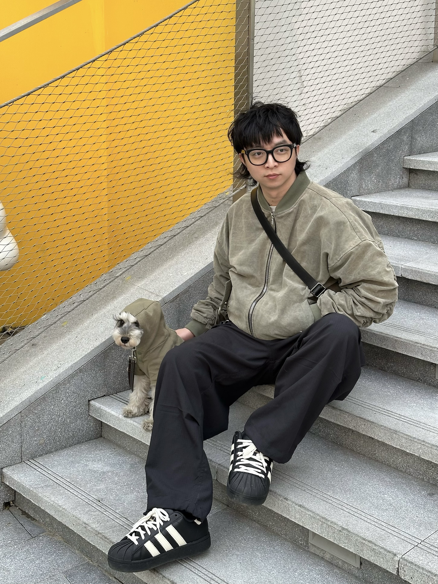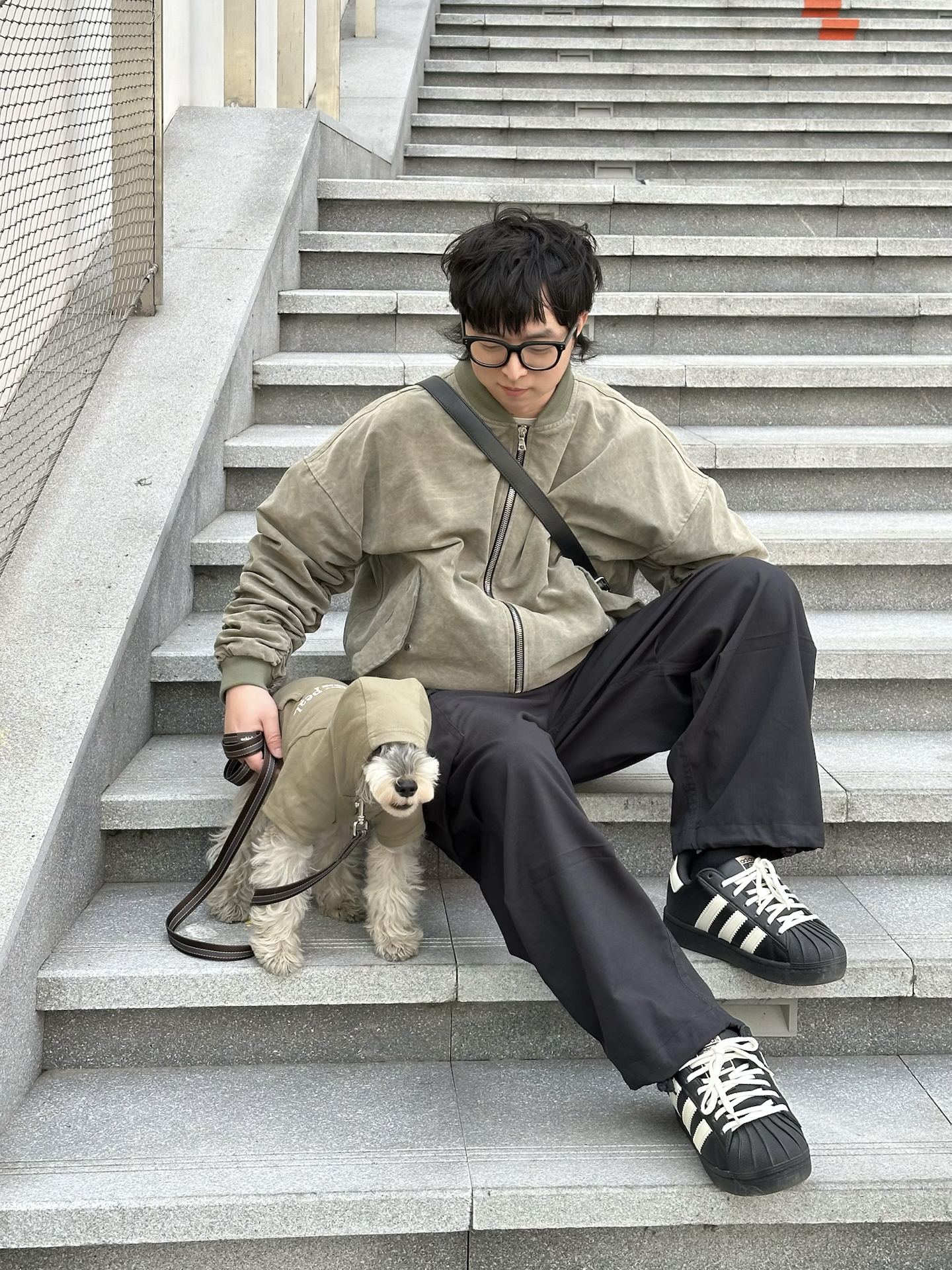 哈喽👋🏻大家好哇 这里是🪨石地夫的穿搭小日记📝 - 今天是带小狗citywalk日🐶 我的ootd: #Askyurself 短款MA1军绿夹克搭配 #beams 黑色工装裤 这么搭很有vibe而且真的巨显腿长☑️ 👟 #adidas originals x 菲董 胖丁版superstar 狗子的ootd: #snow peak 连帽卫衣🤣 - 有没有发现我俩穿的是同色系亲子装✌🏻 这...