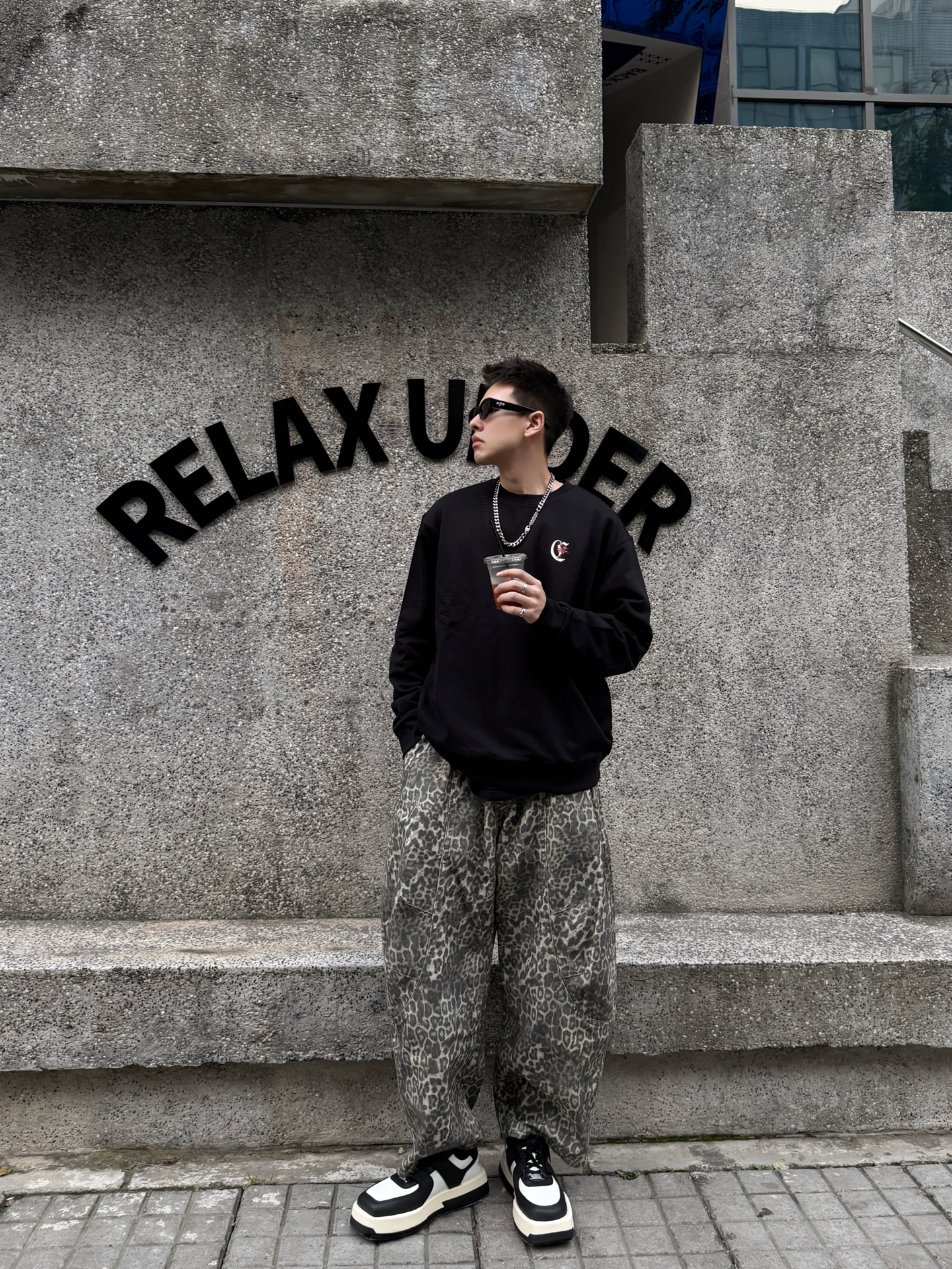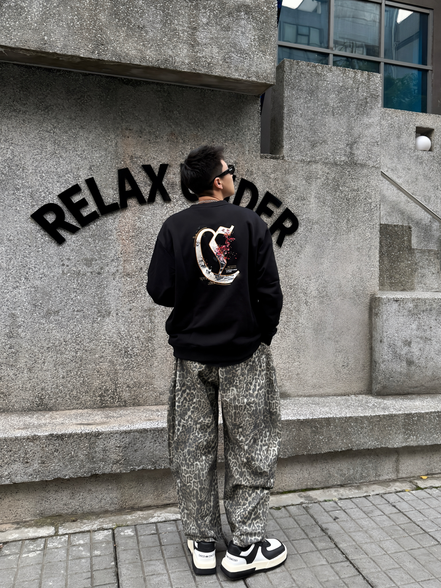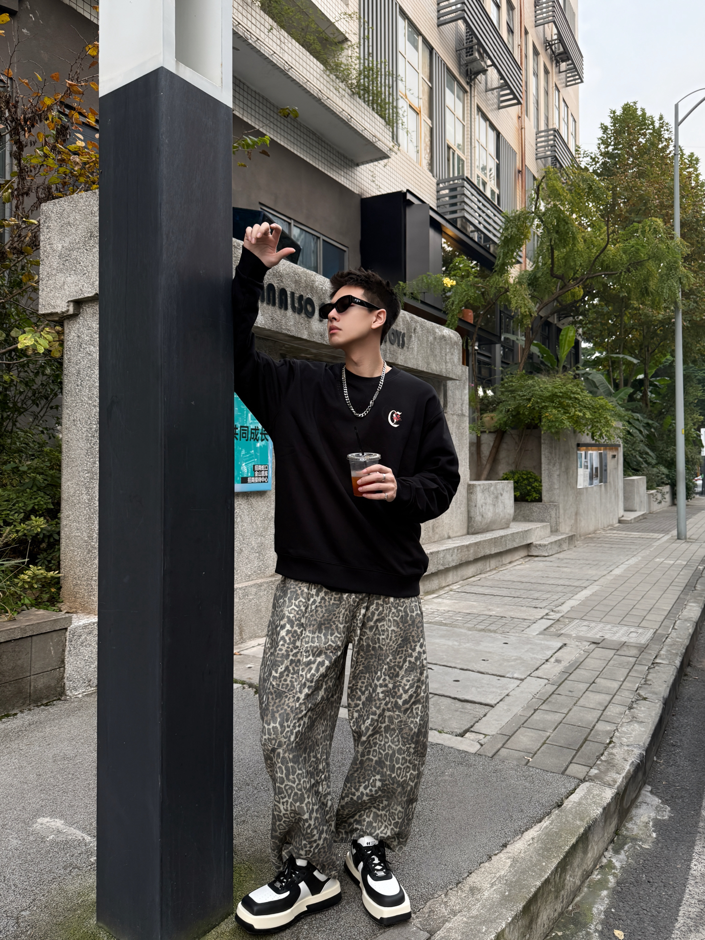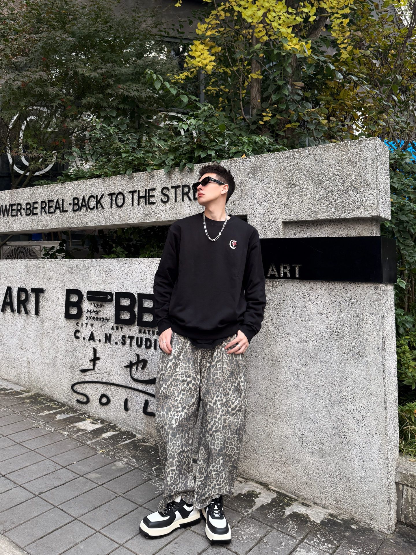 卡宾+豹纹裤+厚底鞋,这松弛感直接戳中潮男心巴 谁懂啊!卡宾黑卫衣+Climax Vision豹纹裤+Choco Concert厚底鞋,把街头慵懒焊在身上~ 卡宾卫衣软乎乎巨藏肉,后背大Logo暗戳戳秀细节;Climax Vision低饱和豹纹裤垂感拉满,复古还不浮夸;Choco Concert厚底鞋黑白撞色+软弹脚感,增高还能给整套搭出层次感。 男生穿这套,逛咖啡馆、压马路都适配,冷天里的...