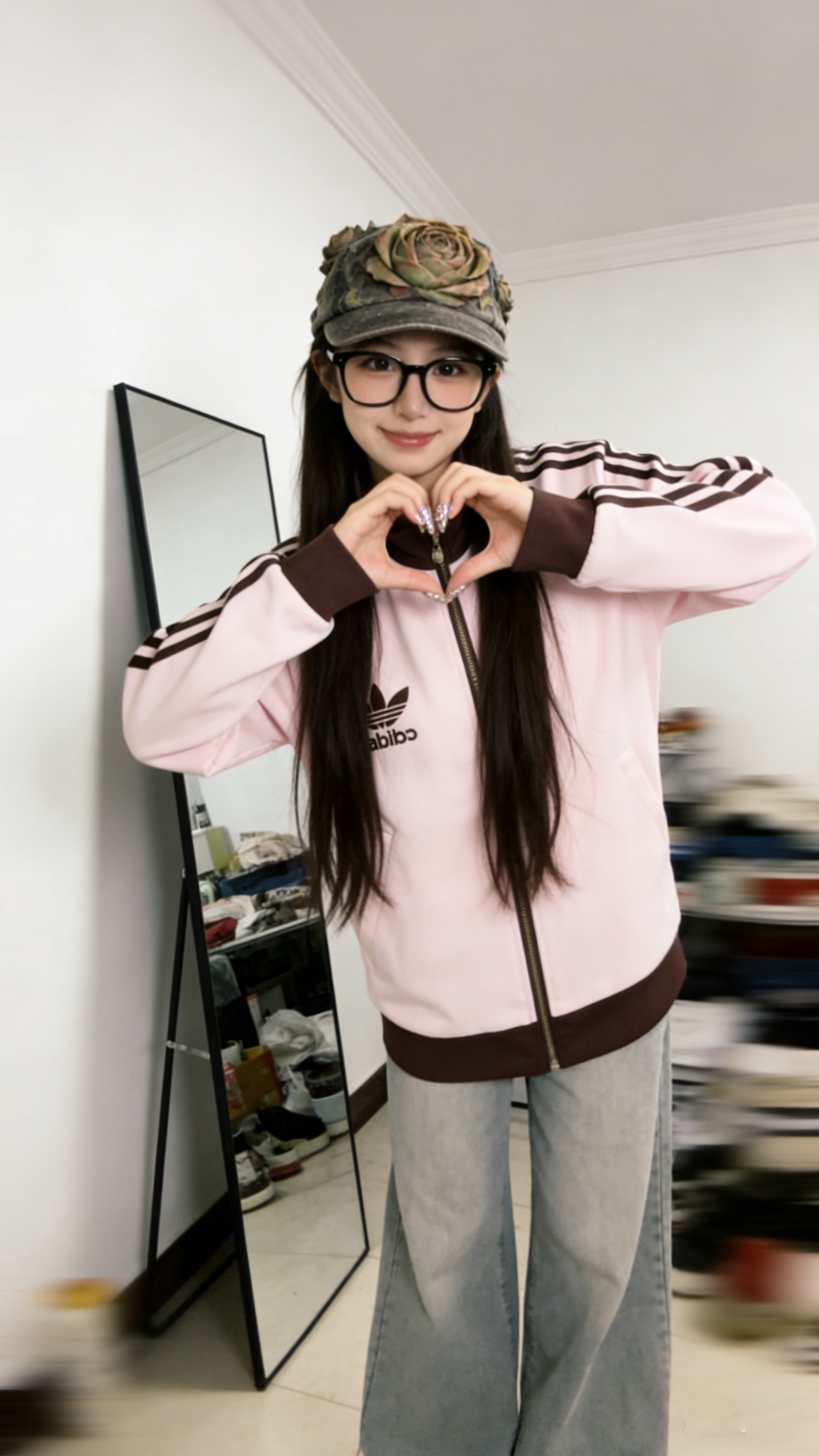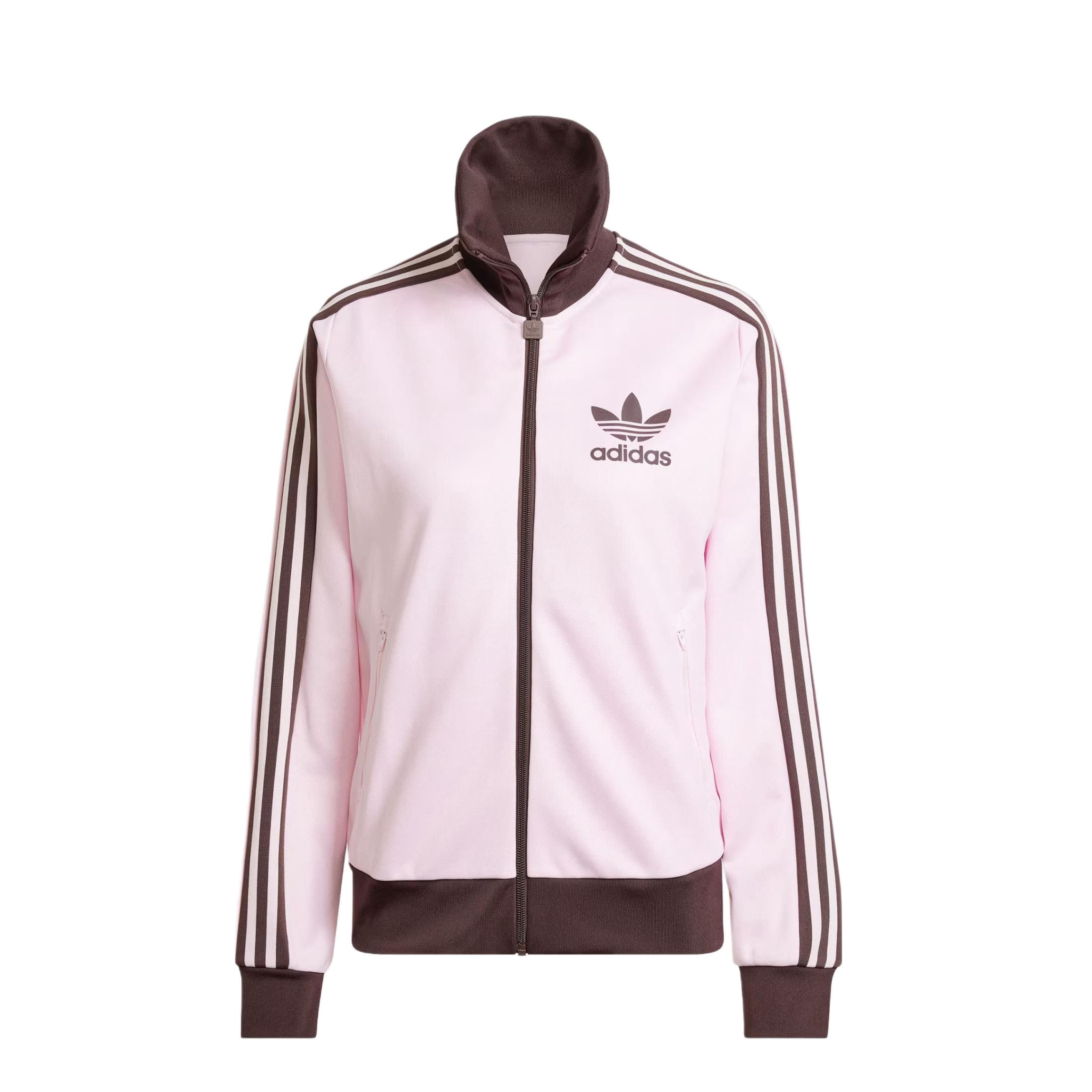 颜值质感:粉棕配色甜而不腻,复古棒球领+经典三条杠自带韩系松弛感,面料是软软的运动料,摸起来舒服还不容易皱,日常穿很省心。 • 适配度:短款版型刚好卡在腰线,搭阔腿裤、短裙都能显比例,不管是学生党上学还是通勤党上班,随手一套就能出门,属于“衣柜里缺不了的基础款”。 • 小细节:领口和下摆的撞色包边很精致,刺绣logo不廉价,拉链顺滑不卡壳,日常穿个一两年质感也能在线。