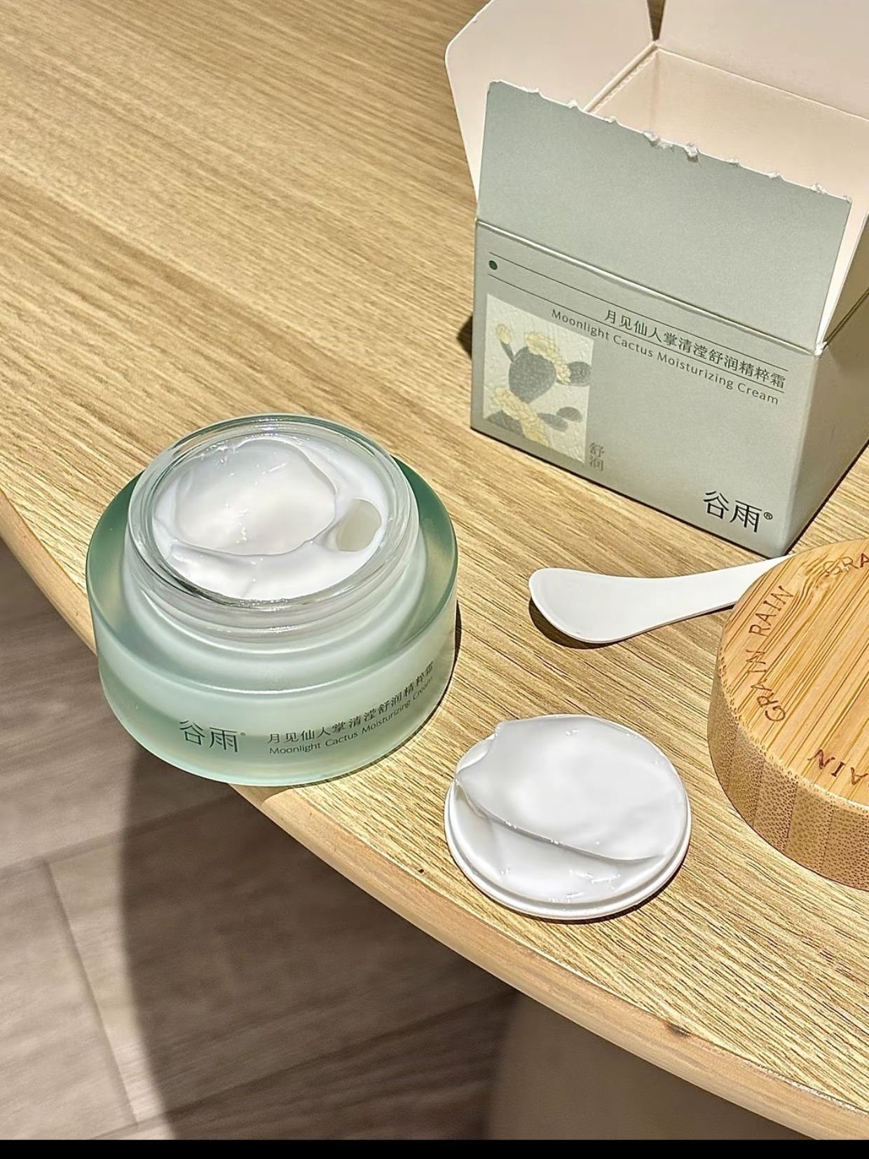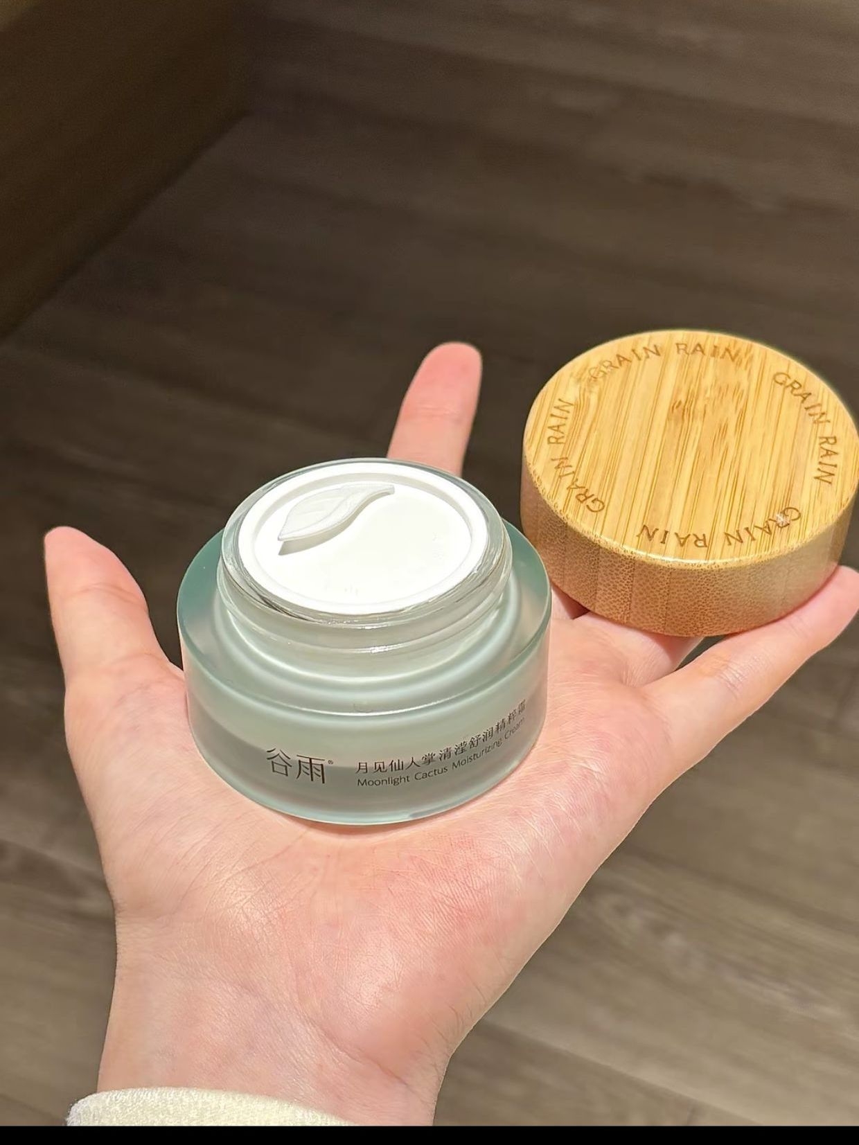 混干皮真的很挑面霜 太油不耐,太干皮又痒 最近在用谷雨这瓶仙人掌面霜! 是我买了好久一直没用的!🥲 最近换季需要给皮肤擦擦补水 所以搜罗出了这个!!! 质地是清透的乳霜感,上脸一抹就化水 感觉拍两下就被皮肤“喝”进去了.. 我睡前涂一层,早起T区也没泛油光 保湿力对于我这种干皮来说是很不错的!! 而且谷雨的包装我是真的喜欢