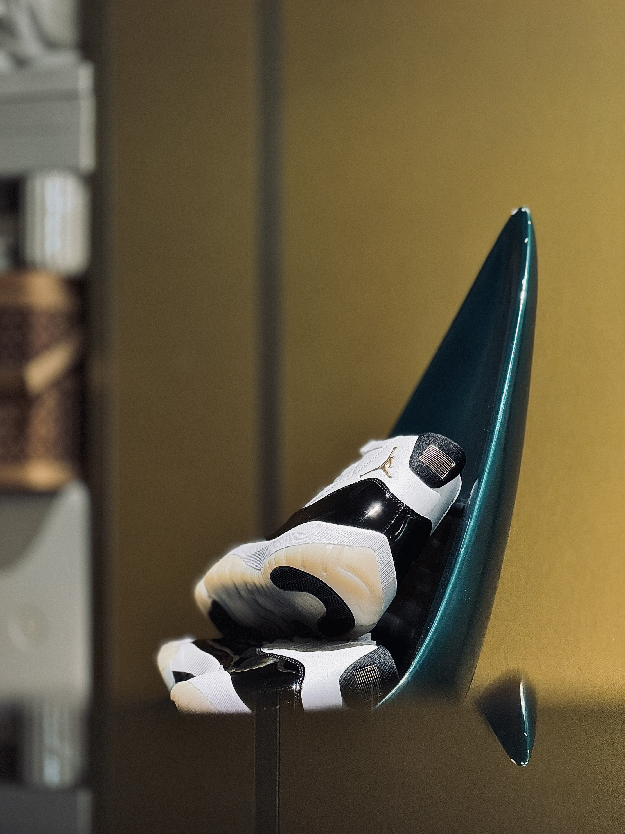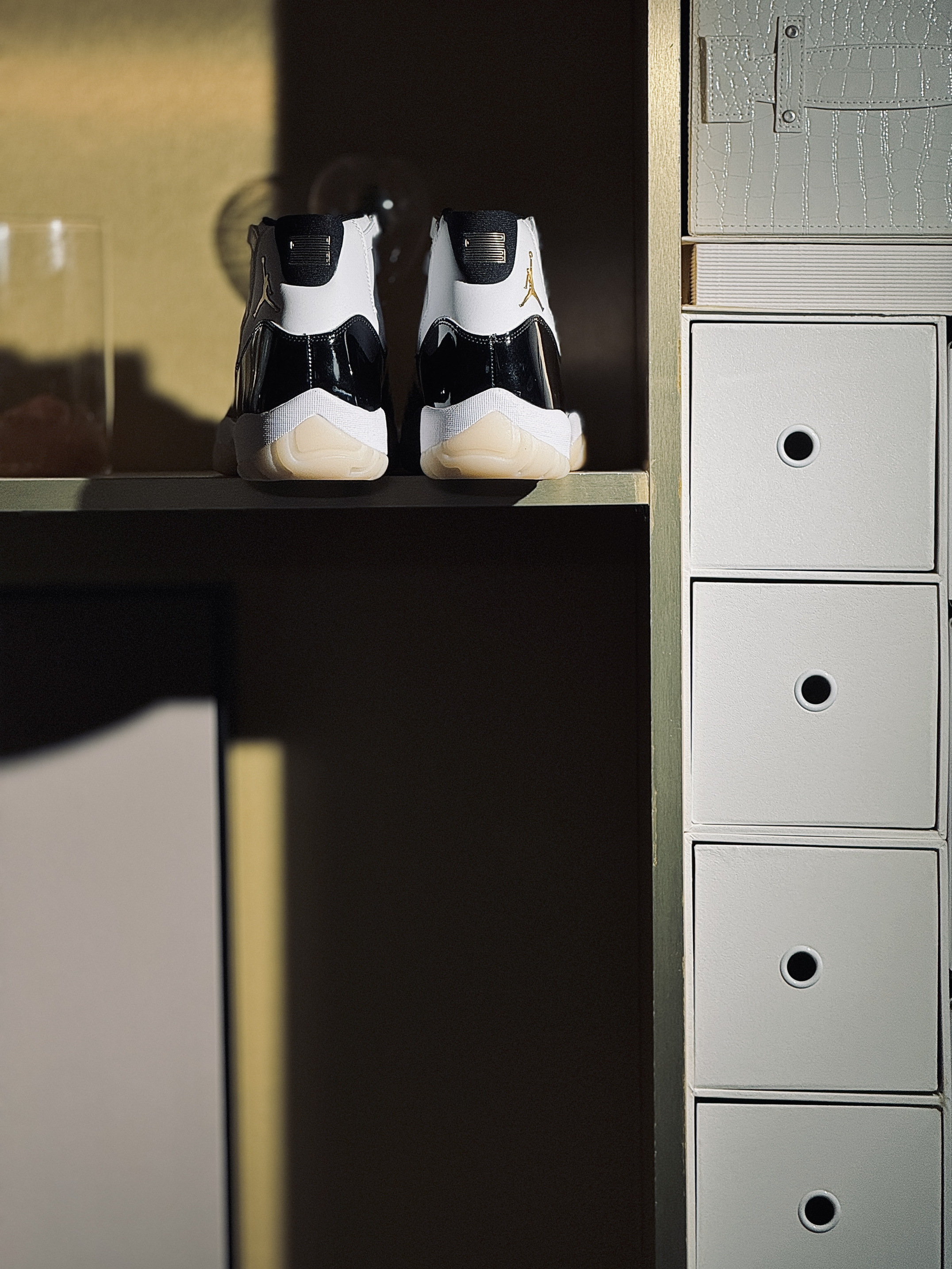 ·作为「乔帮主」个人最爱的签名战靴,Air Jordan11 一直通过各种方式彰显着自己的特别。这双被命名为”Gratitude”的AJ11,承袭了金砖套装 AJ11令人着迷的烫金元素。黑色漆皮与白色皮革碰撞出的高级感,加之流畅的完美轮廓,时至今日依旧是街头球鞋玩家最爱的上脚穿搭首选。当年 Tinker 第一次把实物拿给MJ看的时候,乔丹就感叹一定有人会穿它搭配燕尾服。