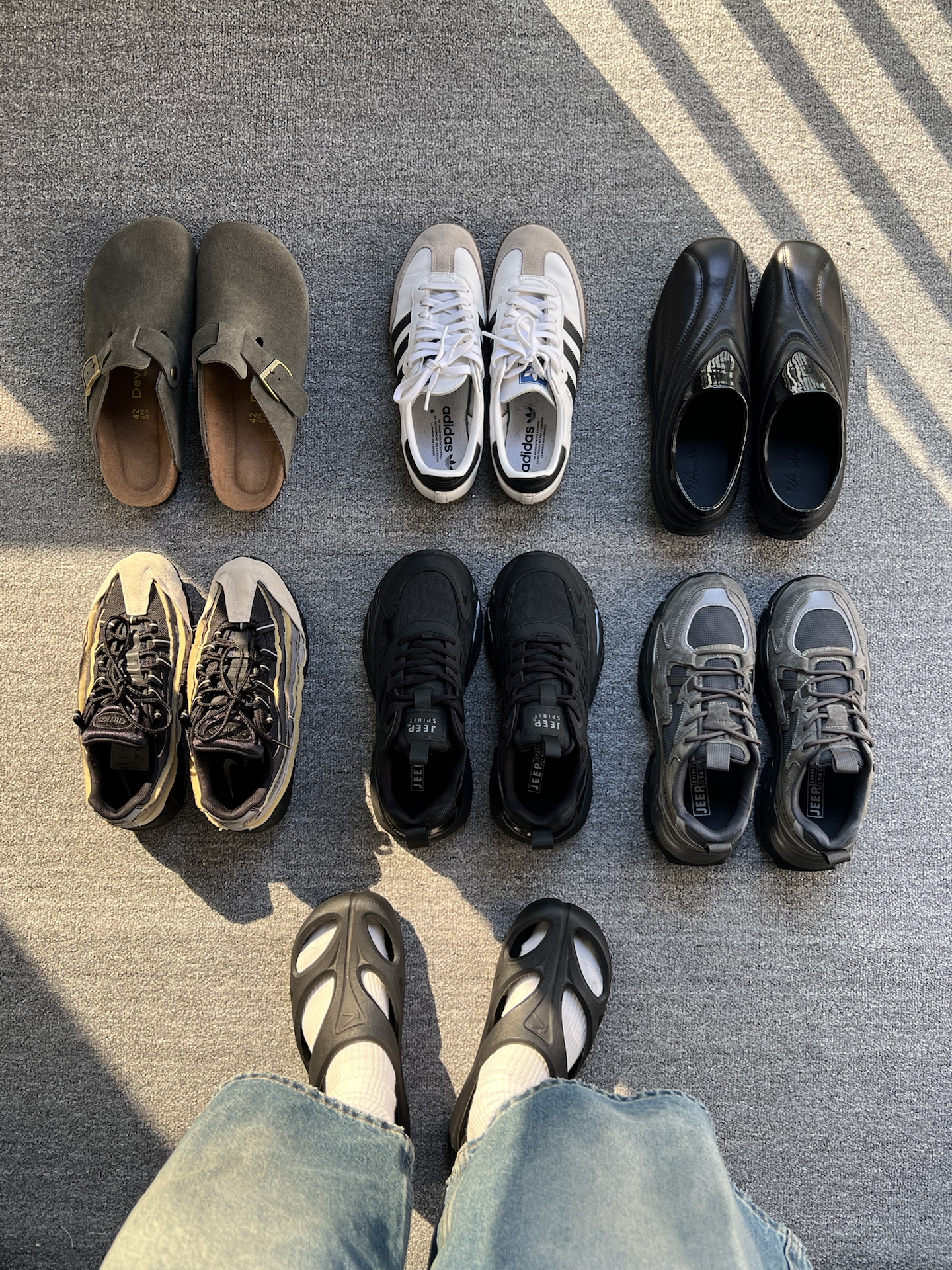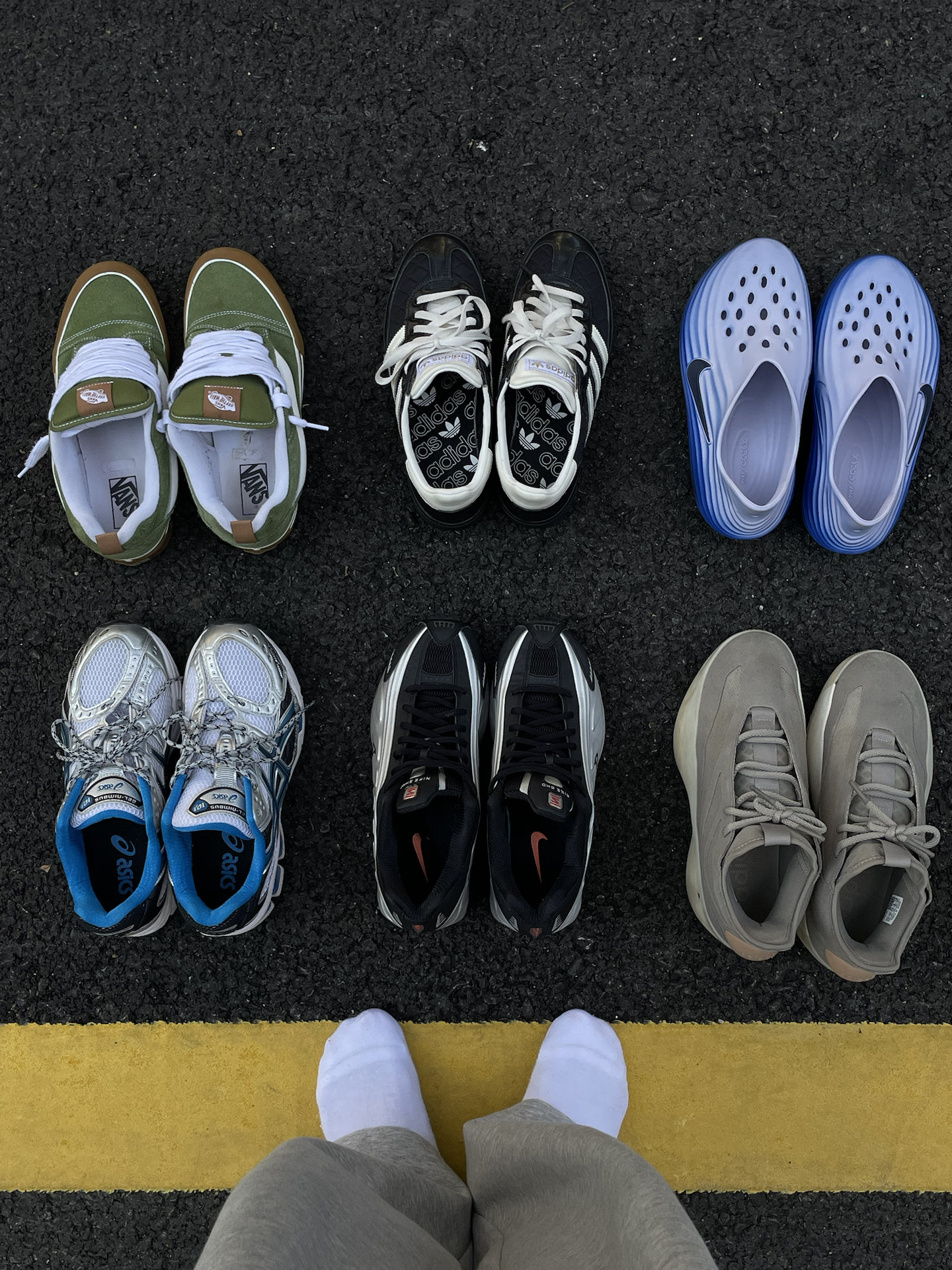 一周七天,你问我怎么只有六双鞋子? 那周天在家当然光脚! fog adidas:当初发售就开折,九百多入手,现在也是腰斩价格了,真的蛮香,极简设计特别帅,就是不太耐脏,脚感中规中矩 nike洞洞鞋:原价五百多入手,现在冬天也是打折出售了,建议买大一码更舒服,整体造型帅也舒服,下雨天就不要穿了哈哈哈哈因为鞋子会积水 shox:这可是出现在生物书上的鞋子!馋了好久也是半价入手了,后跟四条红色气柱...