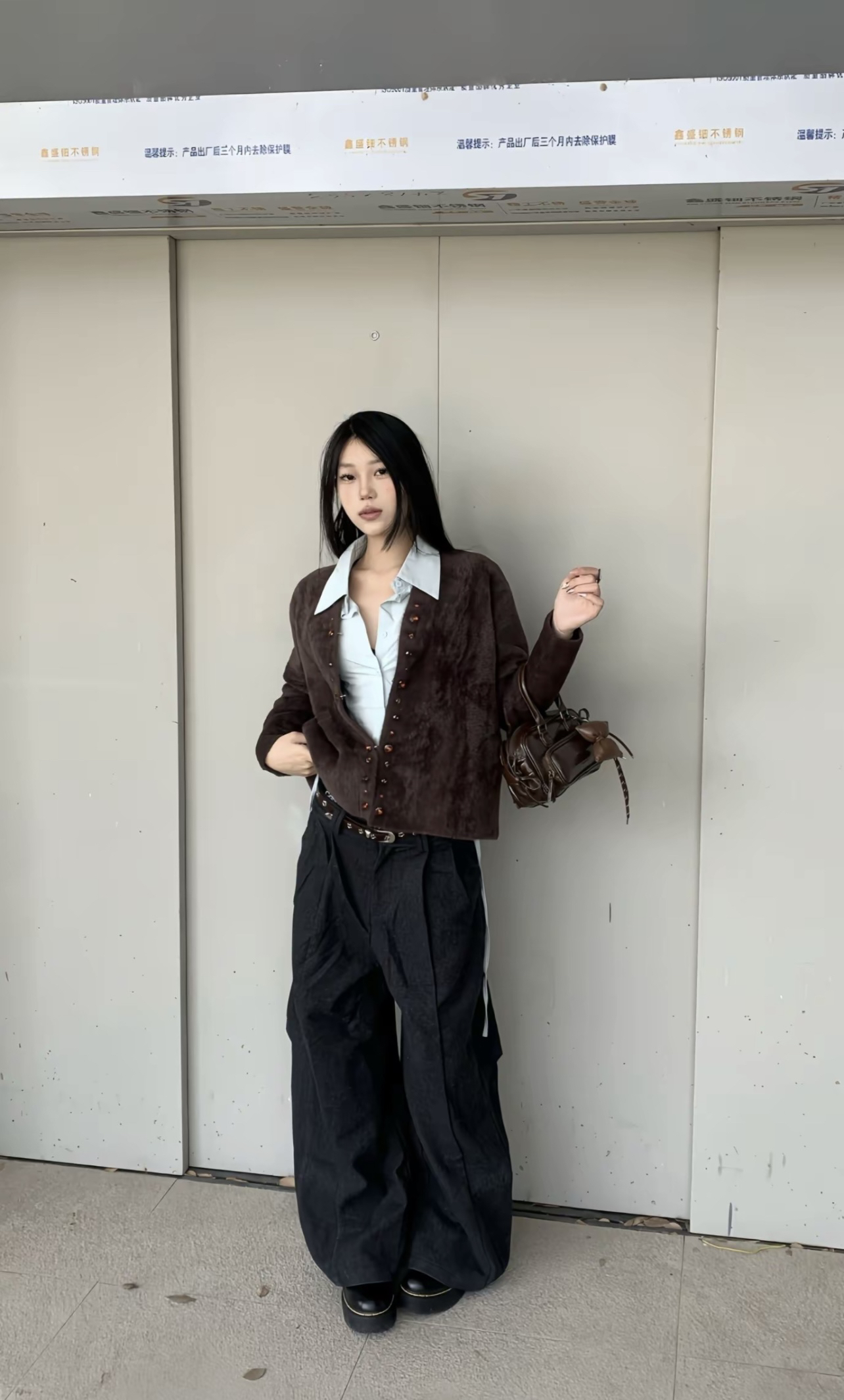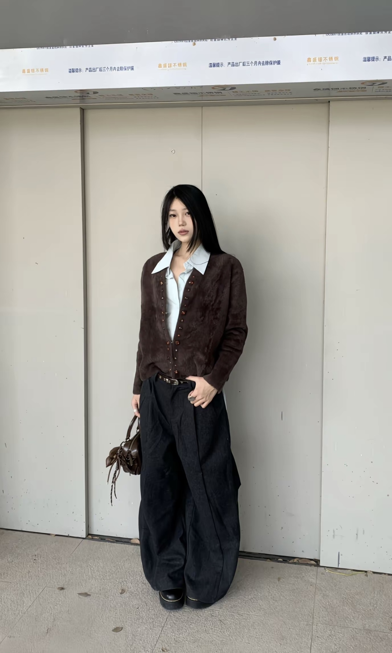秋冬的氛围感被这件棕调开衫狠狠拿捏住了✨ 软糯的毛绒质感贴身穿超舒服,V领设计搭配浅蓝衬衫叠穿,层次感直接拉满。复古琥珀扣是点睛之笔,和深棕底色呼应得恰到好处。下装搭炭灰阔腿裤,慵懒又随性,拎上同色系包包,整套look复古又高级,通勤出街穿都超有味道,妥妥的秋冬氛围感神器~