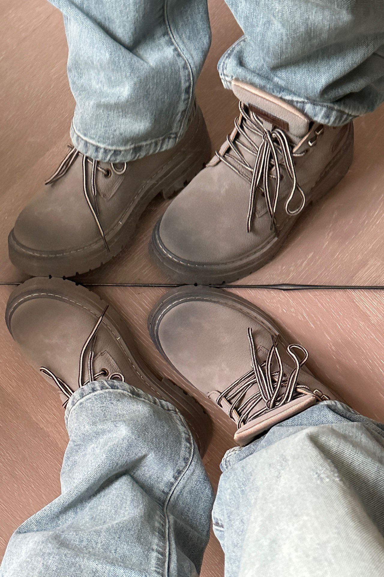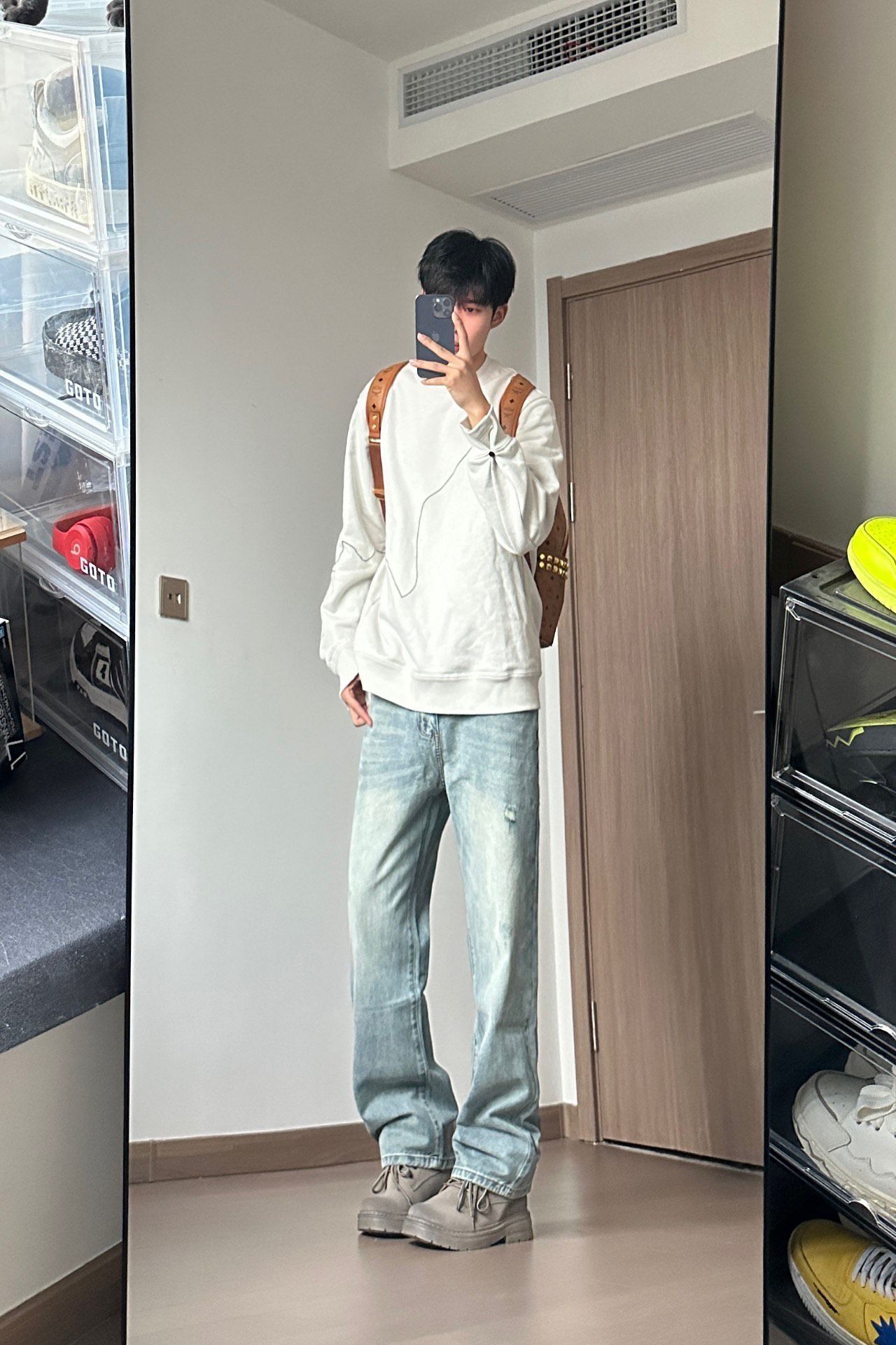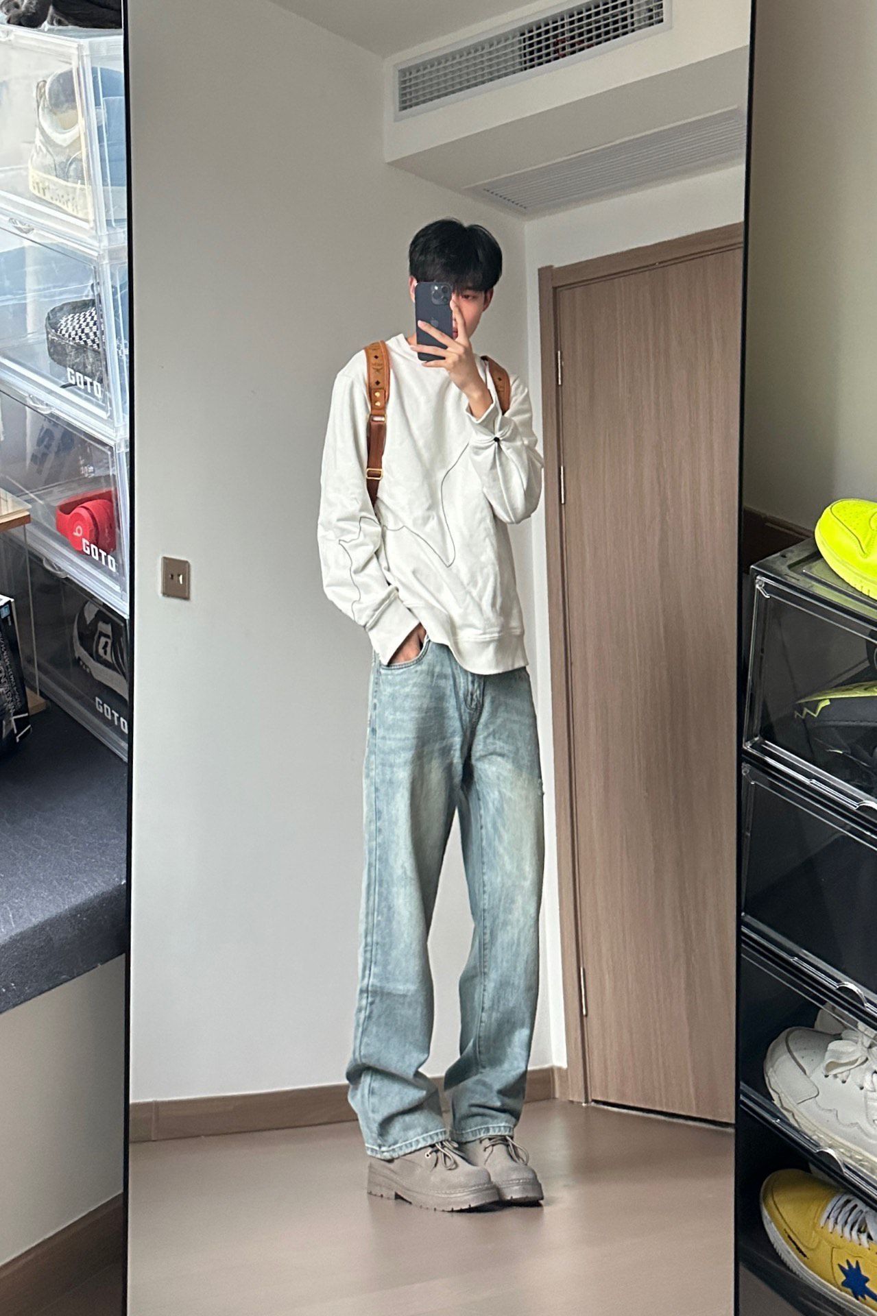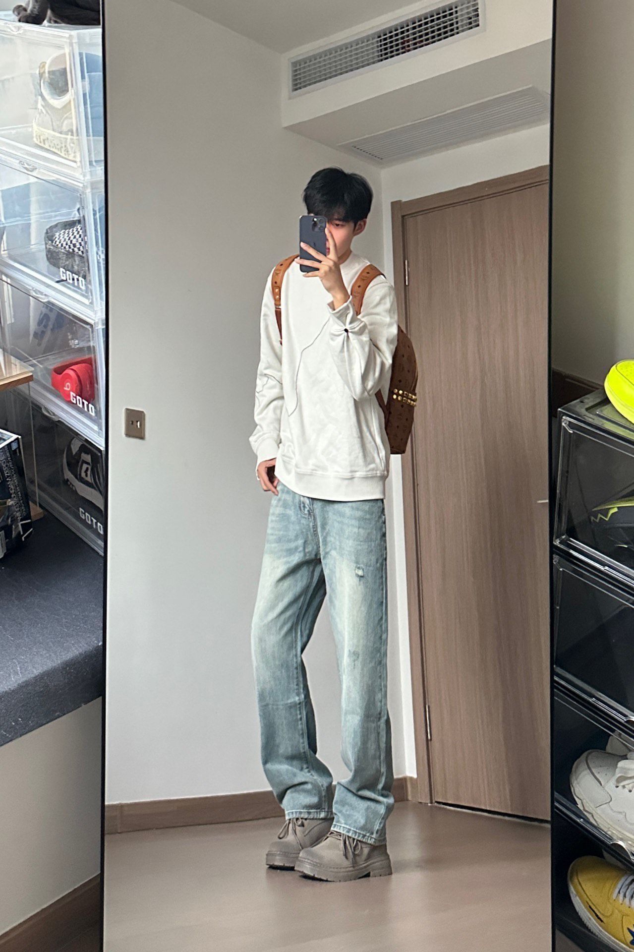这一套上身真的舒服又耐看!米白卫衣软乎乎的,版型宽松但不垮,配浅蓝阔腿牛仔刚好中和了拖沓感,脚踩这双做旧靴,又软又显腿长~背个小棕包出门,随便一搭都很有松弛的少年感,日常通勤或出门晃荡都适配,属于会回购的一套!
