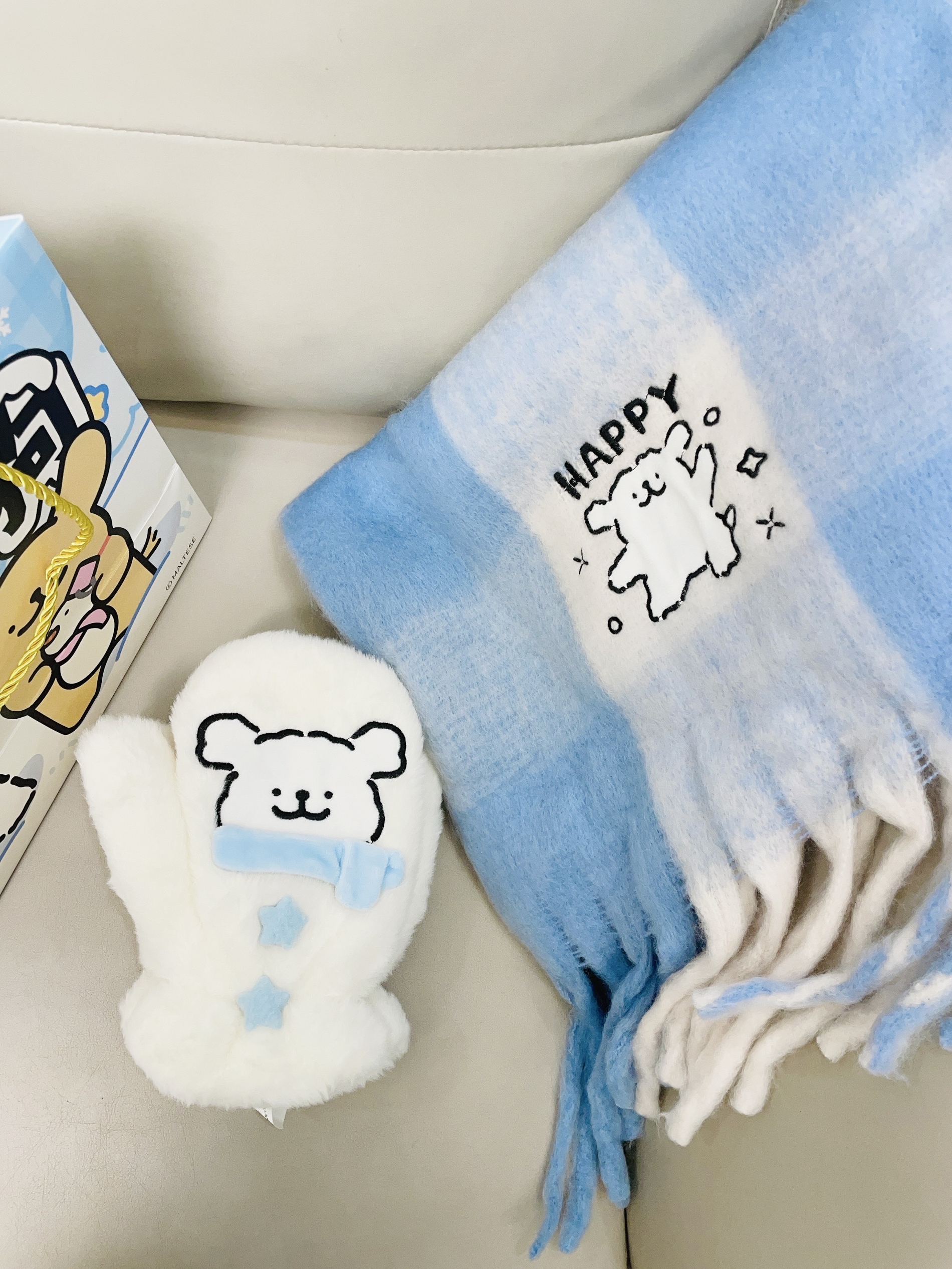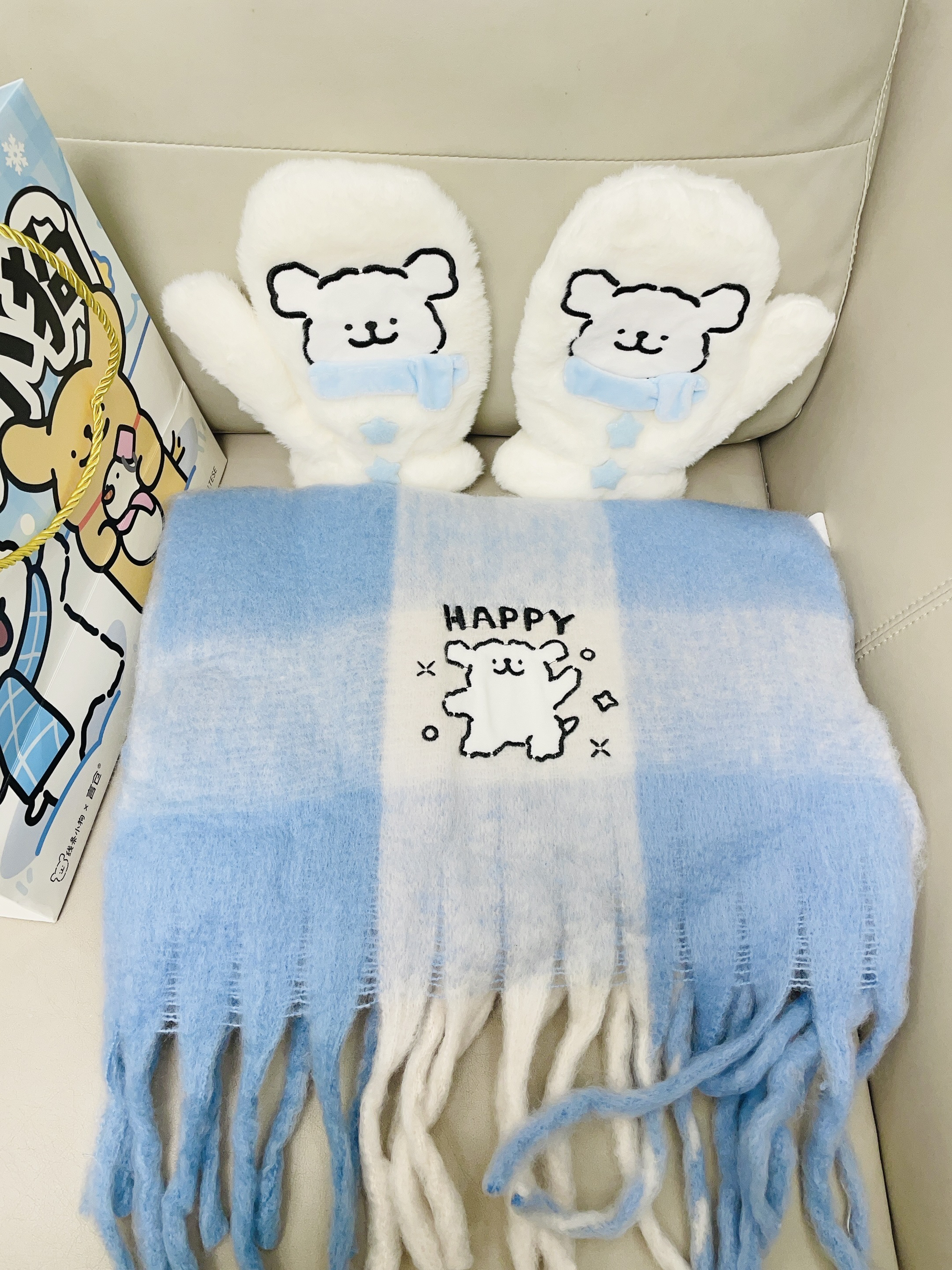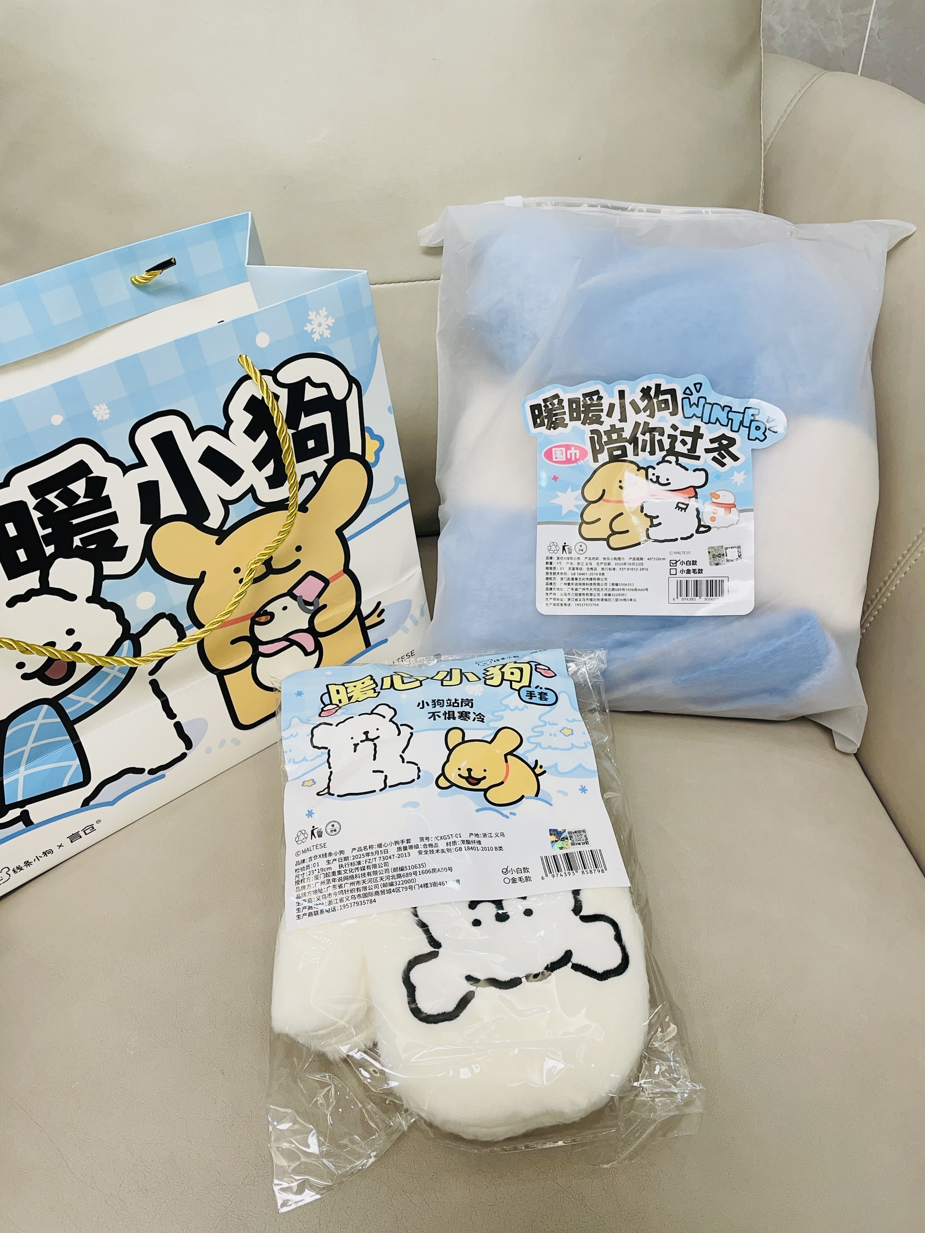 这不十二月啦天气比较冷 加上又是年末的时候 我给自己安排了新的围巾 手套 言仓×线条小狗联名的这款围巾 手套可可爱爱的 蓝色小清新 摸着柔软舒适 细节做的可以蛮好的 我带着好暖和 下雪都不怕冻 包装精致 用来送礼都可