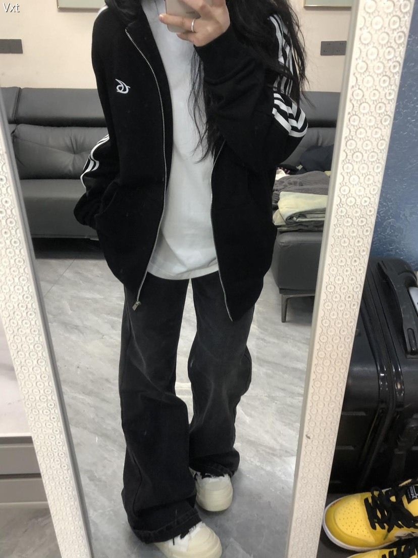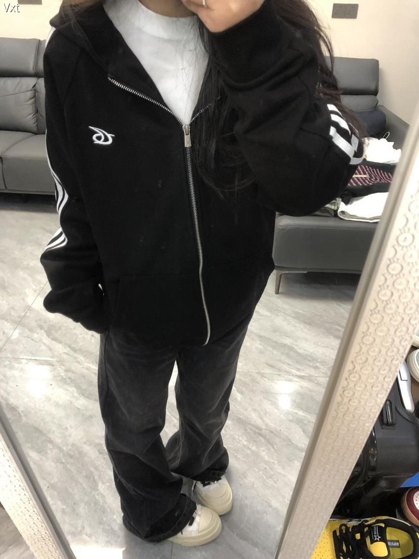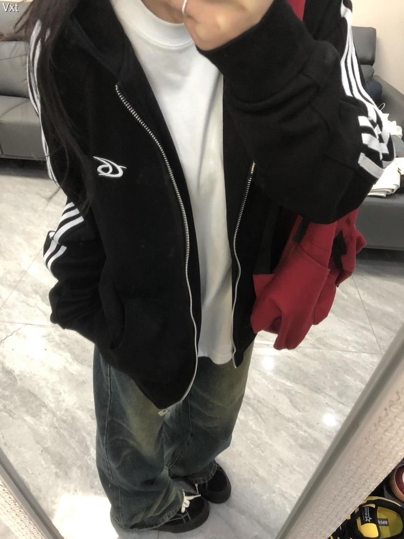 这件黑系拉链外套直接戳中穿搭心巴!经典黑+肩臂白条纹,自带美式复古松弛感,胸前小标低调又有辨识度。版型是超遮肉的宽松款,搭白T+阔腿裤,慵懒随性还显瘦,日常出街、上学通勤都能穿。软乎乎的面料舒服到不想脱,百元价位穿出千元质感,早八人闭眼入的百搭神装!