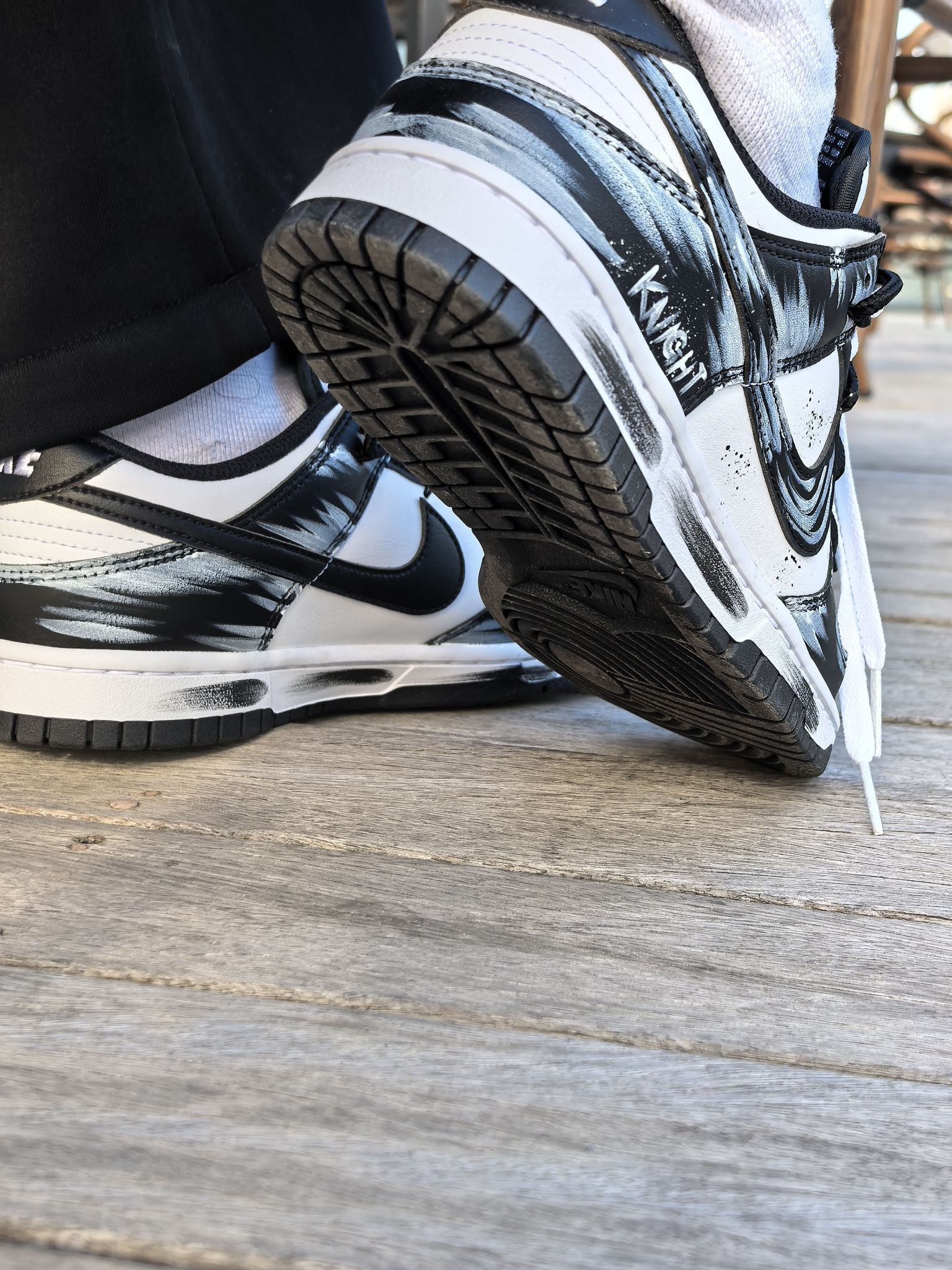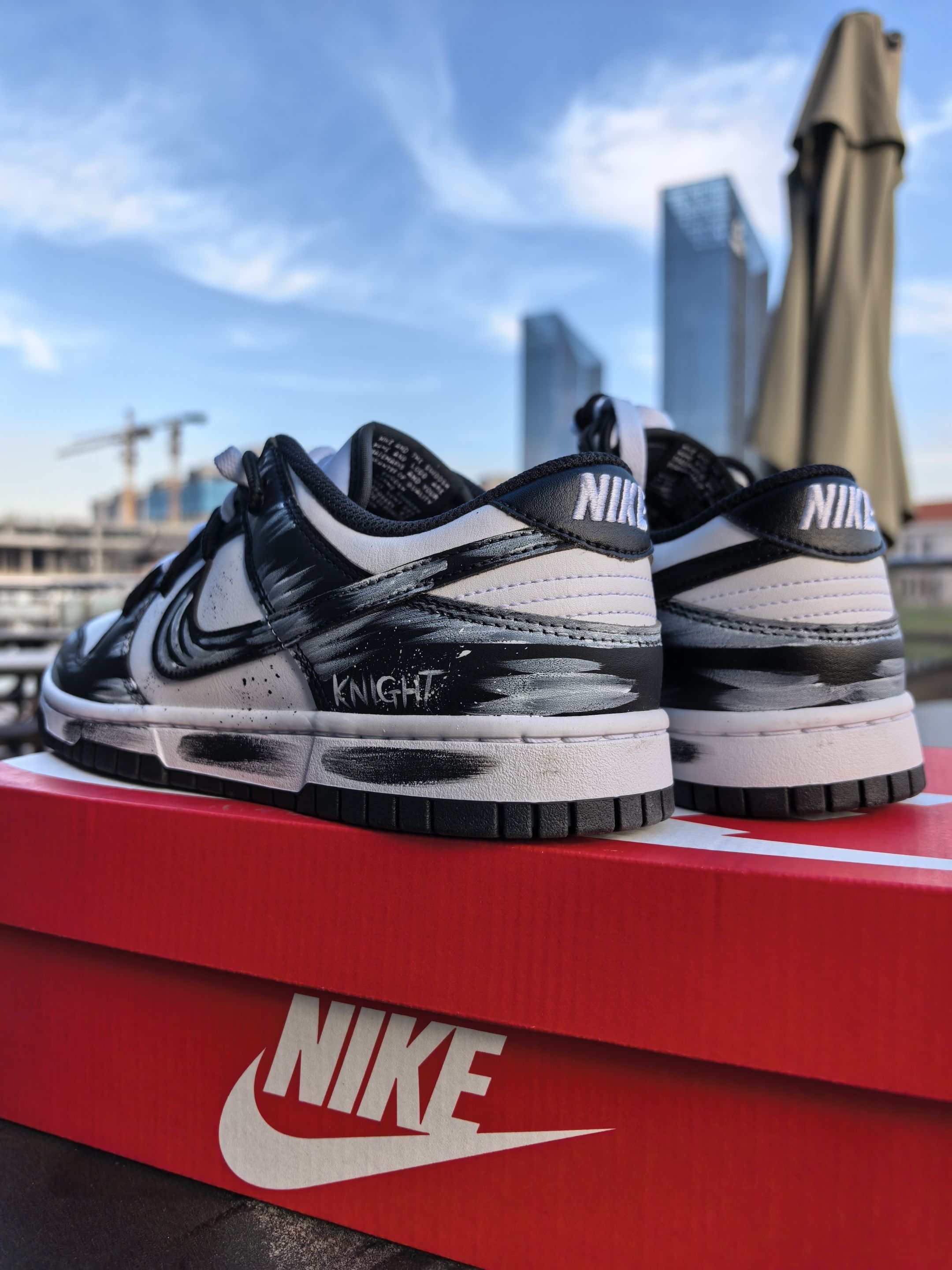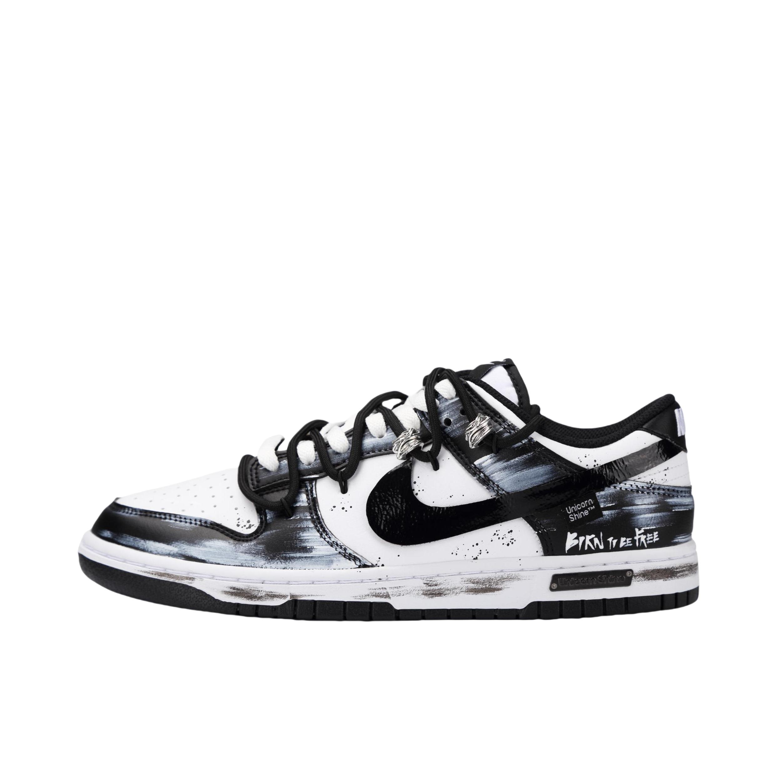 来给大家看看今天刚拆的这双Dunk,黑白配色但玩出了新的花样,鞋身的墨色晕染像随手泼的颜料,带点随性的艺术感。细节里还有KNIGHT的小字点缀,低调又有记忆点。 上脚踩了踩,脚感比我想象了不少,细心裹脚,但不挤脚,走了几步也没磨后跟,还挺舒服的。搭牛仔裤试一试,是那种看着简单,但细看又有东西的感觉。你们觉得这款泼墨款搭配卫衣会不会也很好看呢?