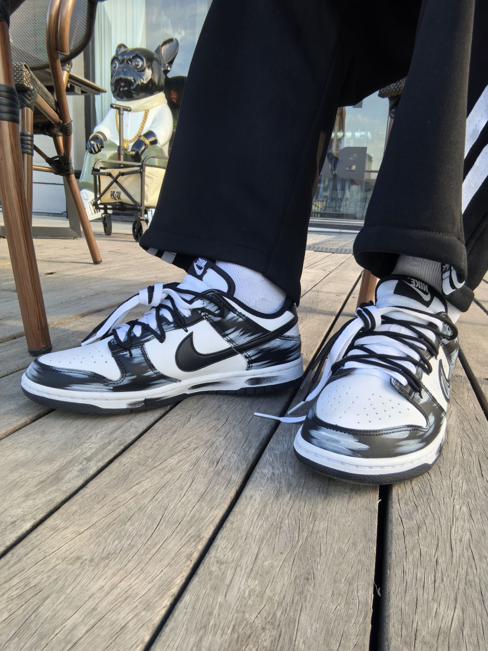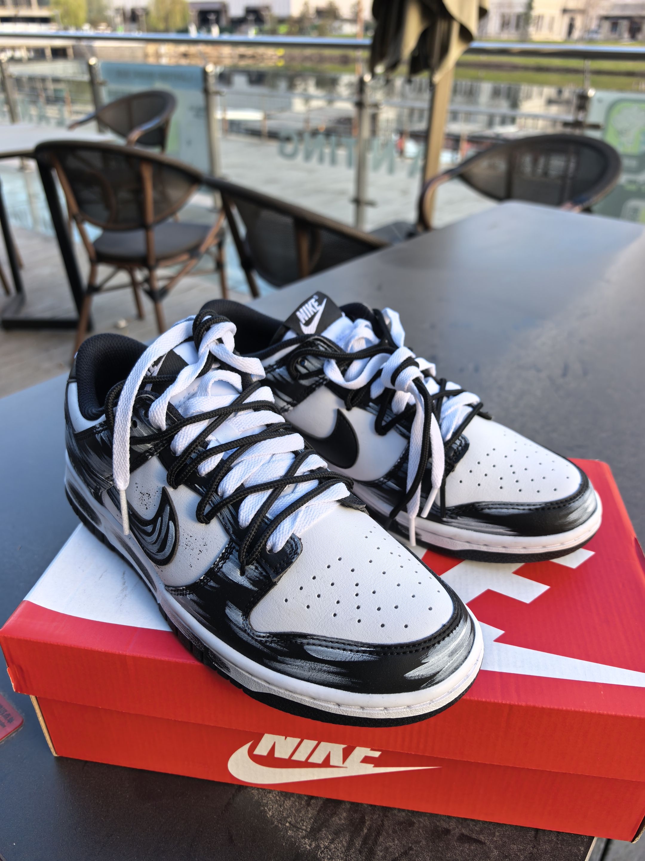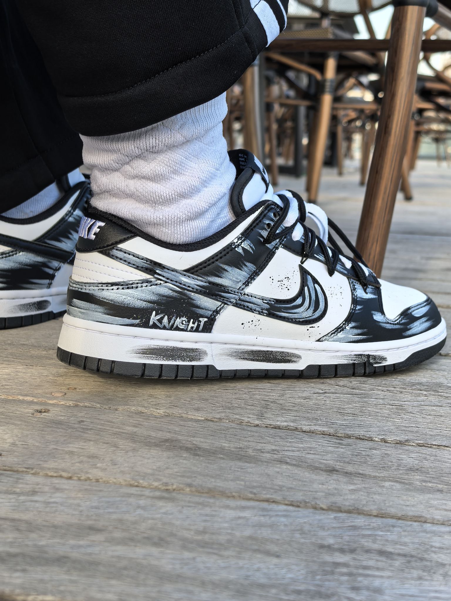 来给大家看看今天刚拆的这双Dunk,黑白配色但玩出了新的花样,鞋身的墨色晕染像随手泼的颜料,带点随性的艺术感。细节里还有KNIGHT的小字点缀,低调又有记忆点。 上脚踩了踩,脚感比我想象了不少,细心裹脚,但不挤脚,走了几步也没磨后跟,还挺舒服的。搭牛仔裤试一试,是那种看着简单,但细看又有东西的感觉。你们觉得这款泼墨款搭配卫衣会不会也很好看呢?