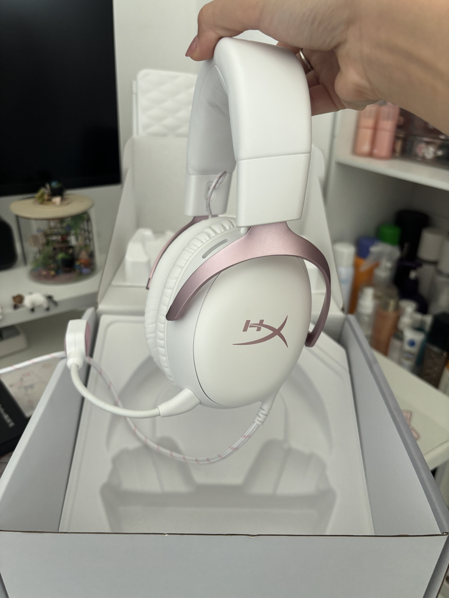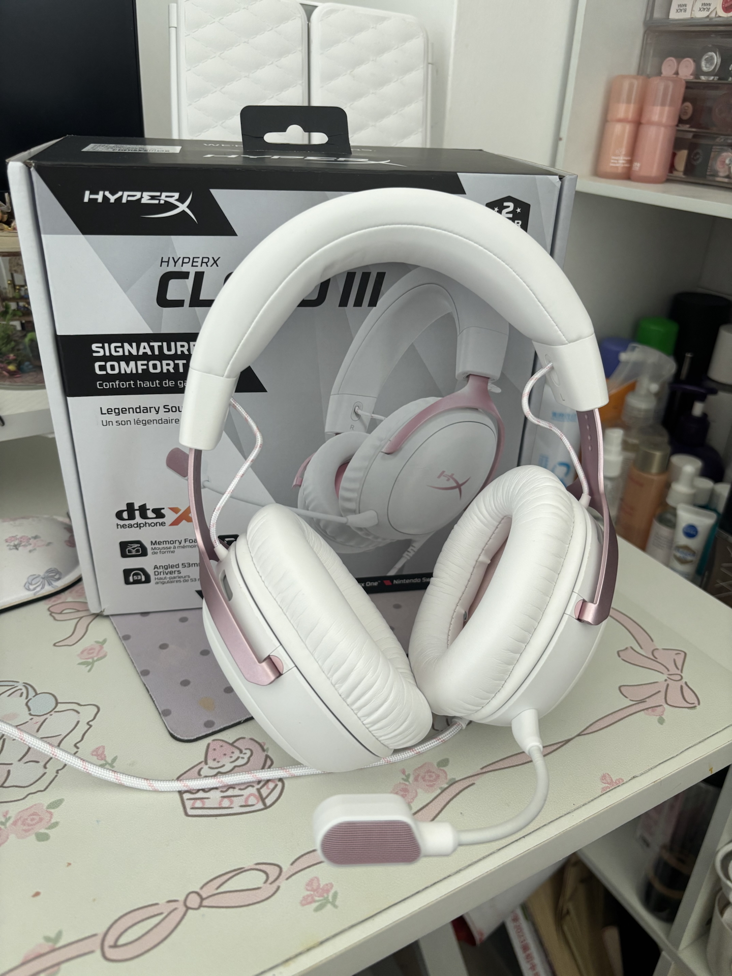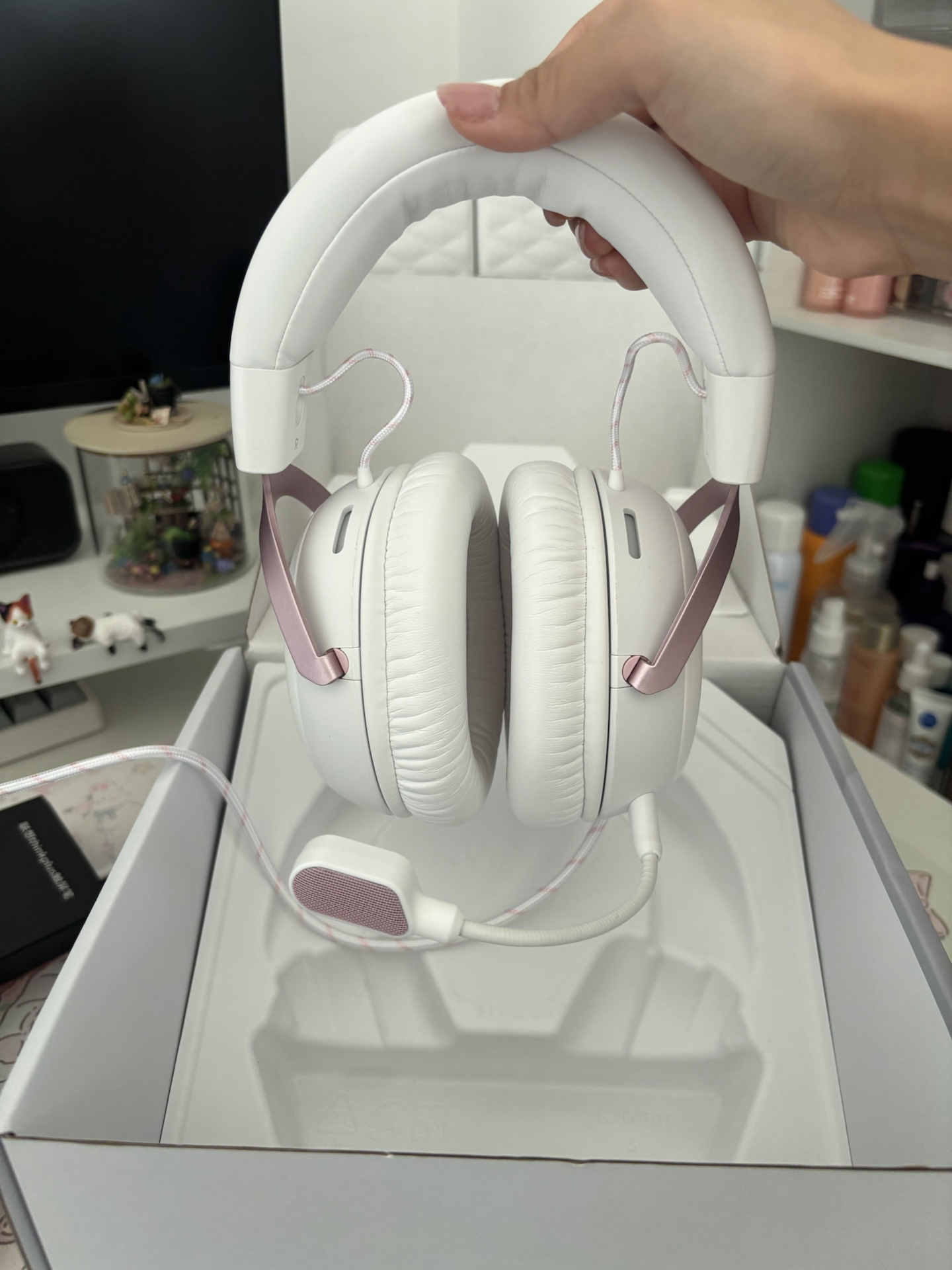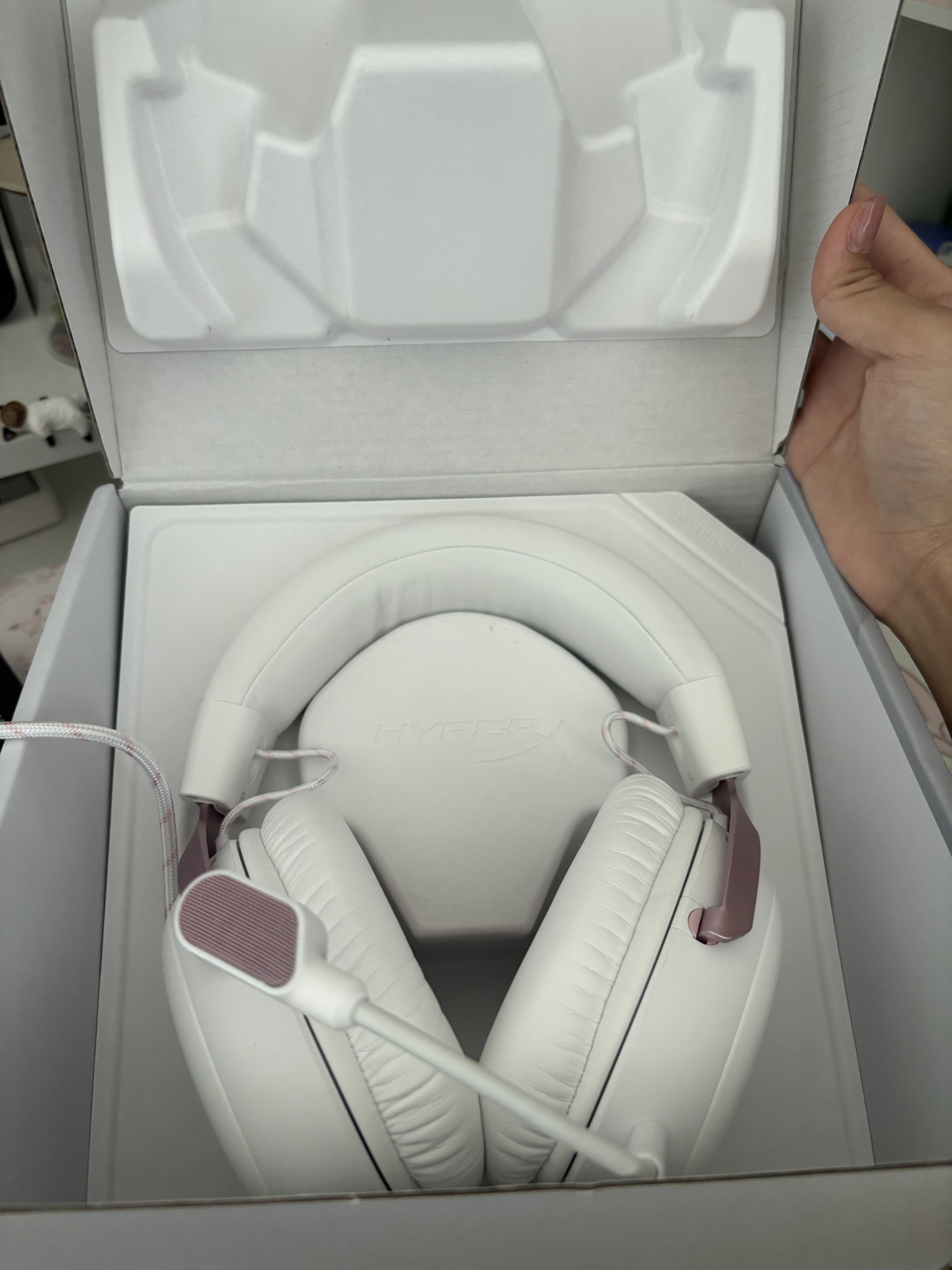 入手这款HyperX Cloud II| 耳机有一段时间了,从外观来说,白粉色的搭配很戳我,颜值在线,放在桌面很亮眼。 佩戴感上,它的耳罩挺柔软的,长时间戴着打游戏或者看剧,耳朵不会觉得很闷很痛,这点很加分。 音质方面,听歌的时候细节挺丰富的,打游戏时脚步声、枪声的方位感也很清晰,能帮我在游戏里更快反应。麦克风的拾音效果也不错,和队友开黑交流很顺畅,不会有那种嘈杂的电流声。 不过它是有线的,可能在...