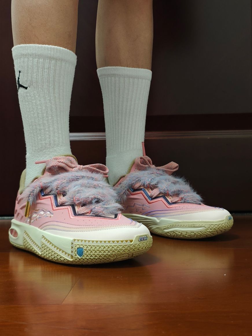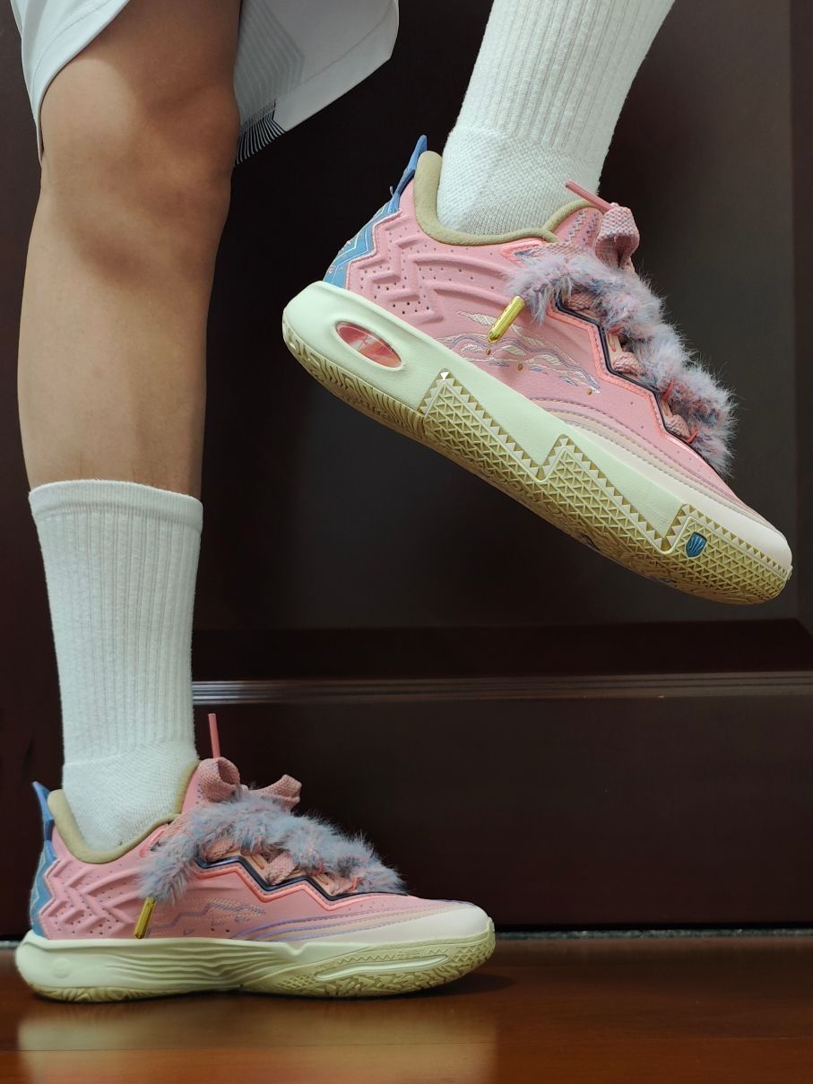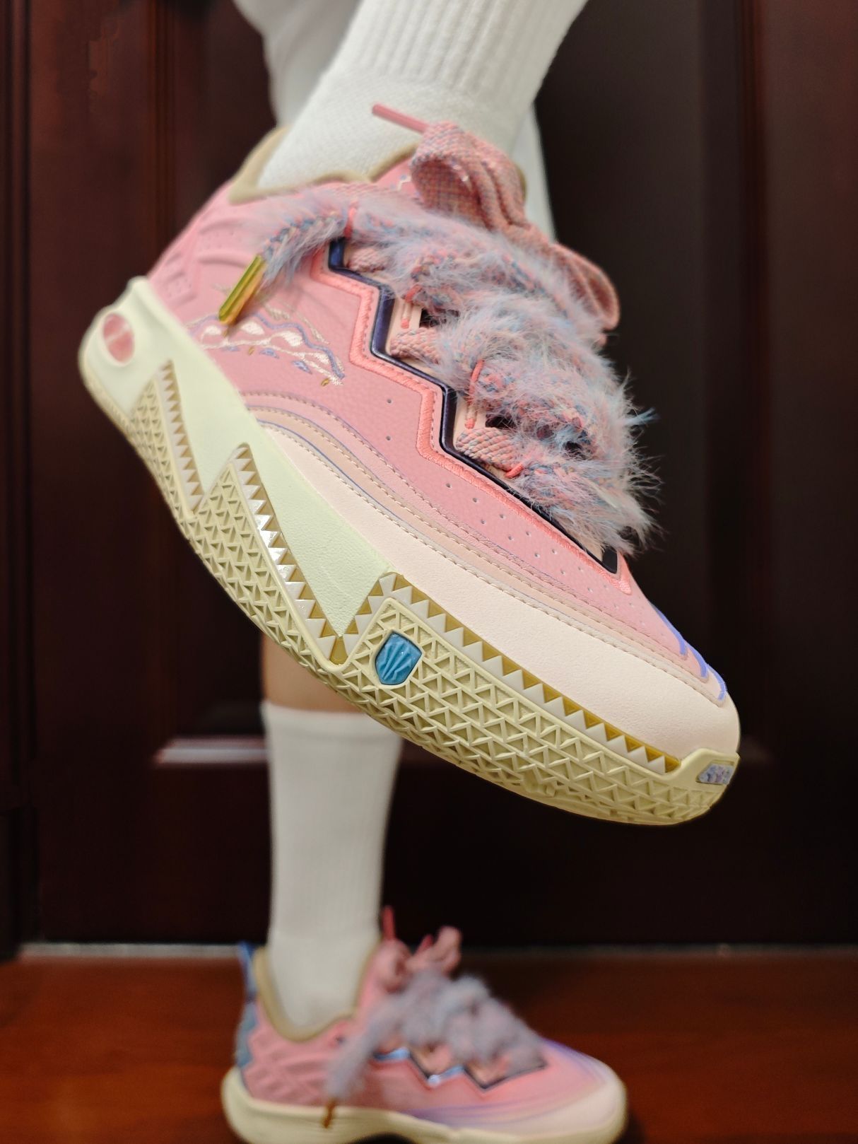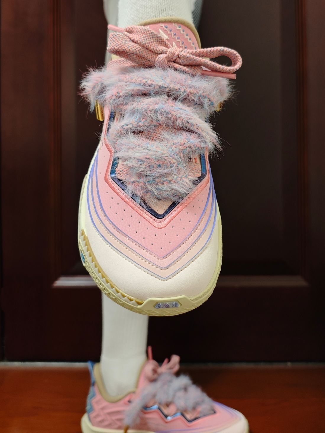 配色粉嫩,上脚也是毛绒绒, 实际却是球场利器、变向狂魔, 妥妥的“金刚芭比”。