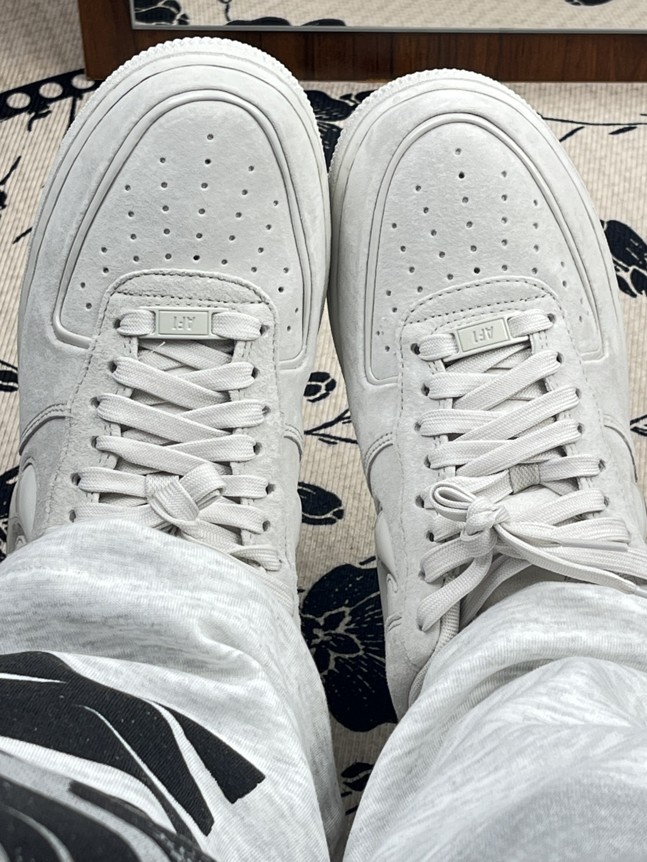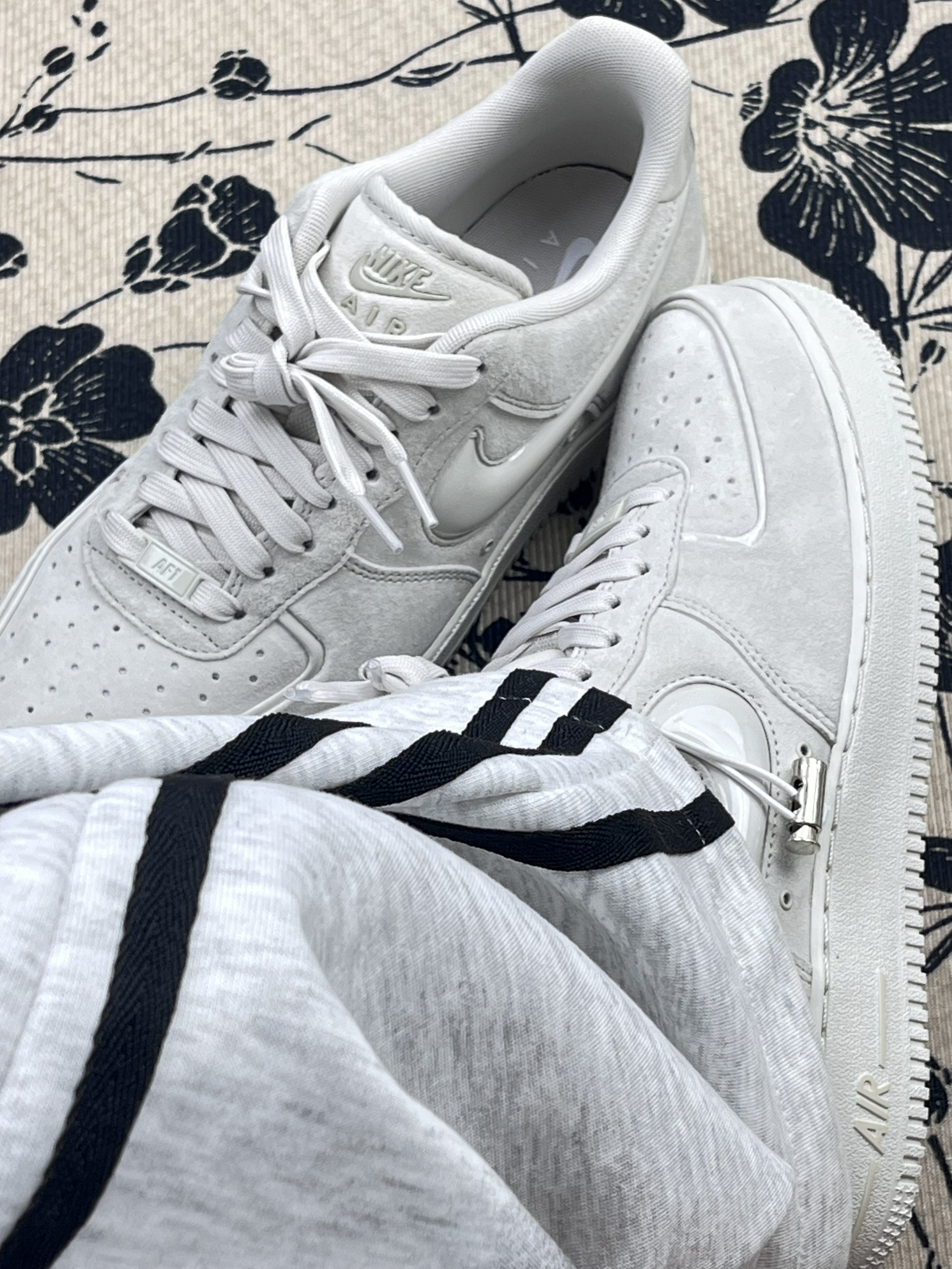 上脚比普通AF1软一丢,鞋型偏窄,鞋舌和后跟的亮面材质是加分项,不会像全麂皮那么闷,比较有设计感,特别好搭衣服。但比一般材质鞋面难打理,浅灰色倒是比白色耐脏,个人而言,很喜欢这种干干净净穿搭简单但不失少年活力感的鞋子👟