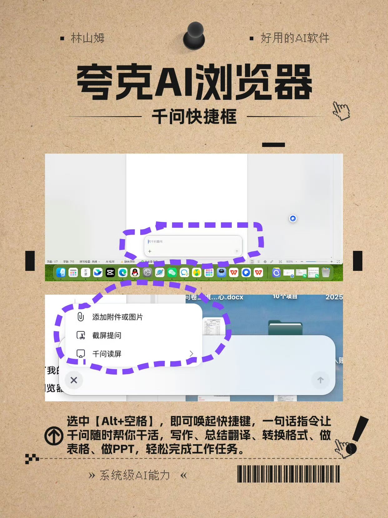 选中【Alt+空格】,即可唤起快捷键,一句话指令让千问随时帮你干活,写作、总结翻译、转换格式、做表格、做PPT,轻松完成工作任务。