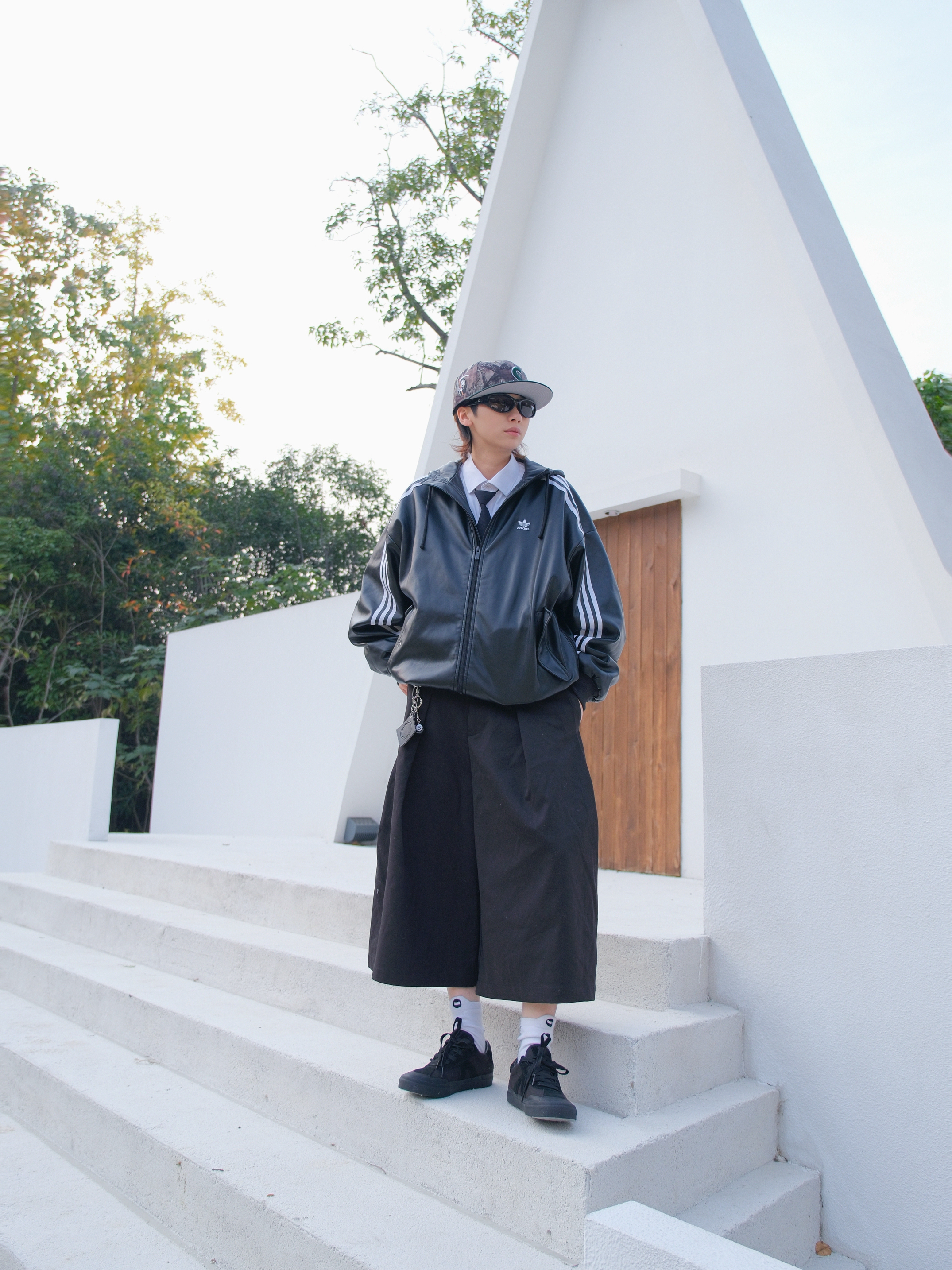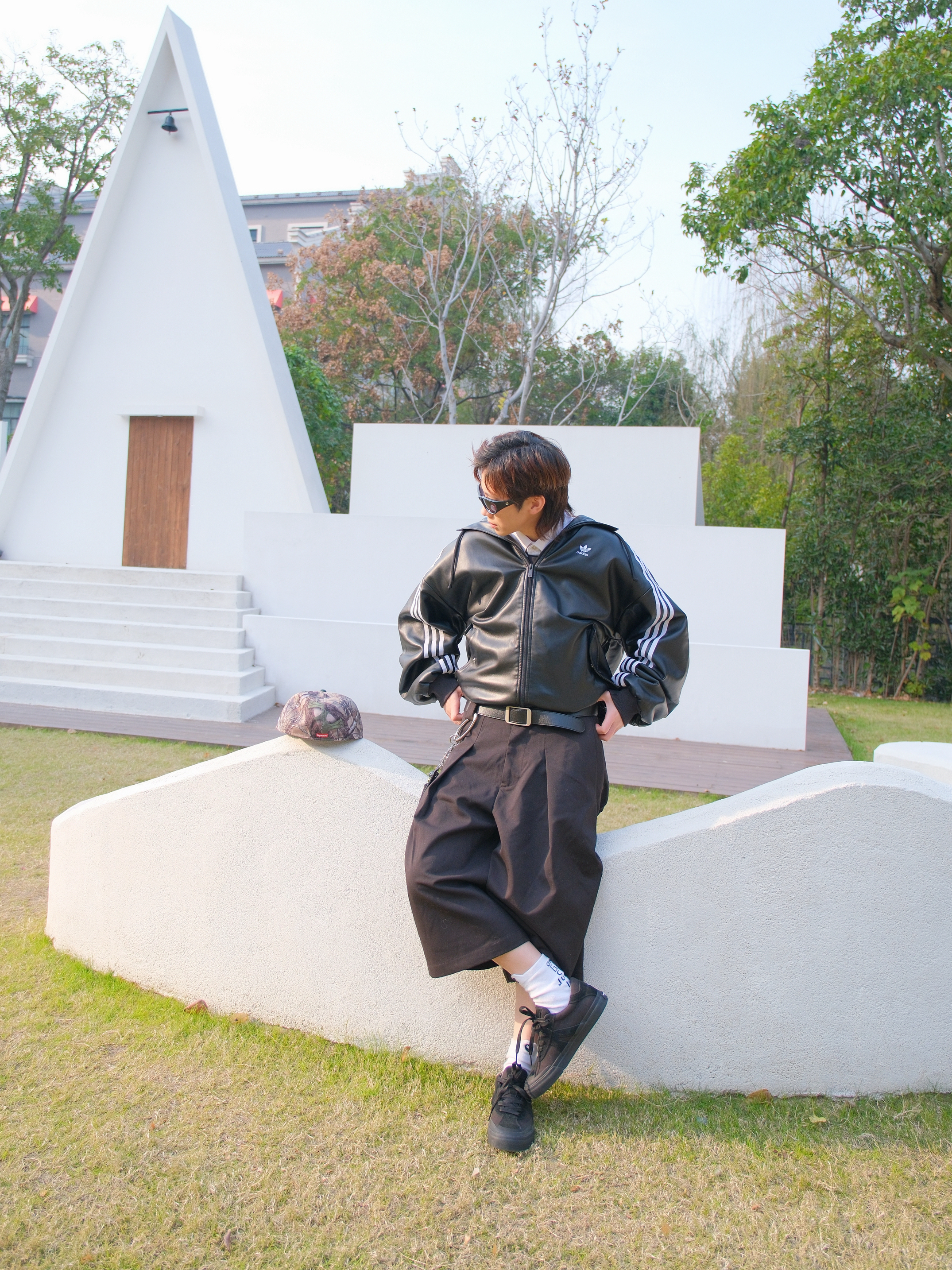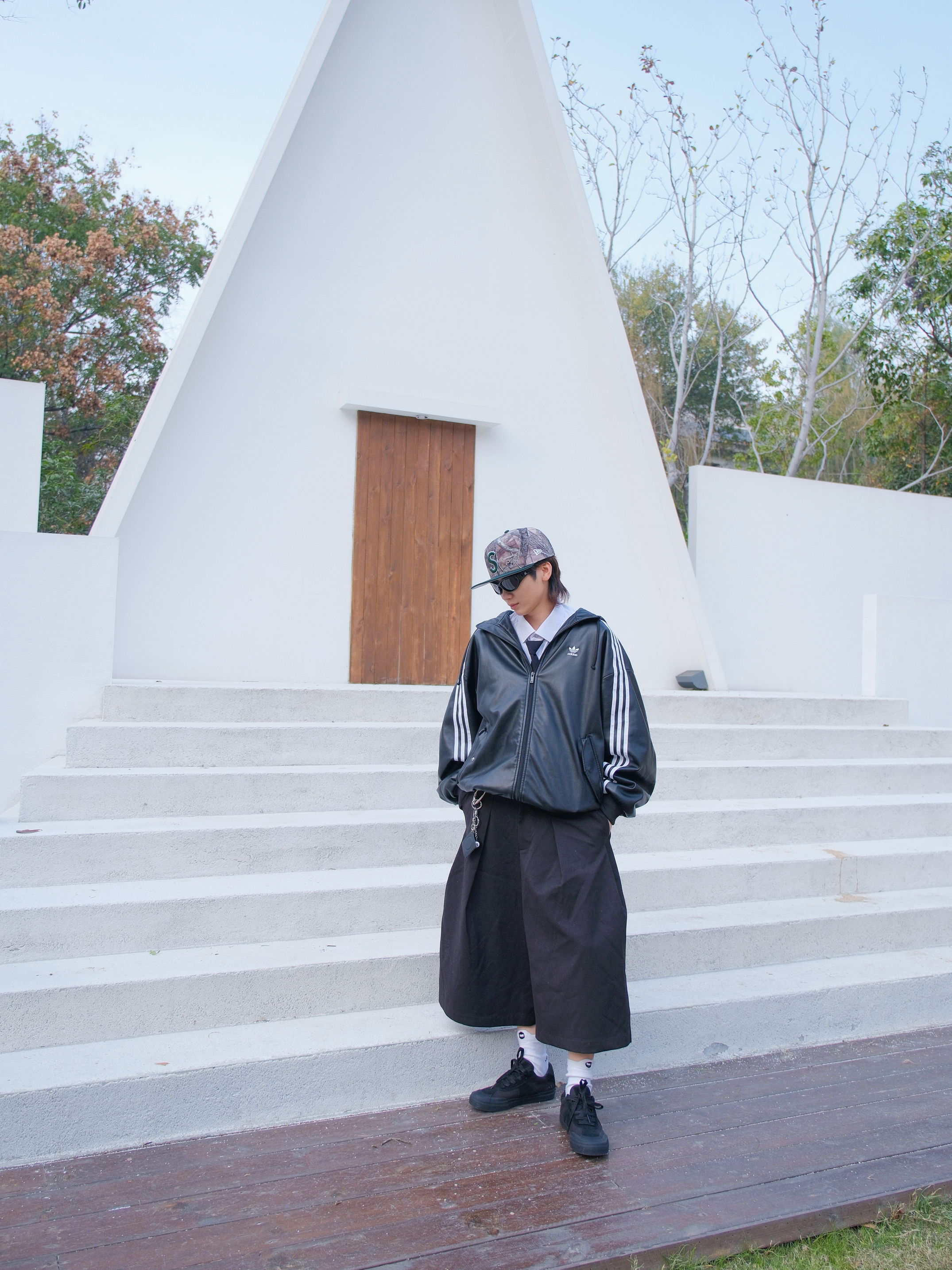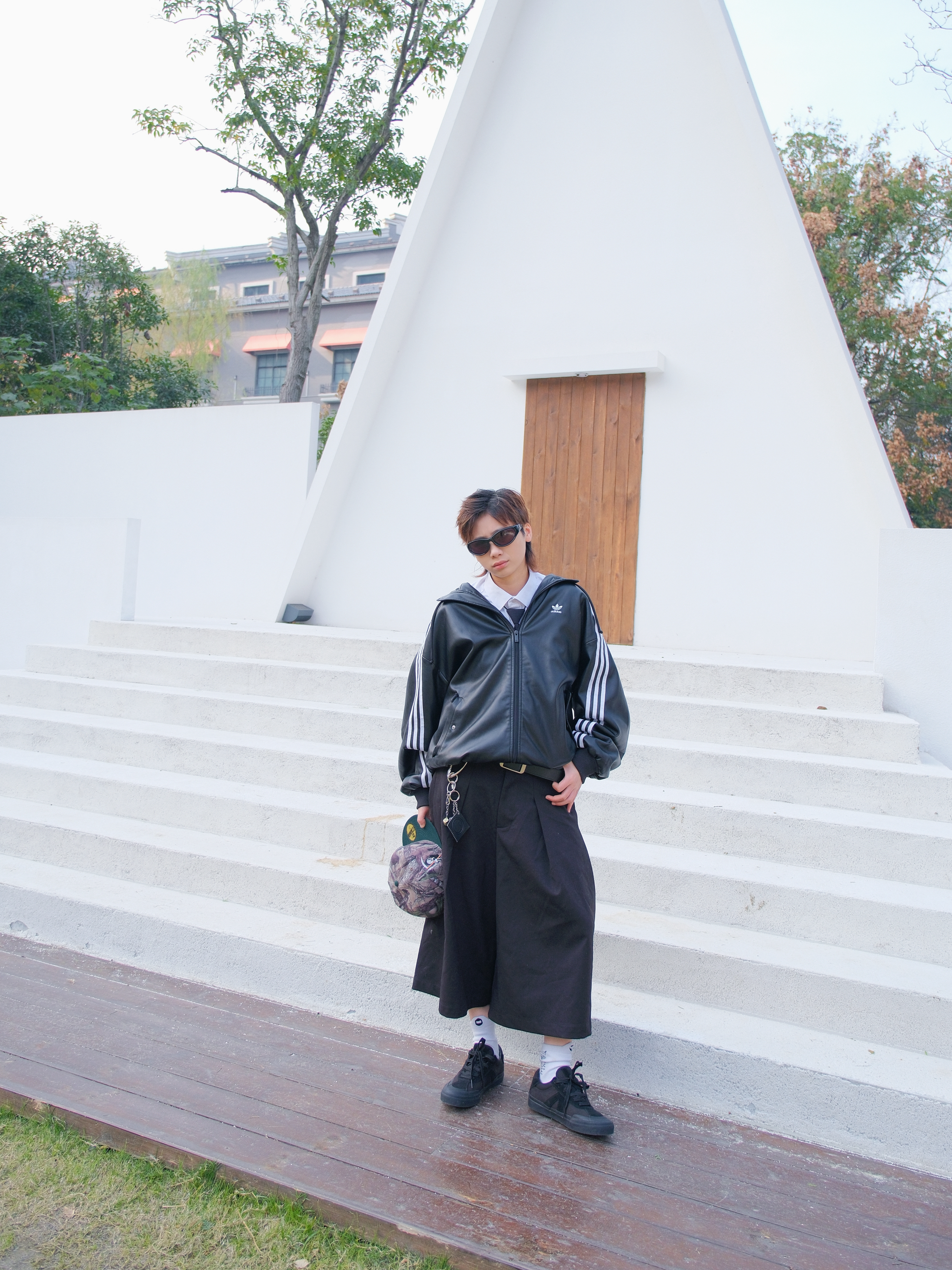 allBlack色系包帅的 上身选了件阿迪的皮衣棉服 连帽设计还蛮特别的 羊皮材质也比较软乎 配了条廓系西装裤 南方的温度上长下短无压力 最后搭配上vision黑胶限定板鞋 帆布材质透气又舒服 后跟刺绣图案很有设计感 属于是长期主义,实用好穿又百搭
