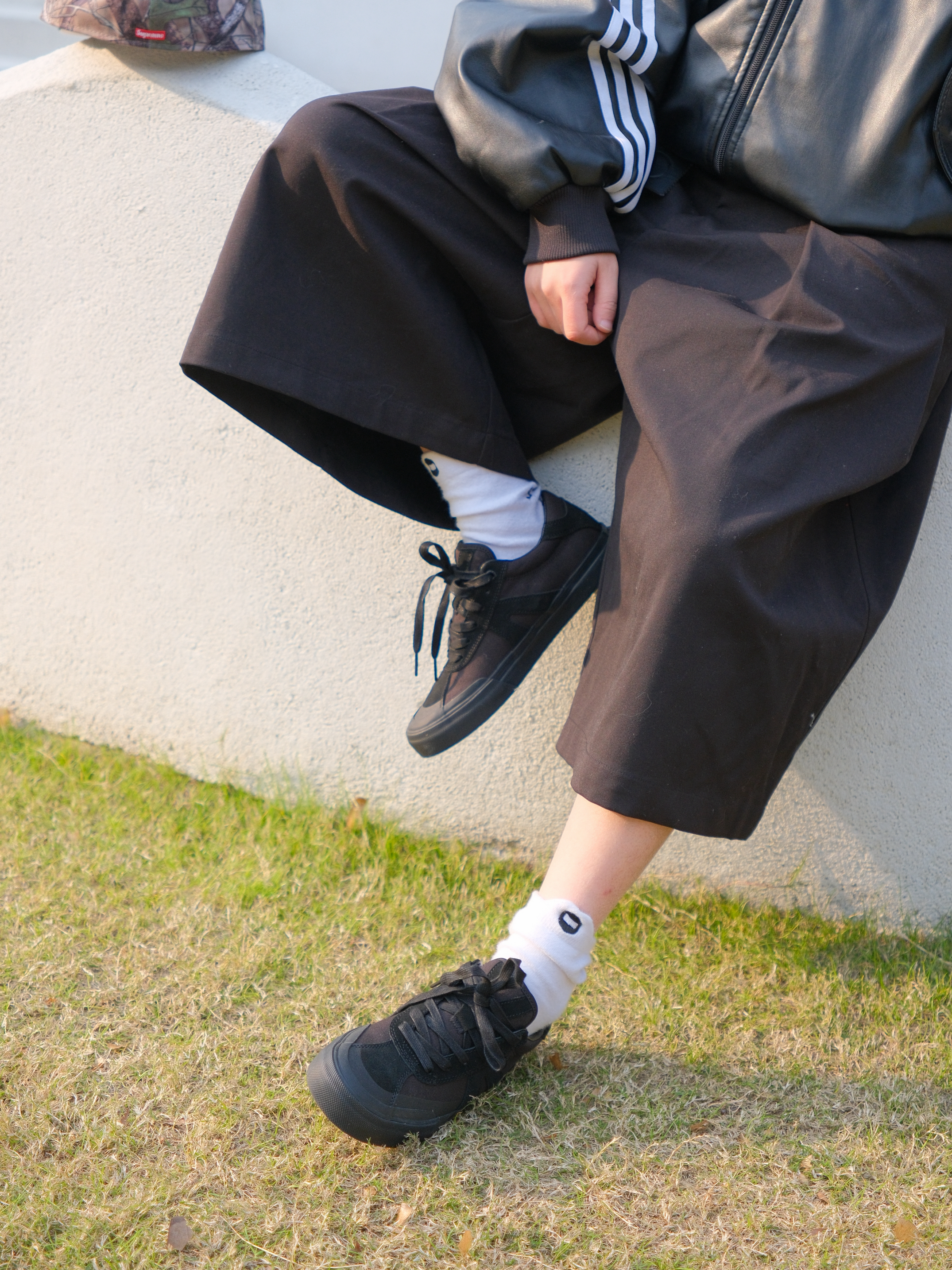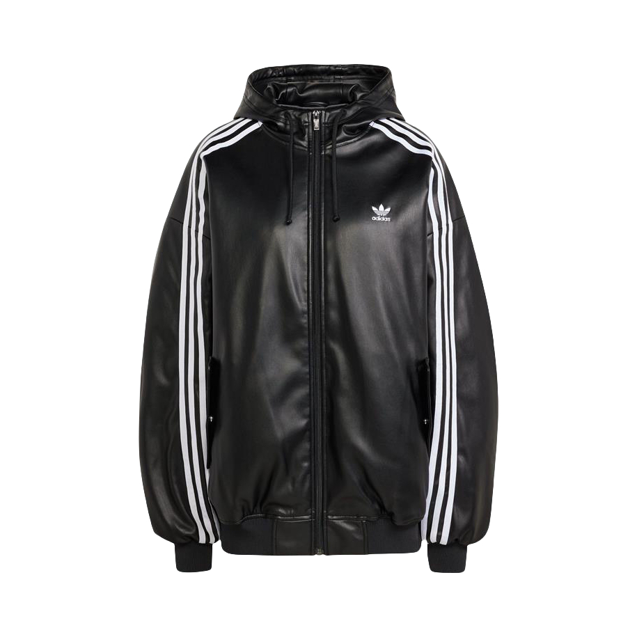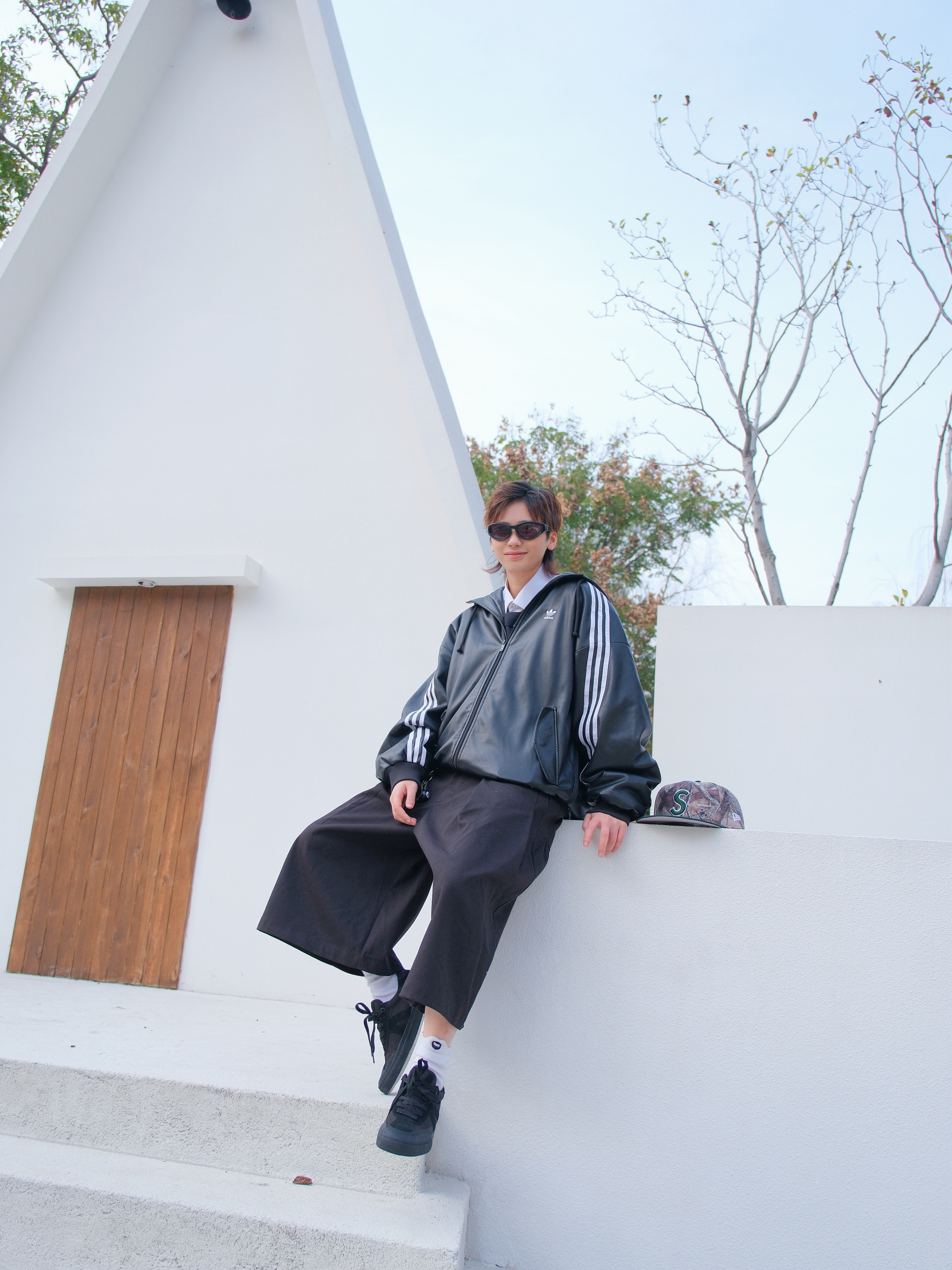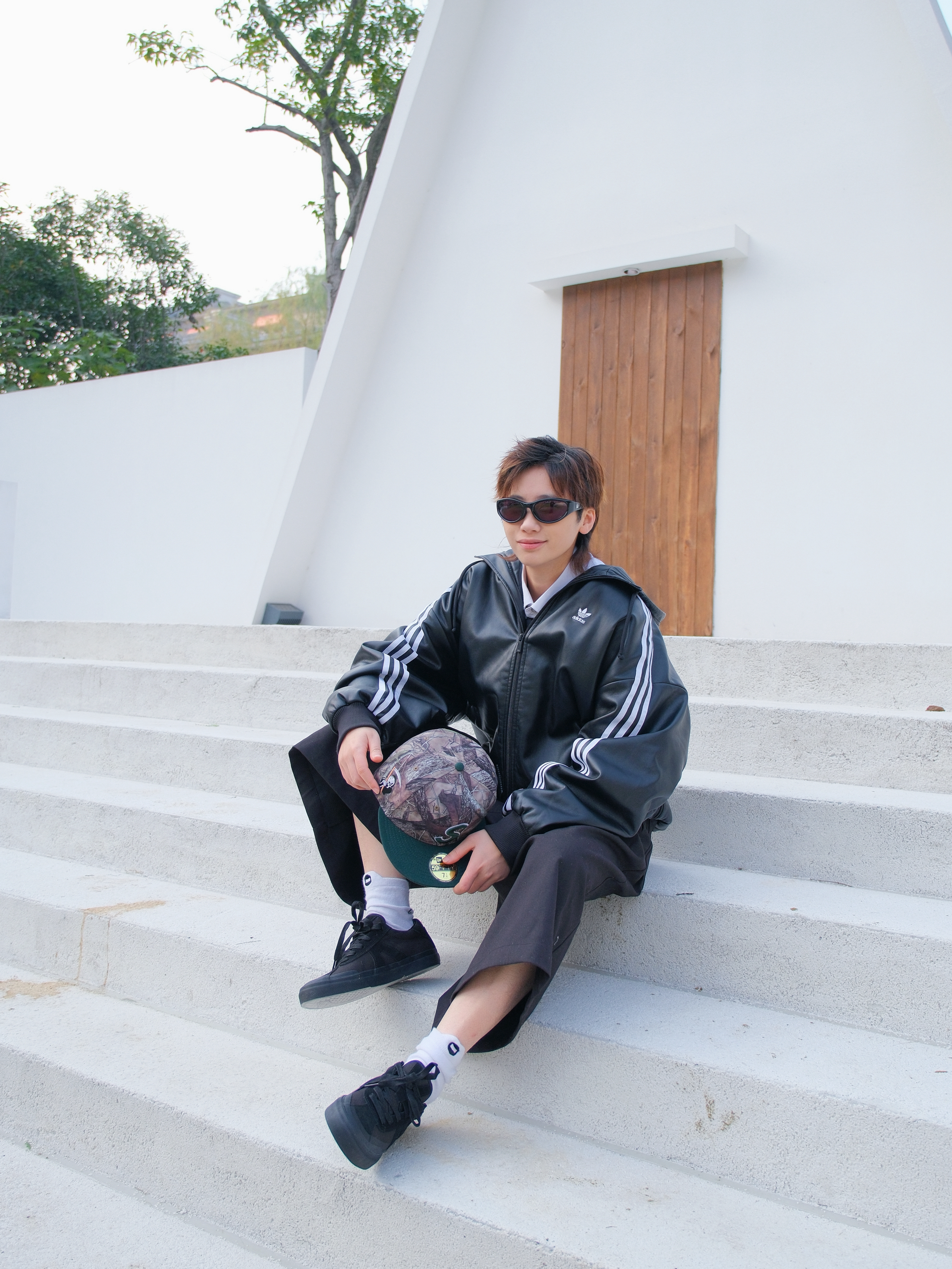allBlack色系包帅的 上身选了件阿迪的皮衣棉服 连帽设计还蛮特别的 羊皮材质也比较软乎 配了条廓系西装裤 南方的温度上长下短无压力 最后搭配上vision黑胶限定板鞋 帆布材质透气又舒服 后跟刺绣图案很有设计感 属于是长期主义,实用好穿又百搭