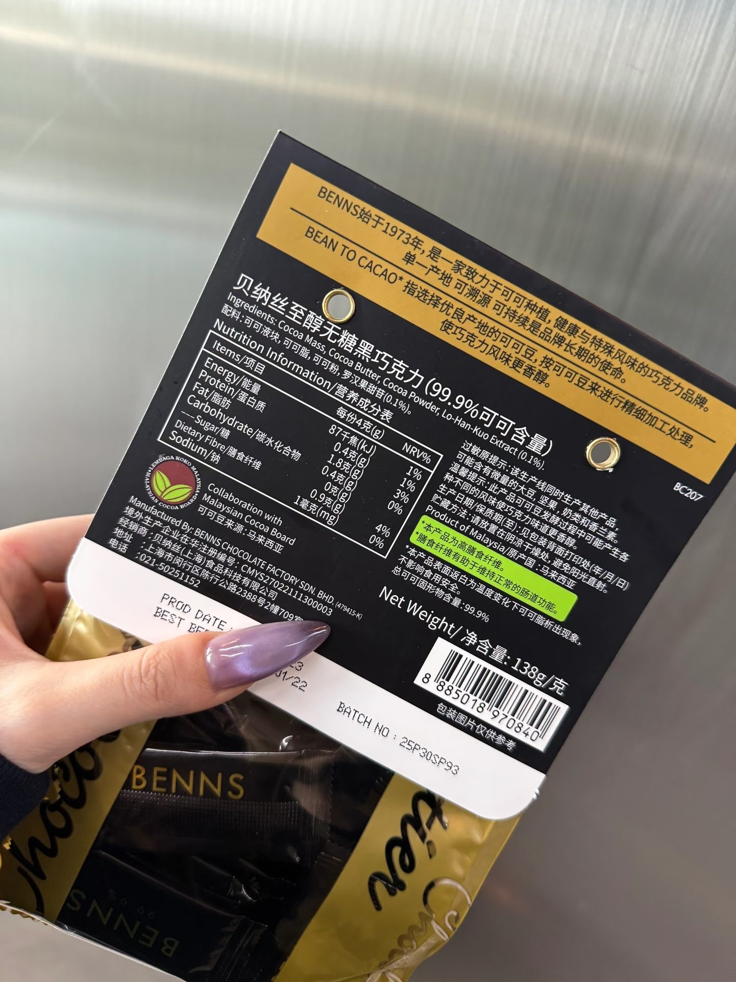 本篇笔记关联了BENNS/贝纳丝 至醇无糖黑巧克力 200g 袋装 纯可可脂健身进口下午茶 99.9%黑巧 99.9%黑巧等商品,为用户提供真实的使用体验和购买参考。