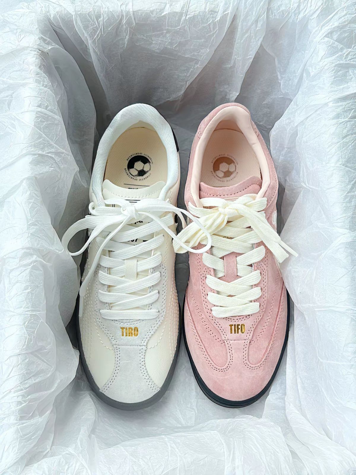 暖调粉棕麂皮拼接+粗绳鞋带的设计很有质感,复古“面包鞋”轮廓自带慵懒随性的腔调,搭配牛仔裤、小裙子都很有氛围感,属于小众但很吸睛的款式。