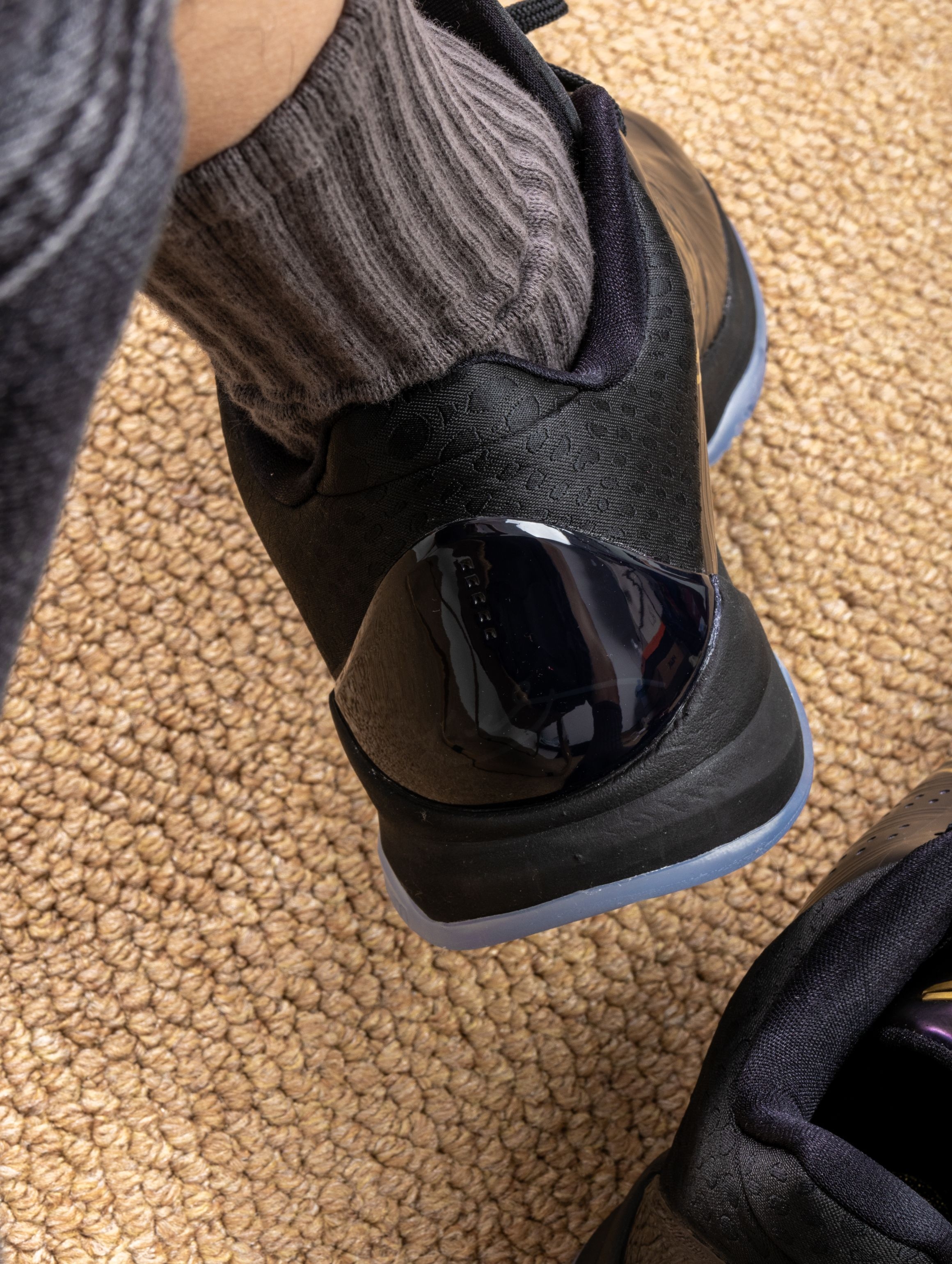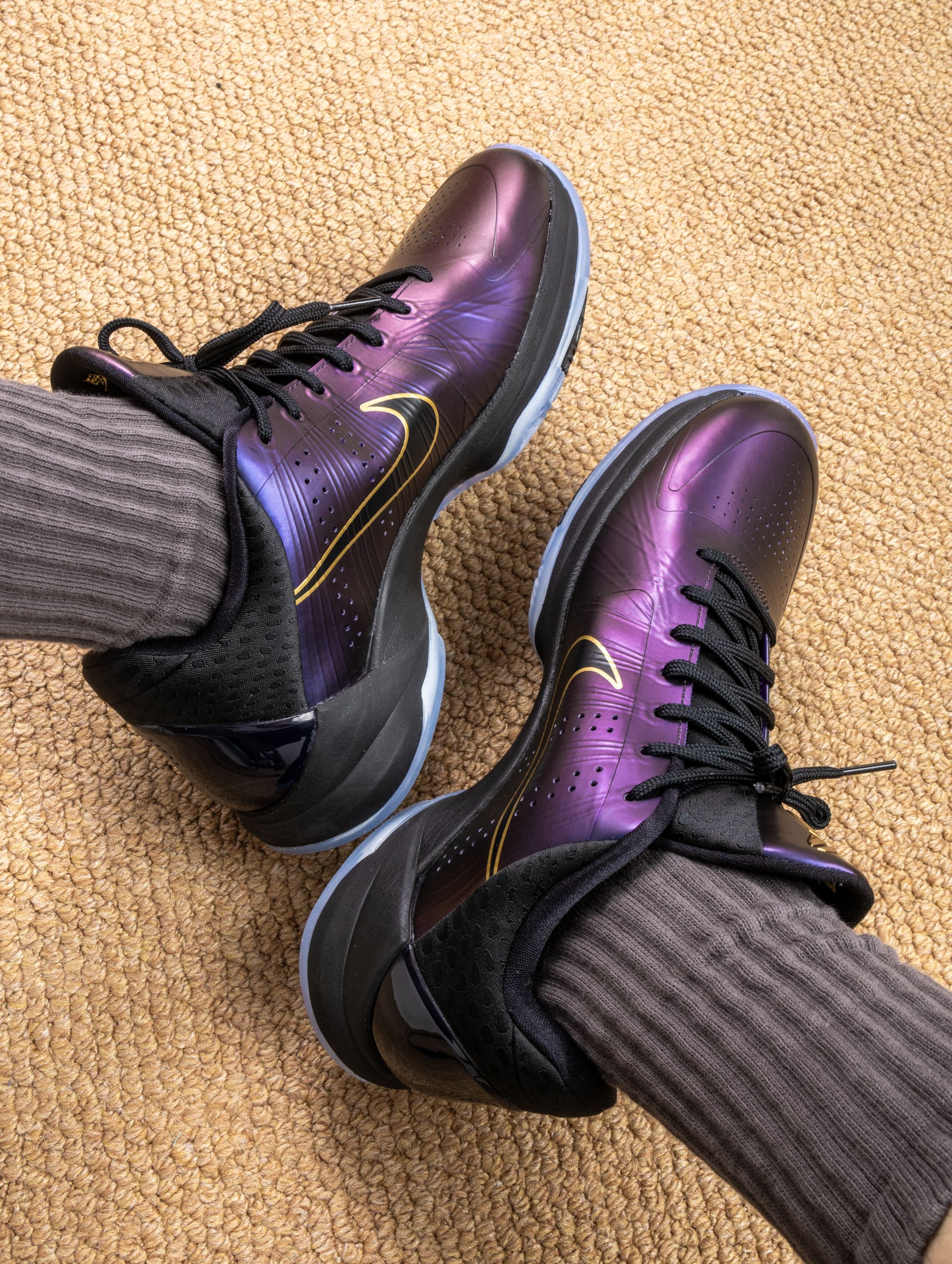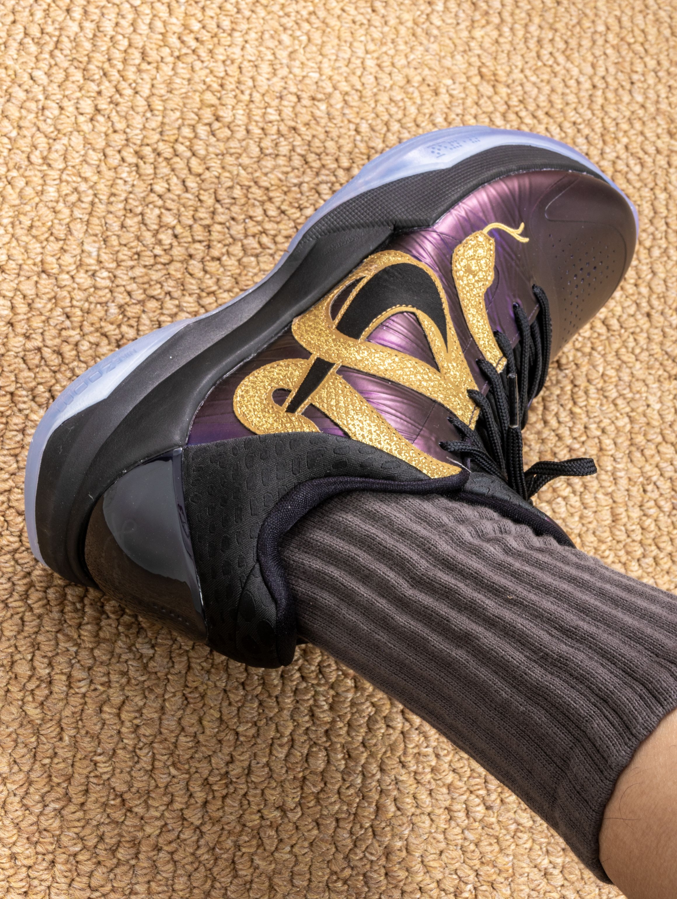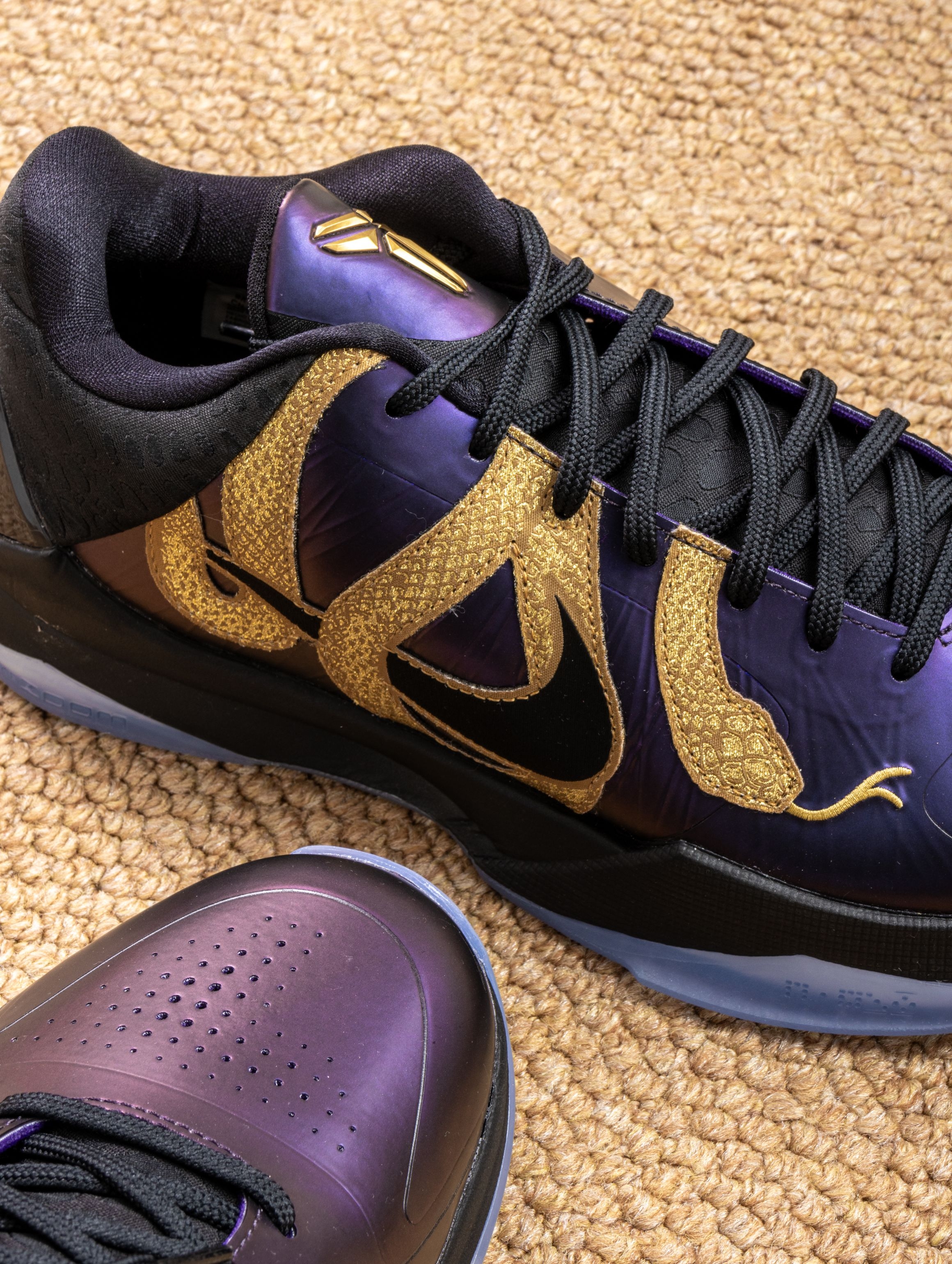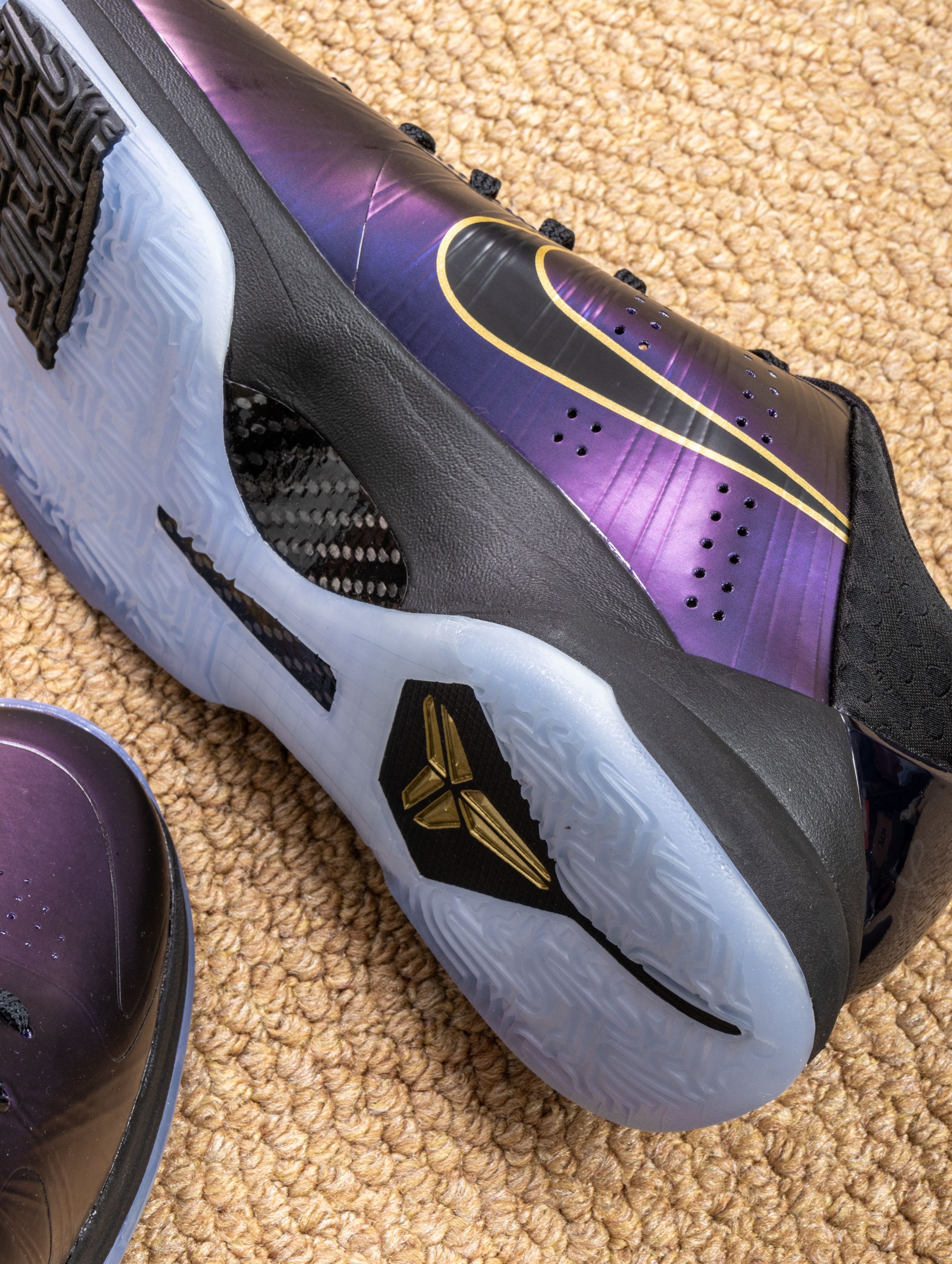 拿到手的第一感觉:华丽。蛇鳞纹路的皮革在光线下有暗纹流动,黑紫金配色深邃又耀眼,后跟的数字密码藏着满满的致敬。 上脚实战才是重头戏:Protro前掌Zoom Turbo的响应还是那么快,贴地感十足,低帮设计让脚踝活动完全自由,无论急停还是后仰都异常跟脚。这种赛场控制感,正是黑曼巴的风格。 已不只是一双鞋,更是一件承载曼巴精神和独特故事的藏品。每一次上场,都像带着他的篮球智慧在战斗。