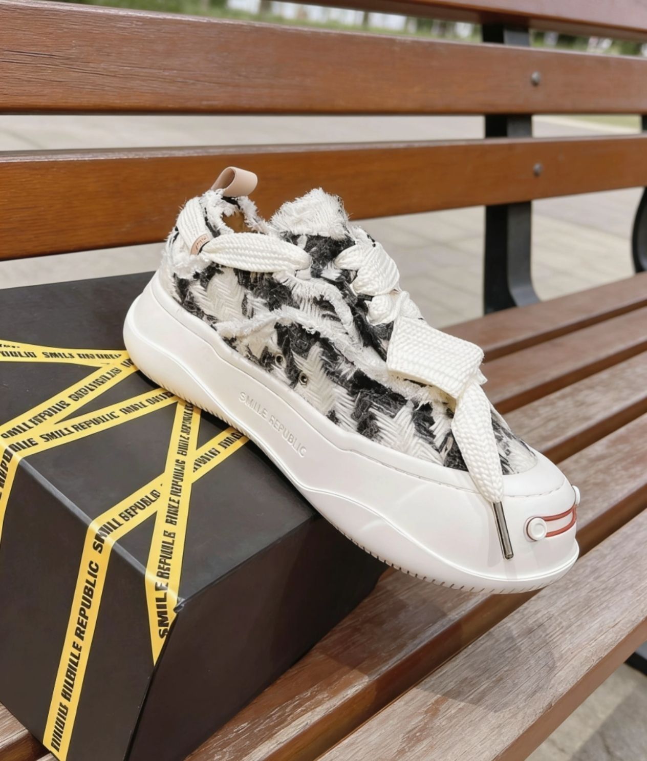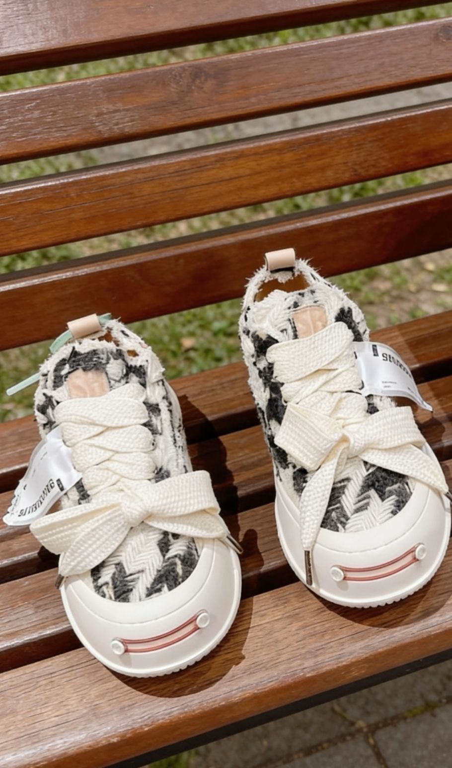这双由SMILE REPUBLIC(起司猫)推出的“纯分享”系列厚底板鞋,以其标志性的黑白豹纹织物鞋面与蓬松的米白色蝴蝶结鞋带,瞬间成为街头焦点。 从公园长椅到都市街头:你的万能时尚搭档: 这双鞋的百搭性是其另一大优势。它不挑场合,不挑风格。搭配一条简约的牛仔裤和T恤,是随性自在的周末出街;搭配一条飘逸的连衣裙,则是甜美又不失个性的约会装扮;甚至与西装裤混搭,也能碰撞出意想不到的时尚火花。它就像...