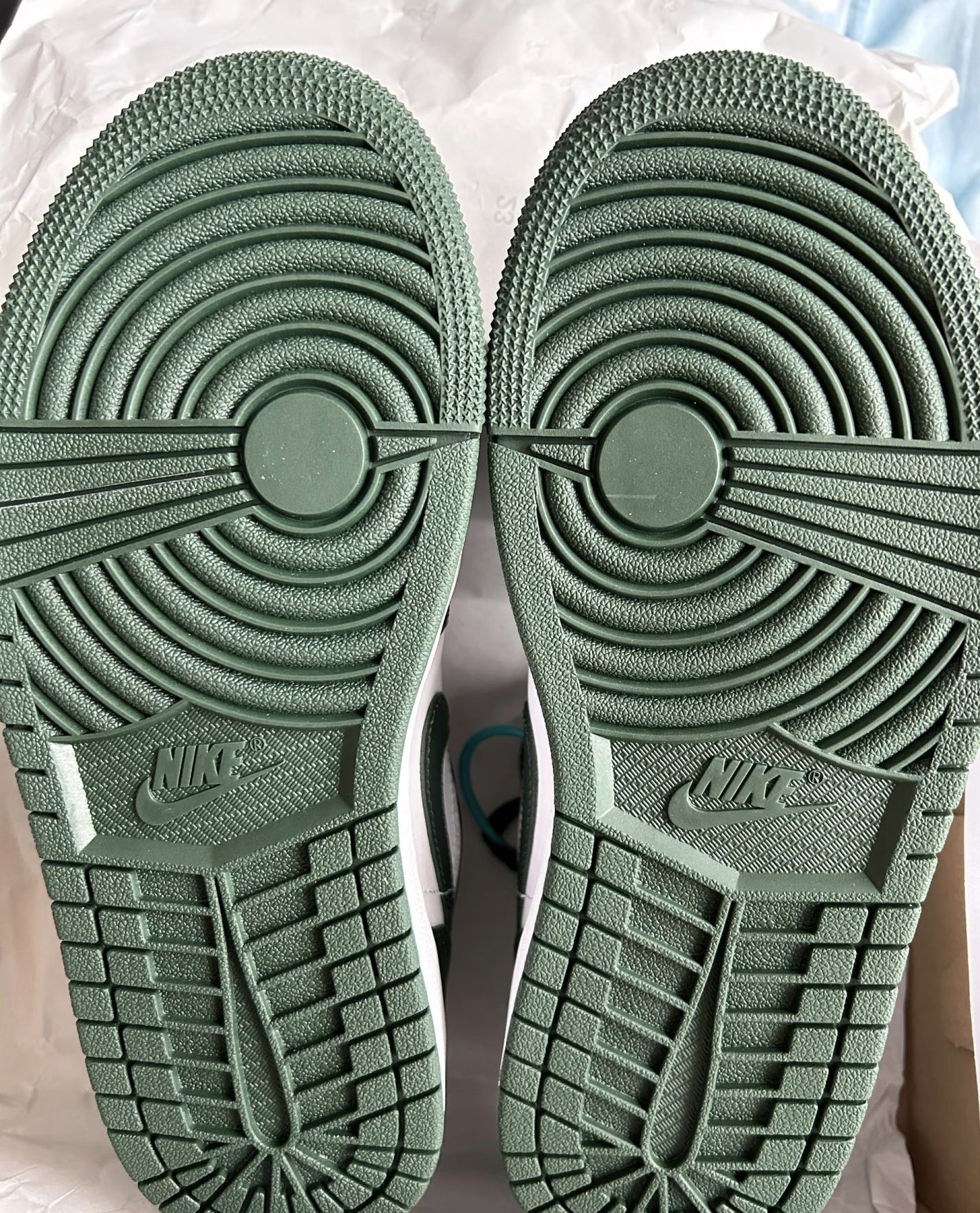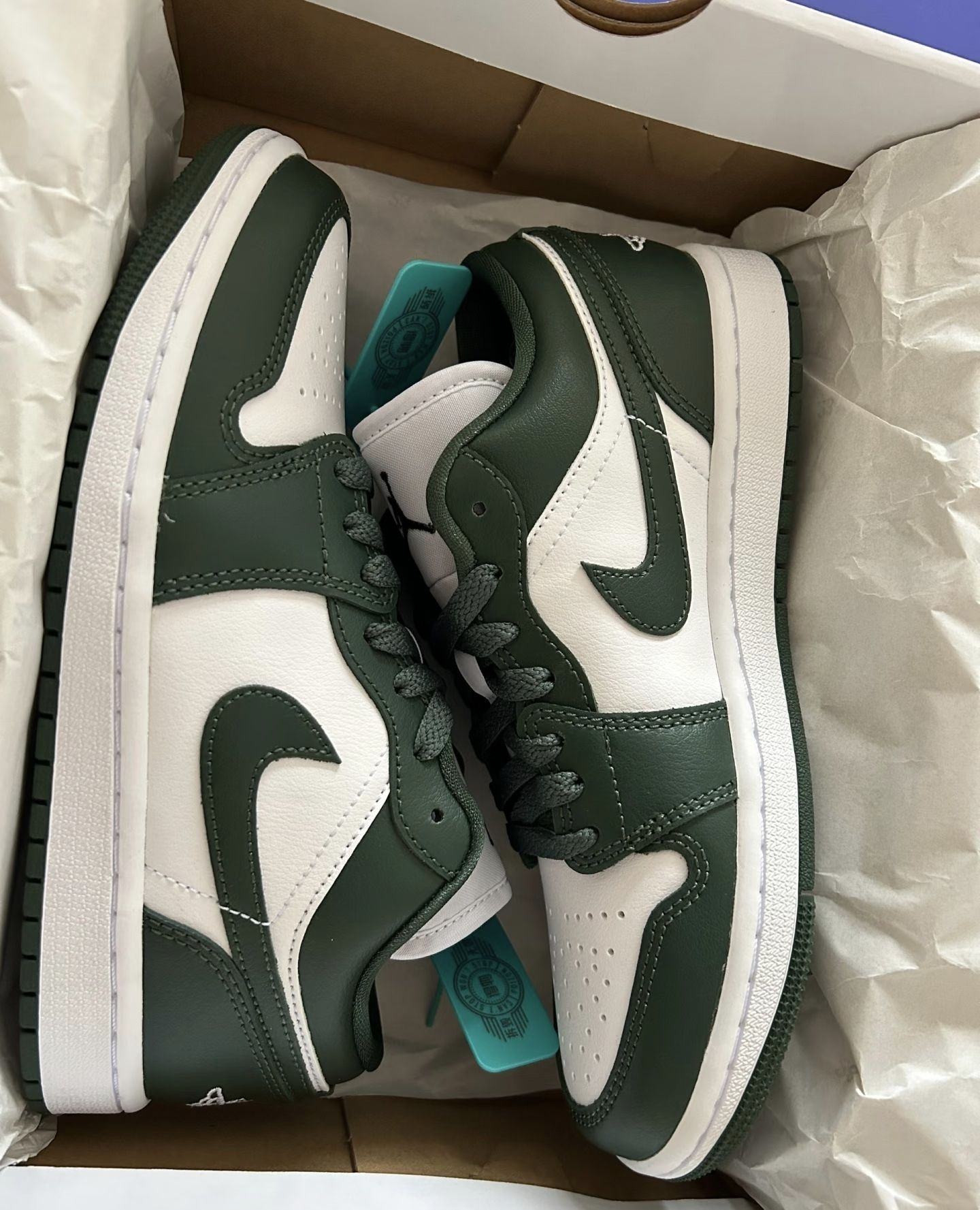 这款AJ1采用墨绿色拼接白色~ 一眼就很清新的赶脚~ 看到它的第一眼我就完全被吸引这个墨绿色特高级!