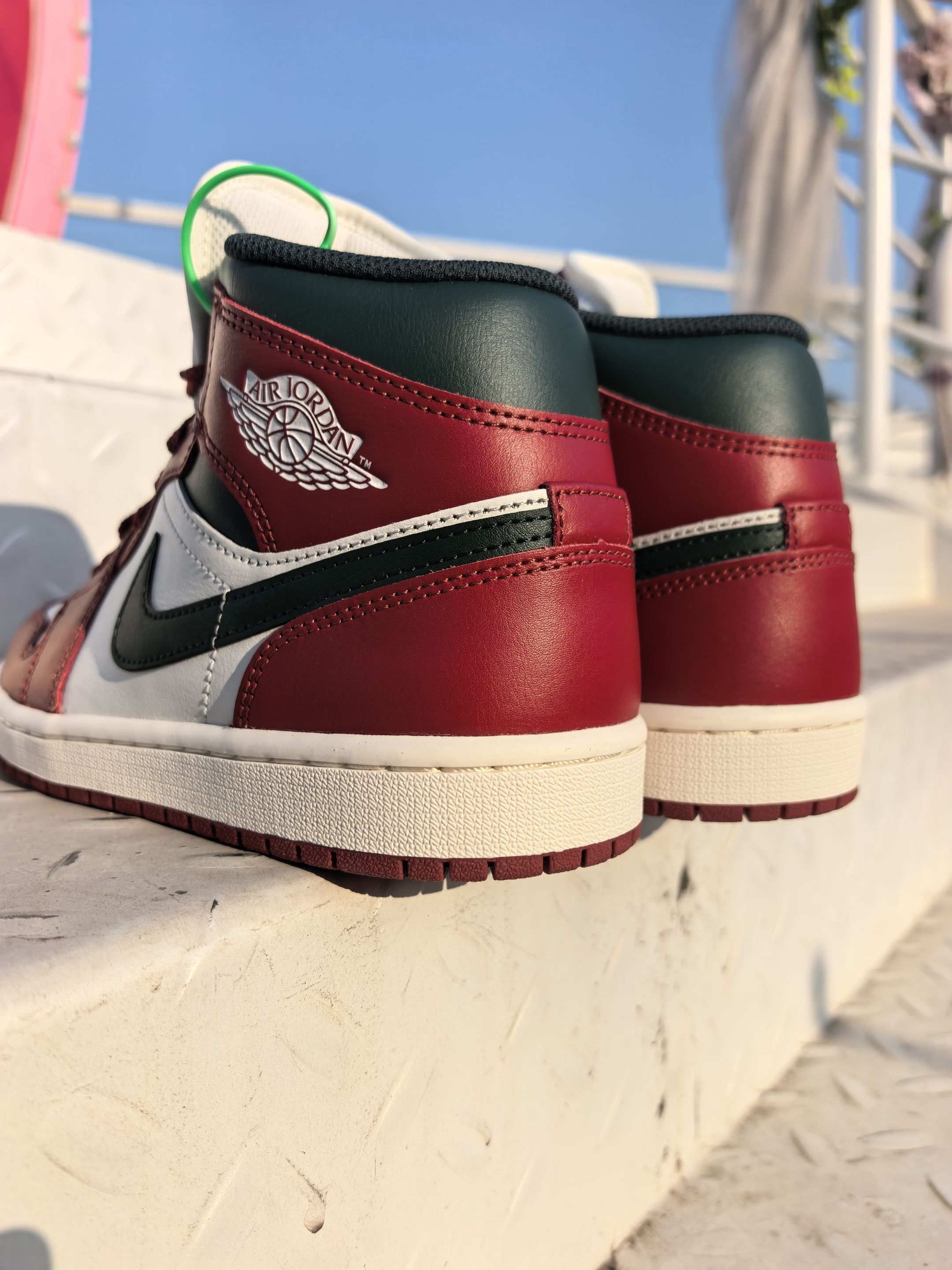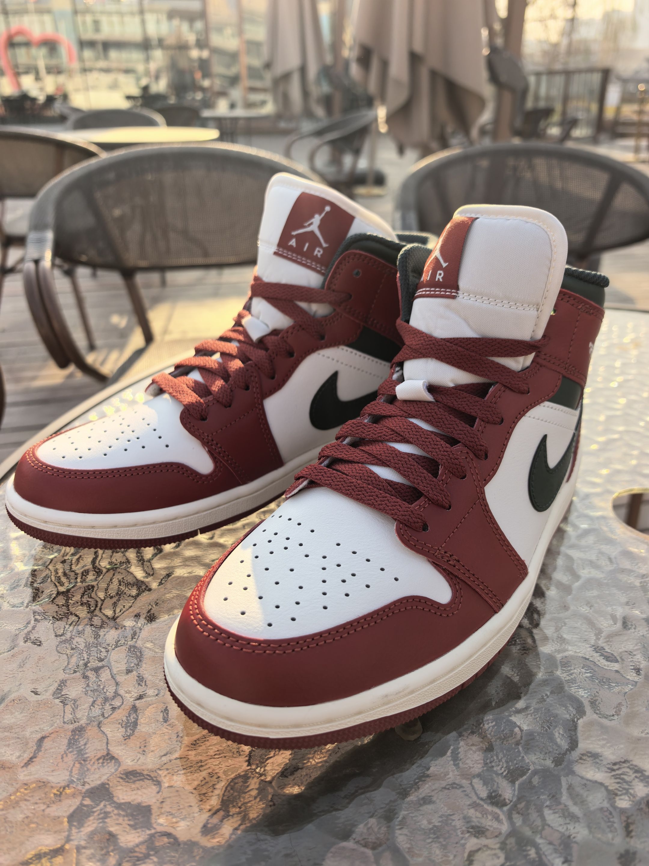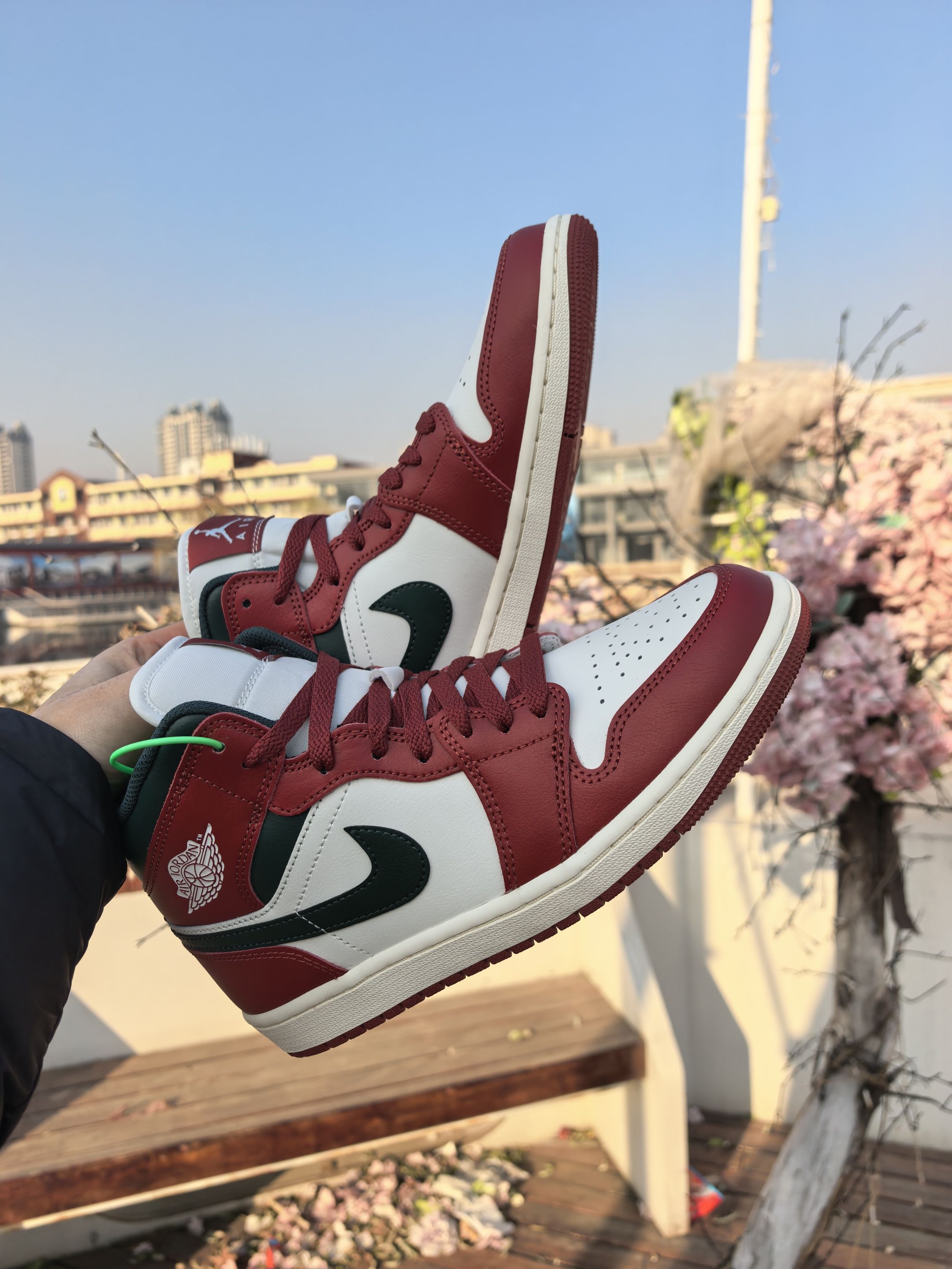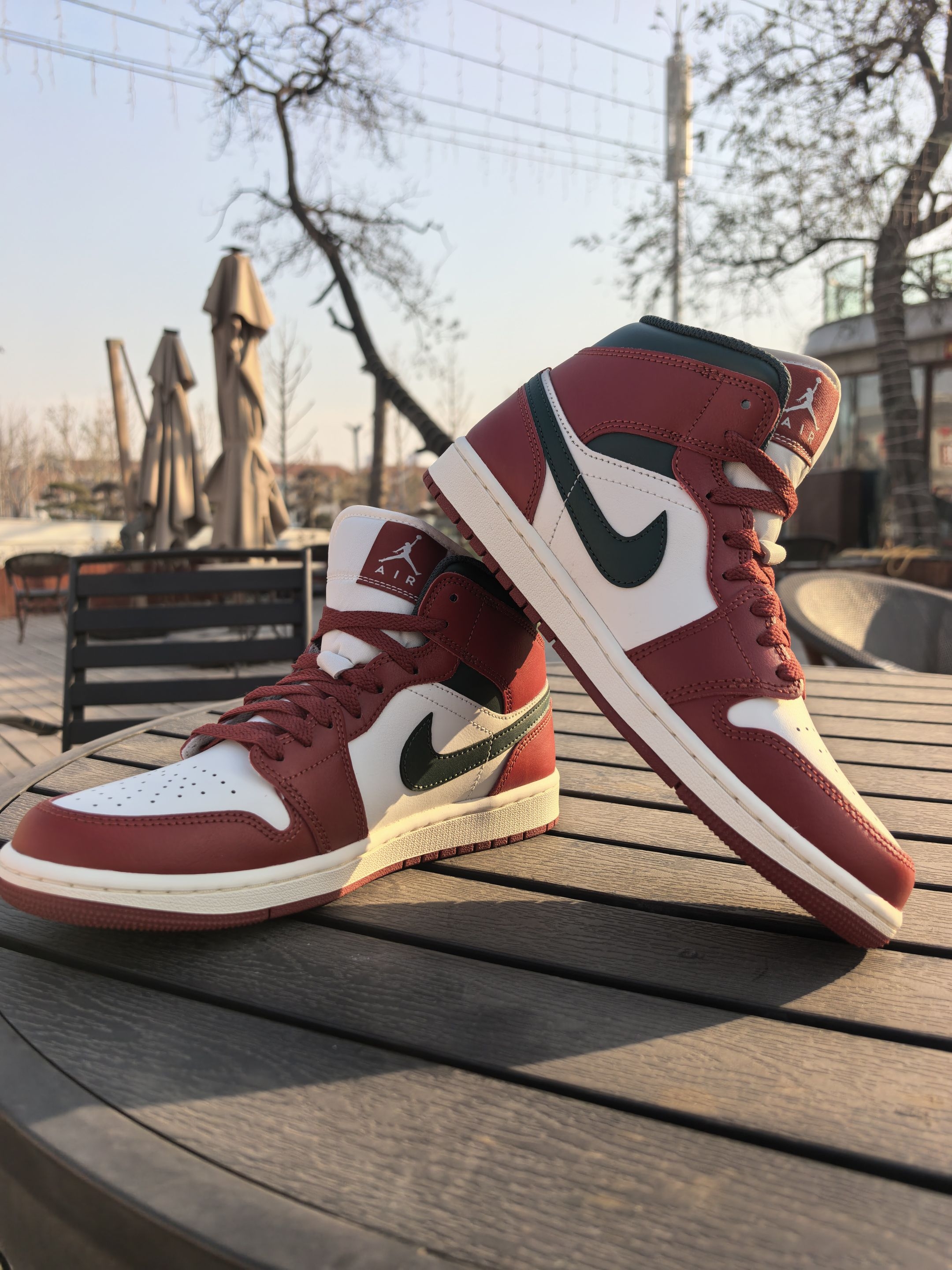 来看我最新入手的这双AJ1 这颜值真的是长在我审美点上了❗酒红+米白的主色调自带复古质感 。深绿勾边又偷偷加了点小众细 节♥ 鞋头是软乎乎的荔枝纹皮♨摸上去不像普通AJ那么硬。鞋头的透气孔 肉眼可见的密集💢夏天穿也不会闷脚。 上脚比想象中舒服多了💯鞋底软弹但不塌,高帮的包裹感刚好能稳住脚踝 🔔日常通勤或者逛一下午街都不觉得累脚🔝