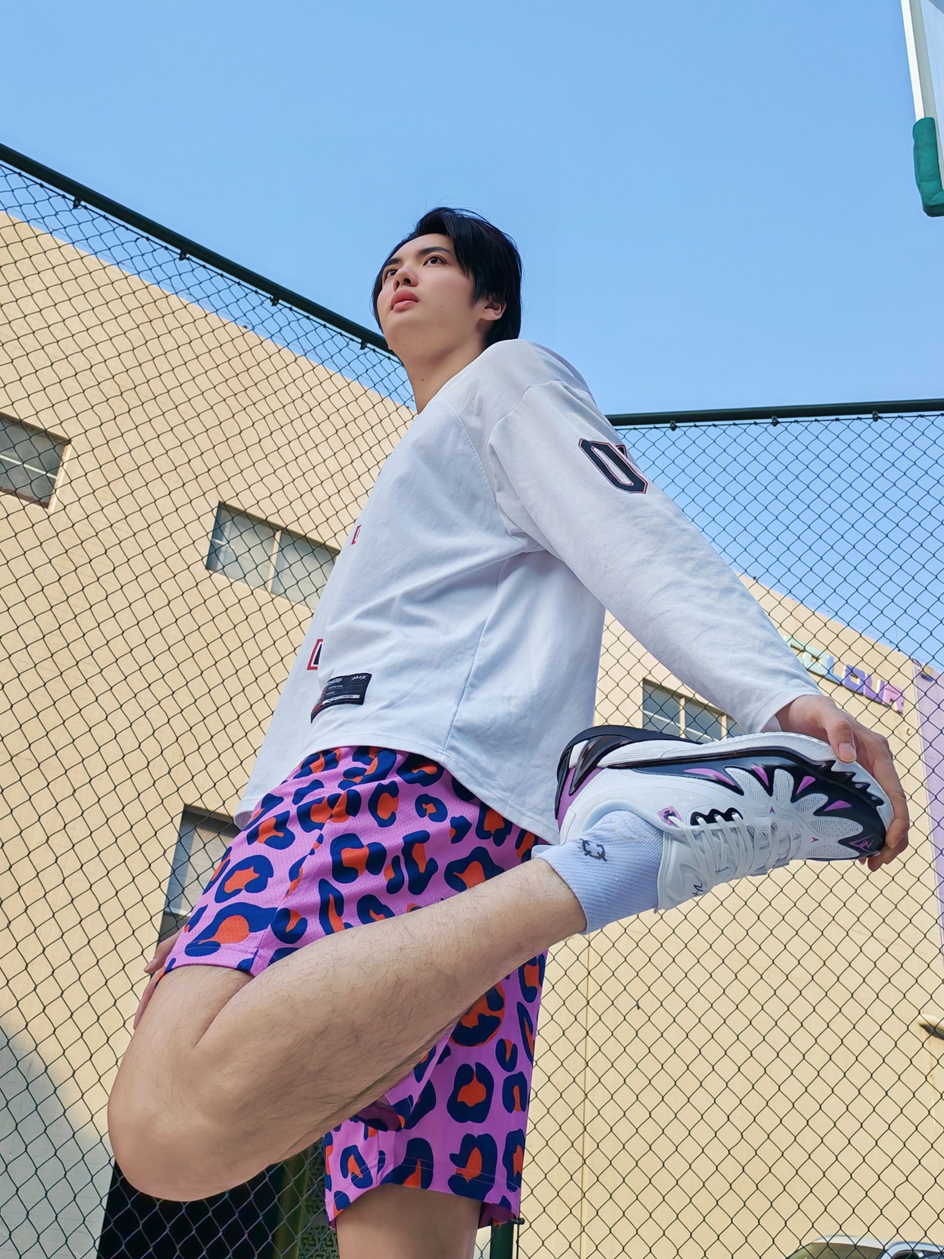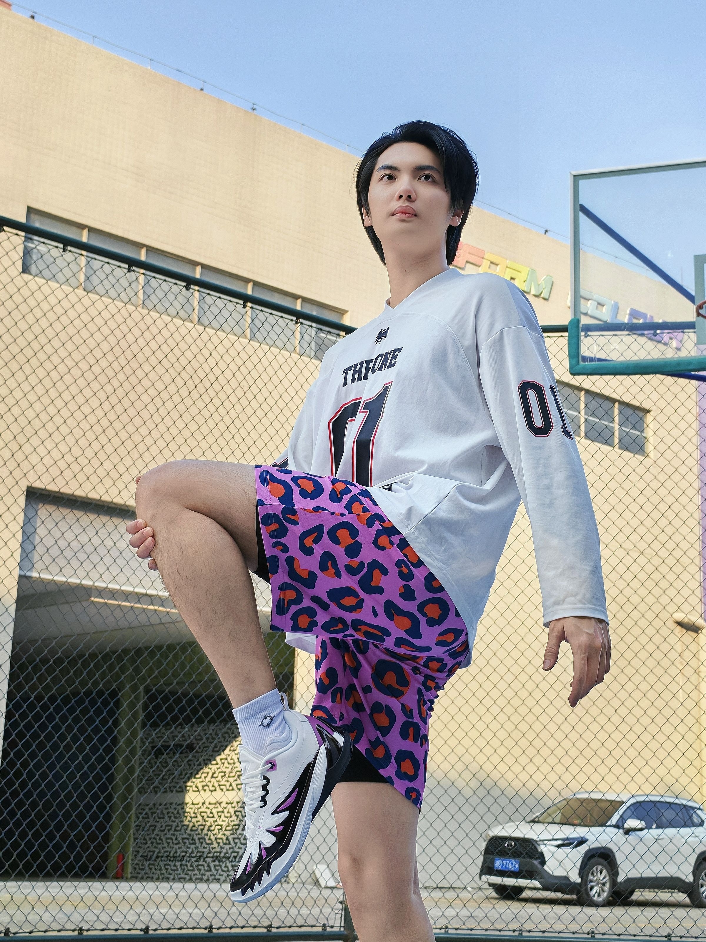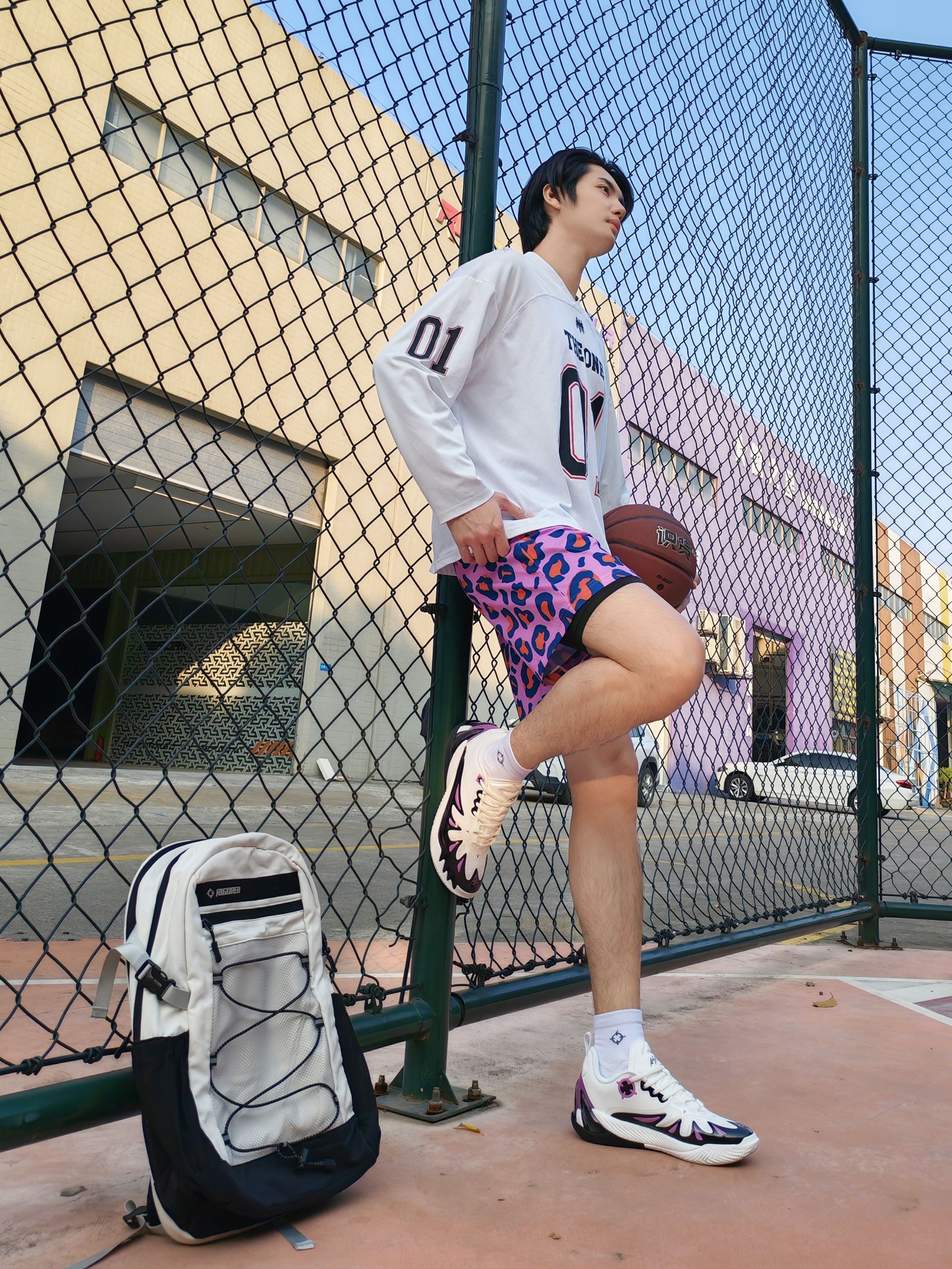hi 这里是镭子的运动穿搭分享 白球衣+粉紫豹纹裤,跳脱又适配 球鞋紫白撞色贴满细节 抓篮球🏀蹲场边,松弛感拉满 打完球直接转场冰美式,毫不违和!