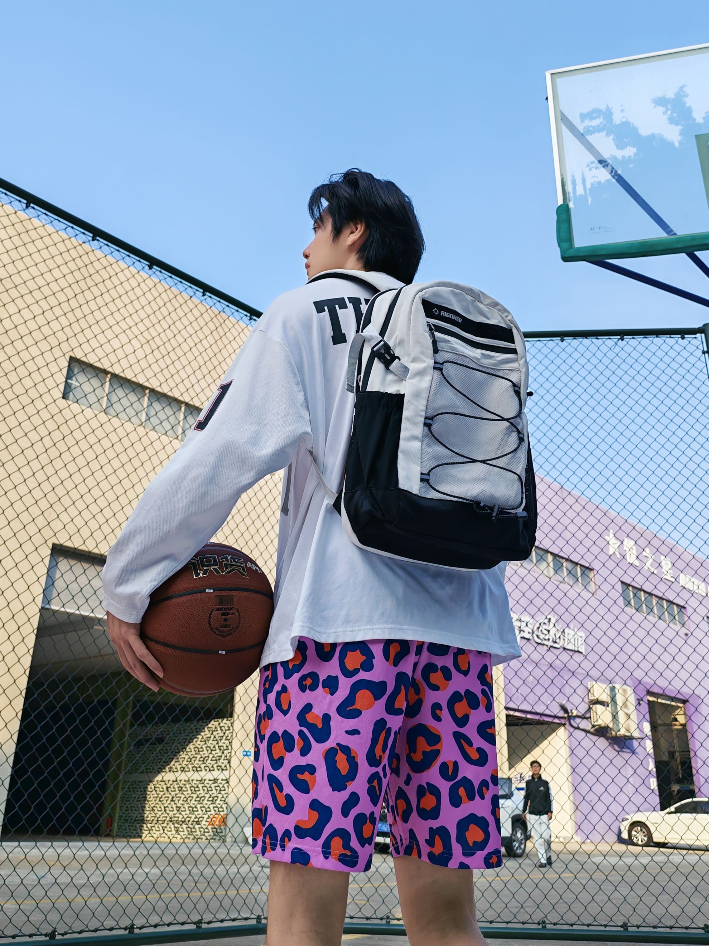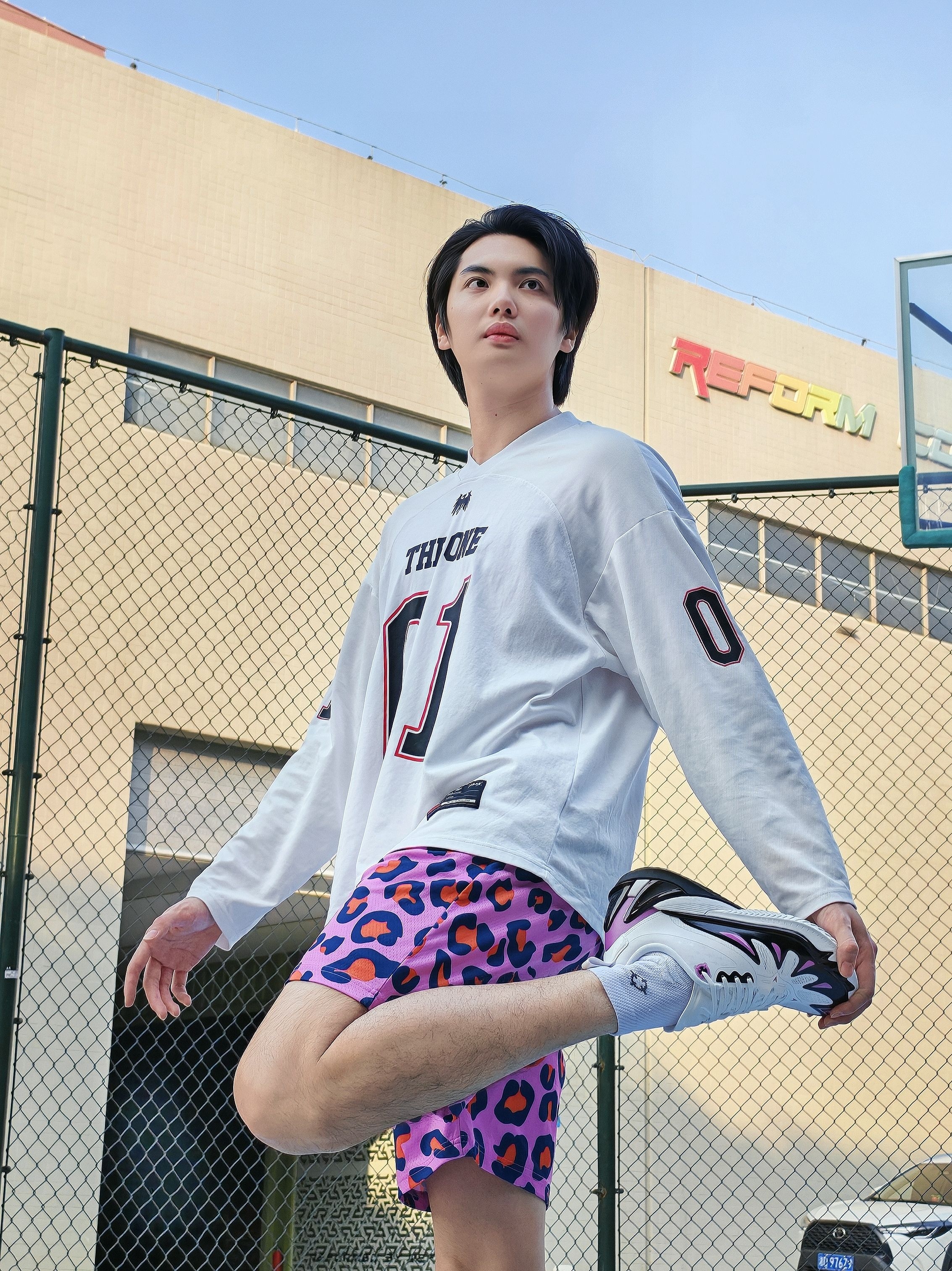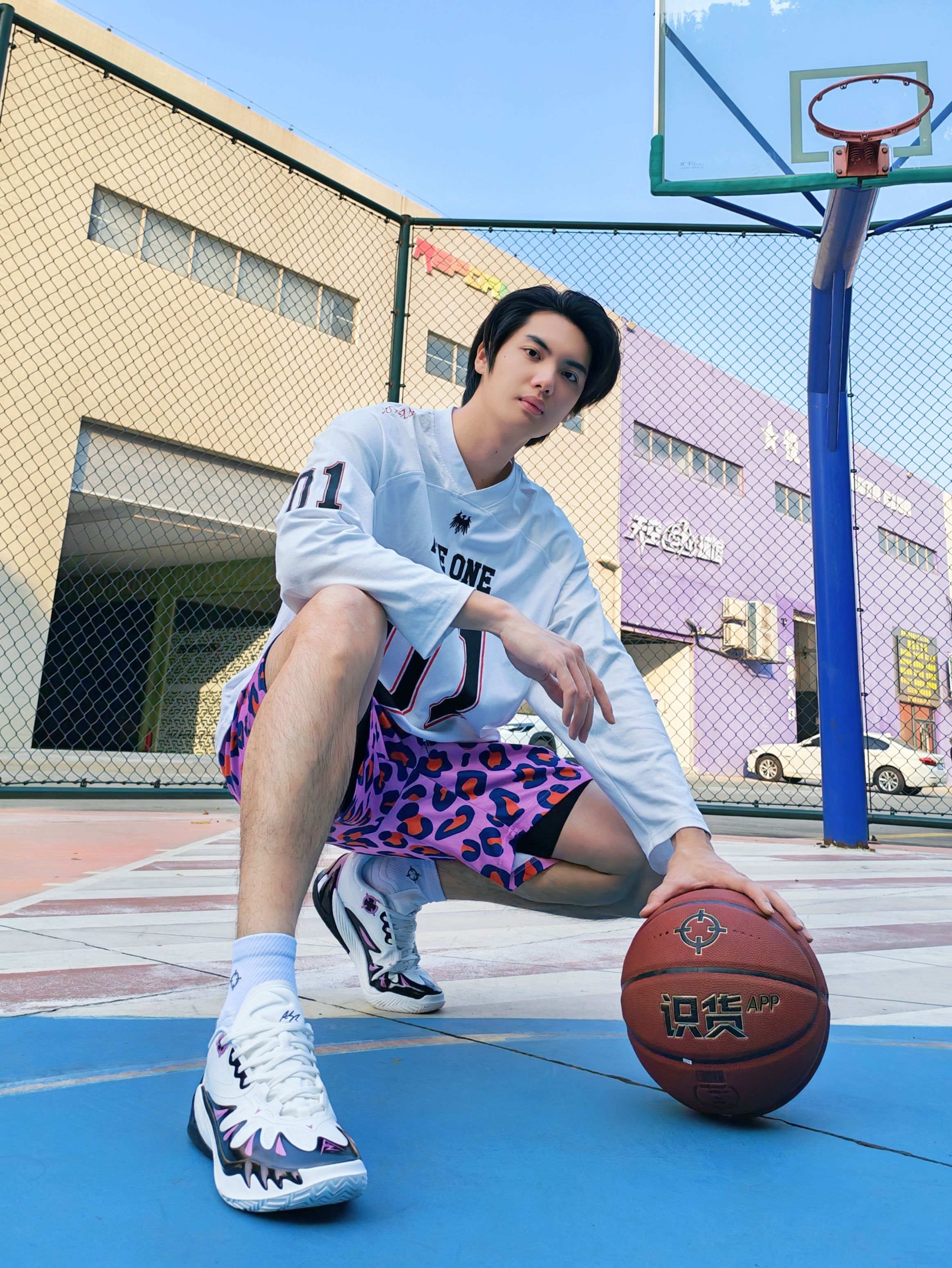 hi 这里是镭子的运动穿搭分享 白球衣+粉紫豹纹裤,跳脱又适配 球鞋紫白撞色贴满细节 抓篮球🏀蹲场边,松弛感拉满 打完球直接转场冰美式,毫不违和!