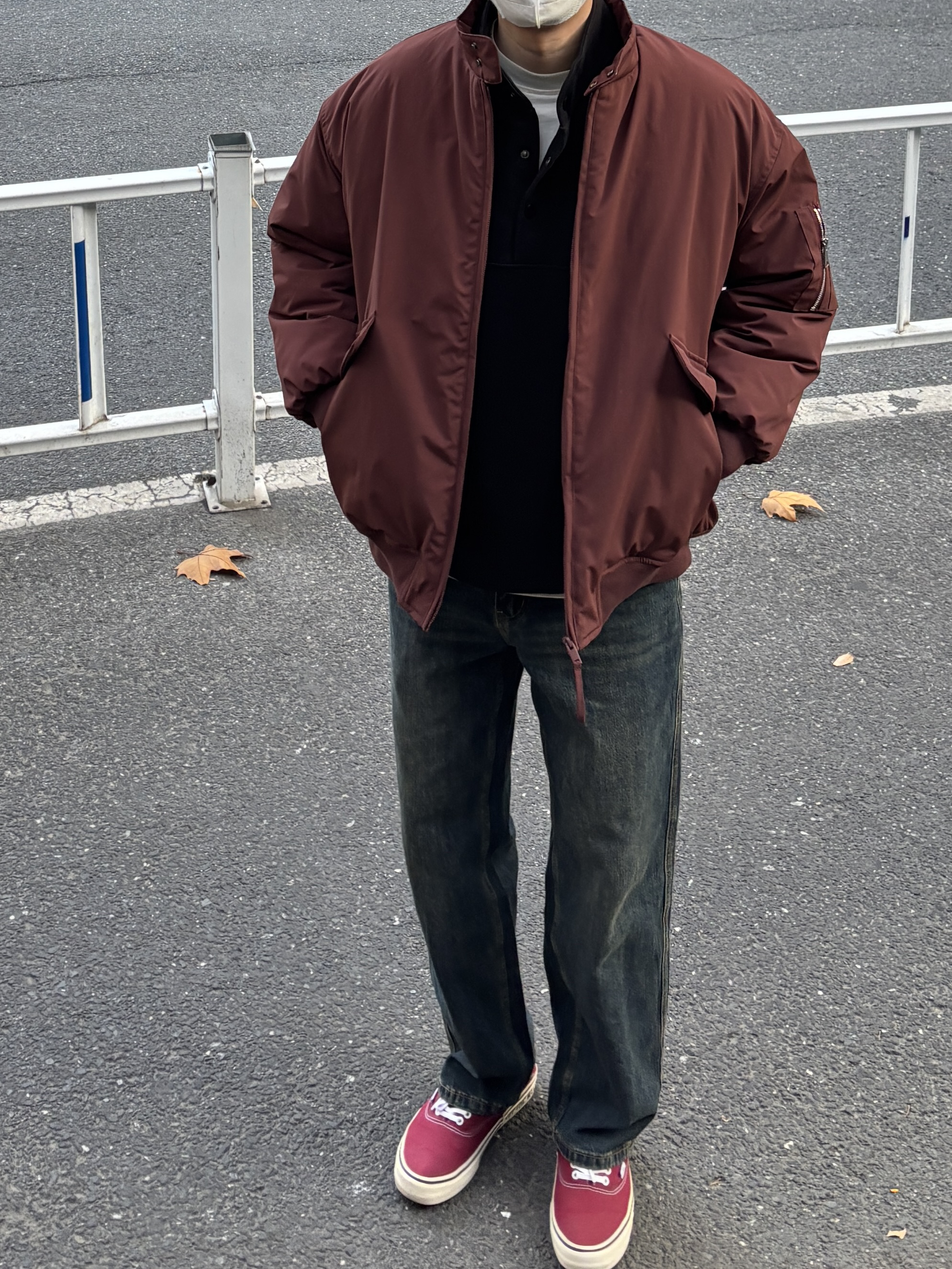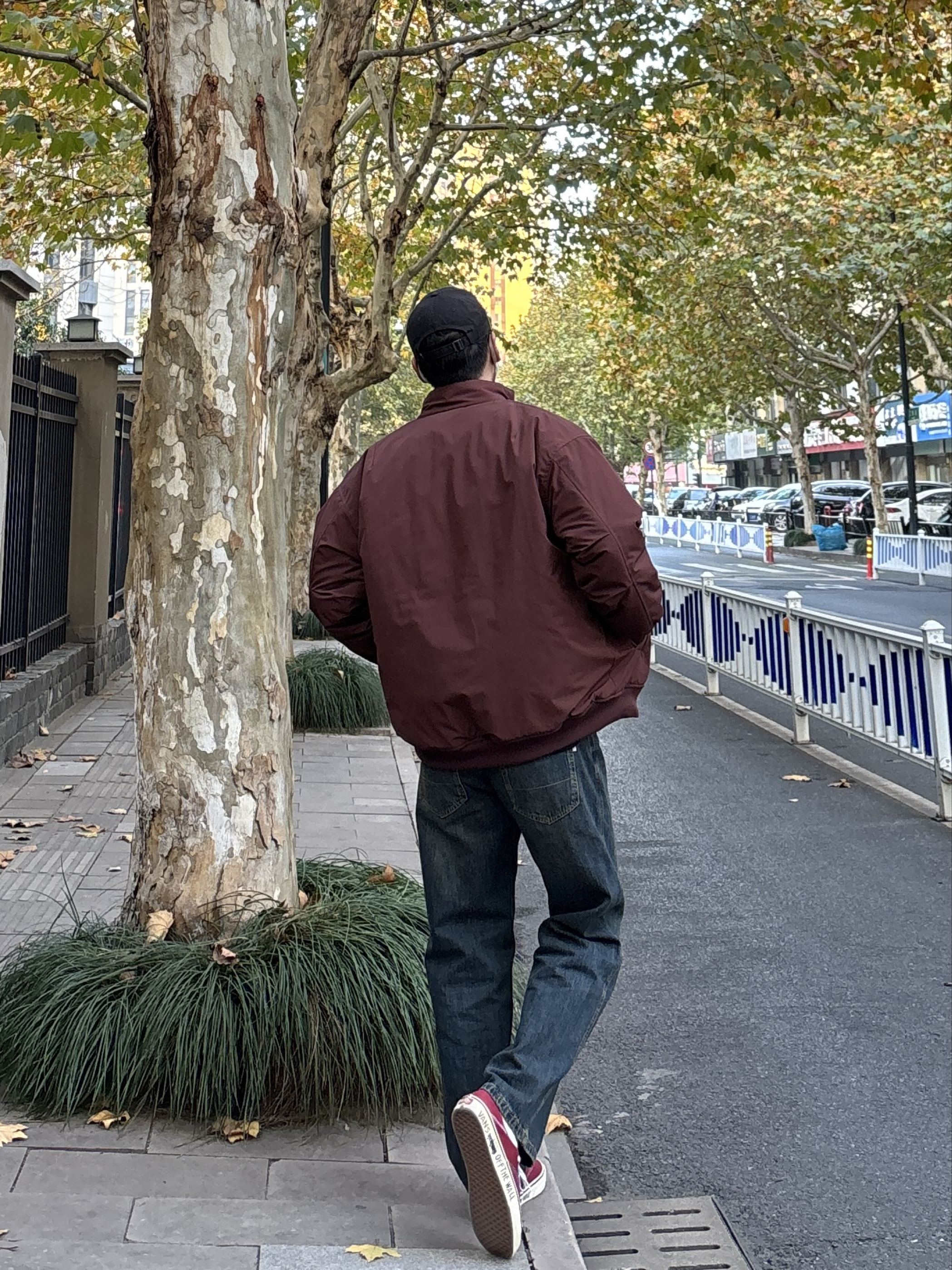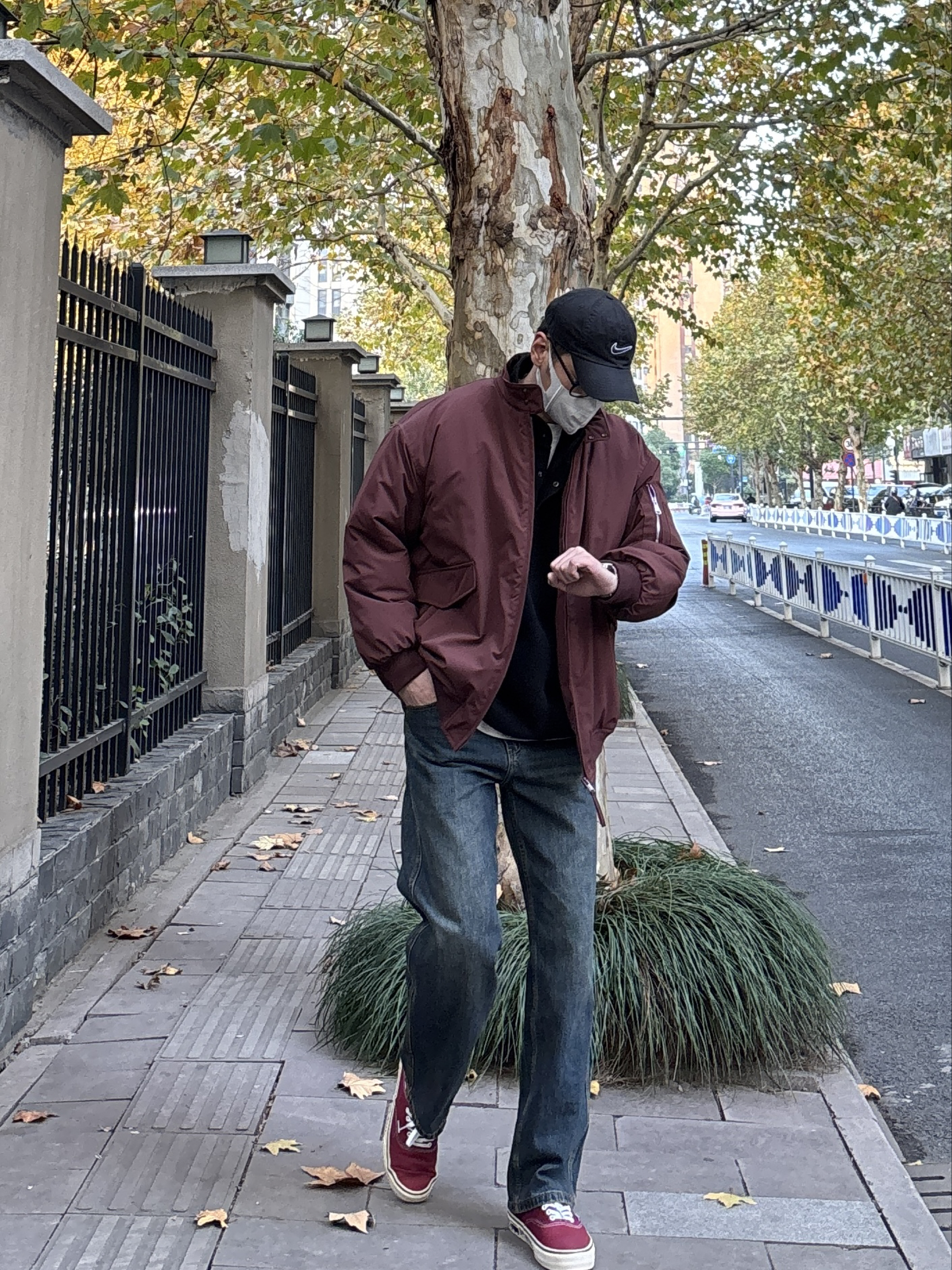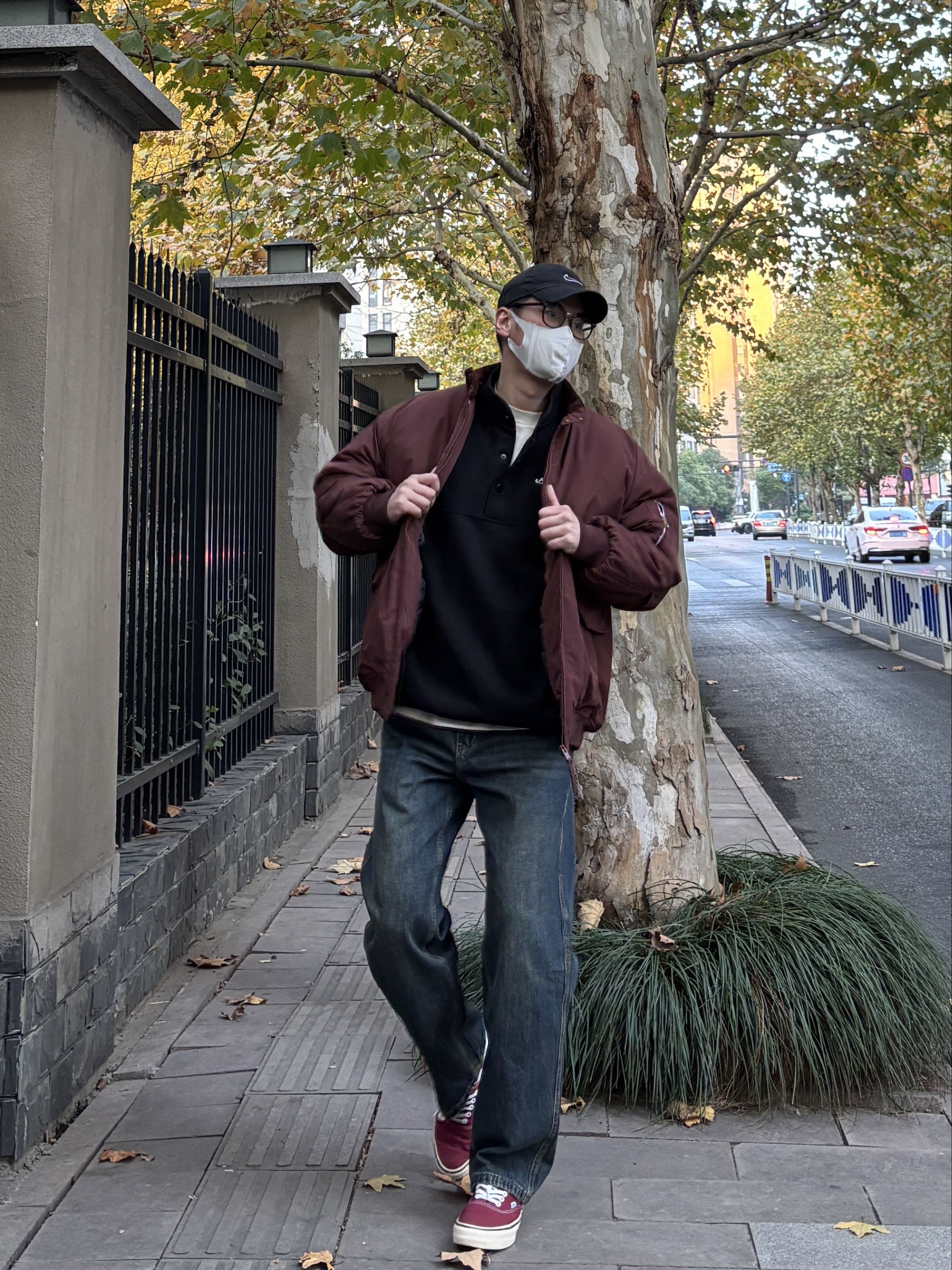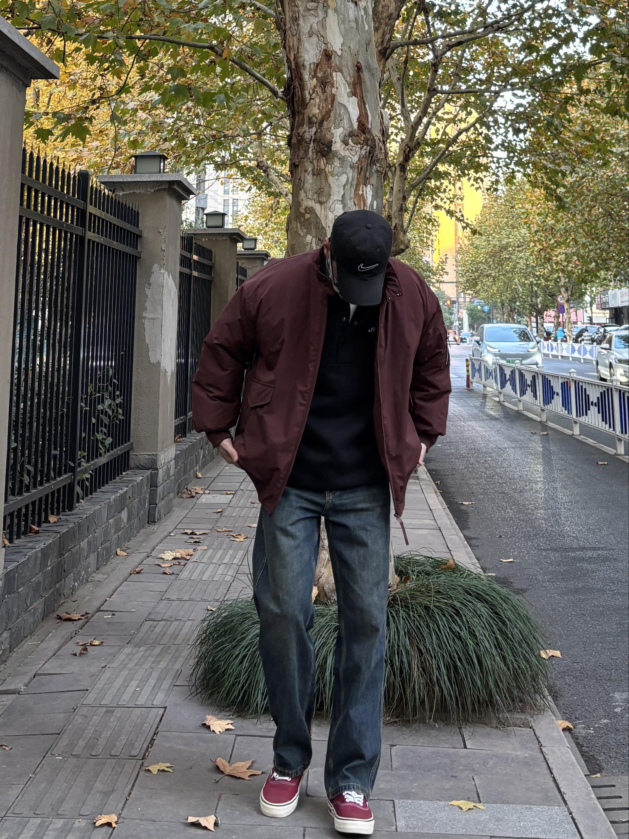 今天这套酒红色立领多口袋棉服夹克是核心 宽松版型叠穿黑色开胸纽扣卫衣 低调又高级 下装搭了蓝色直筒牛仔裤 水洗质感自带年代感 最后上脚和夹克同色系的涂鸦帆布低帮板鞋 整体色调统一又亮眼,复古味十足😎 - 衣服裤子:NICE LILI 鞋子:VANS红校车