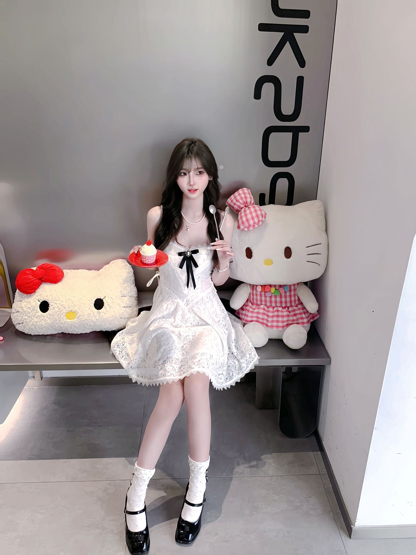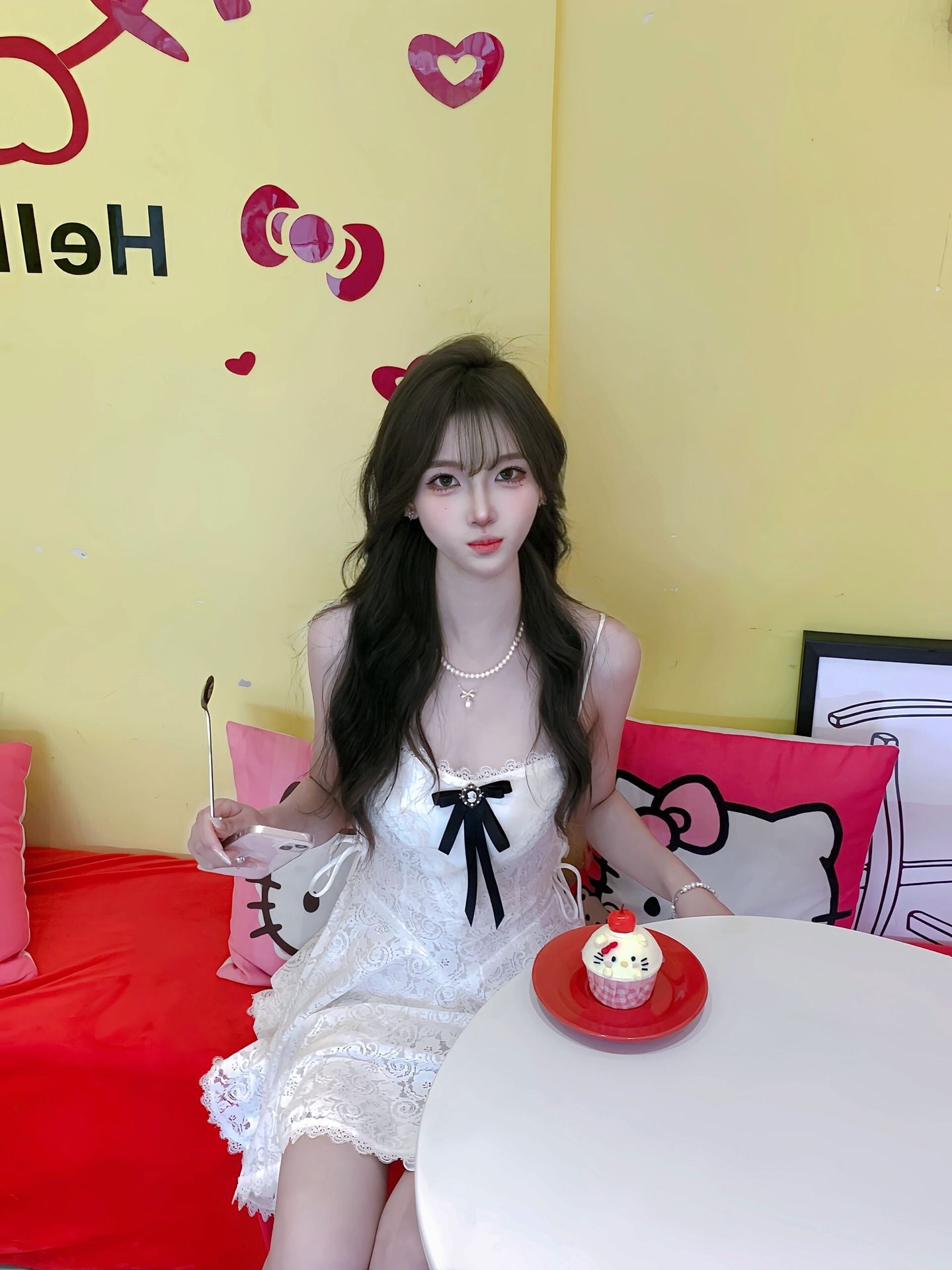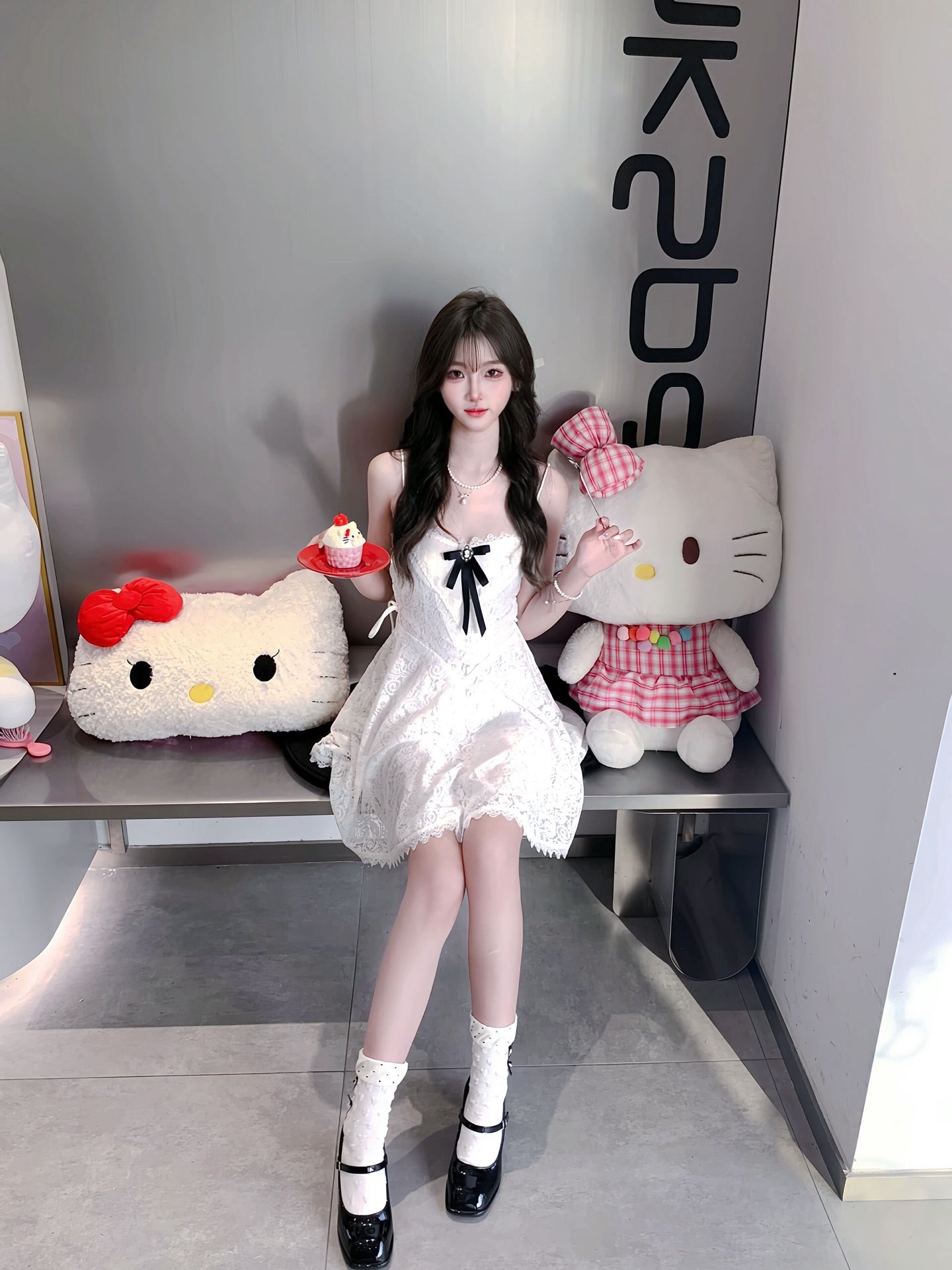 白色蕾丝吊带裙的穿搭分享来啦,蕾丝的花纹很精致,摸起来软软的很舒服。胸前的蝴蝶结设计甜而不腻,吊带的款式露出锁骨,很有小女人的味道。搭配珍珠项链增加了精致感,再配上Hello Kitty的玩偶和布景,少女心直接爆棚,日常出门穿也很吸睛。