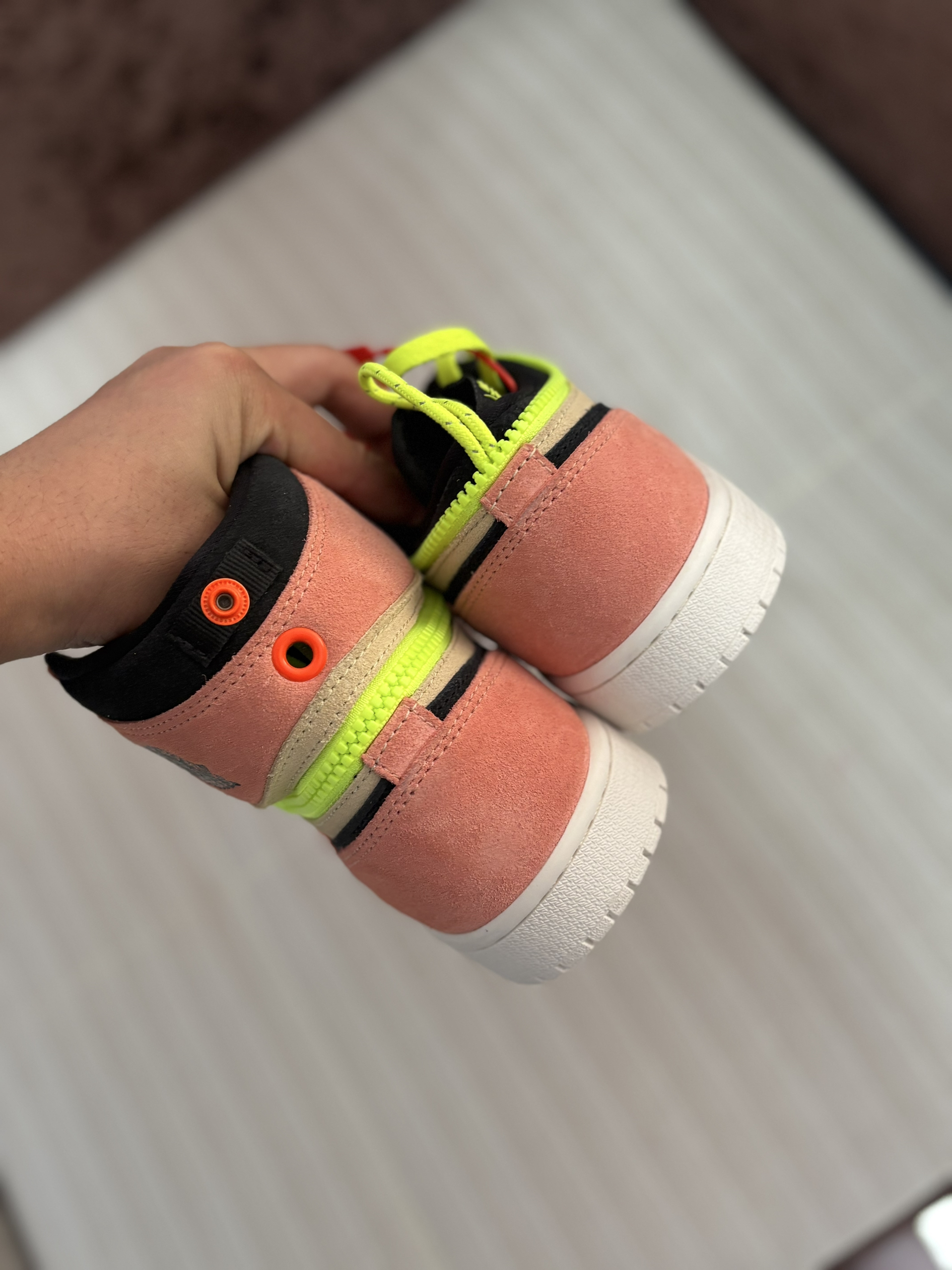 非常有特点的一双AJ1板鞋,拉链的设计很有创意,可以高低帮切换,一双鞋当两双穿