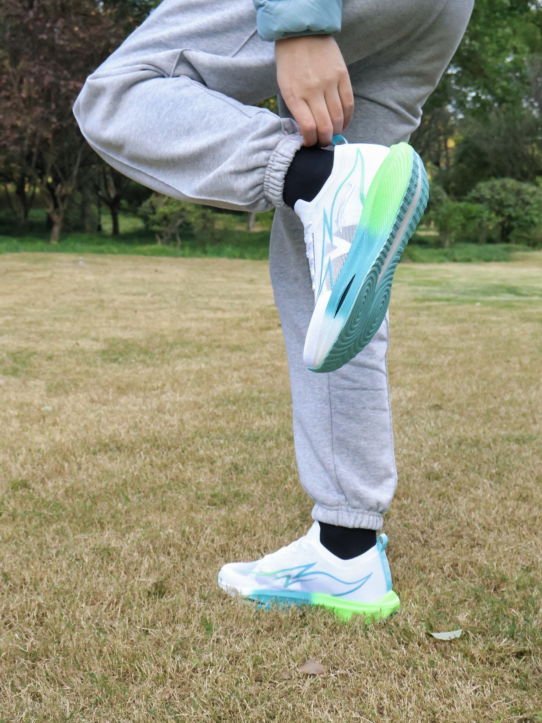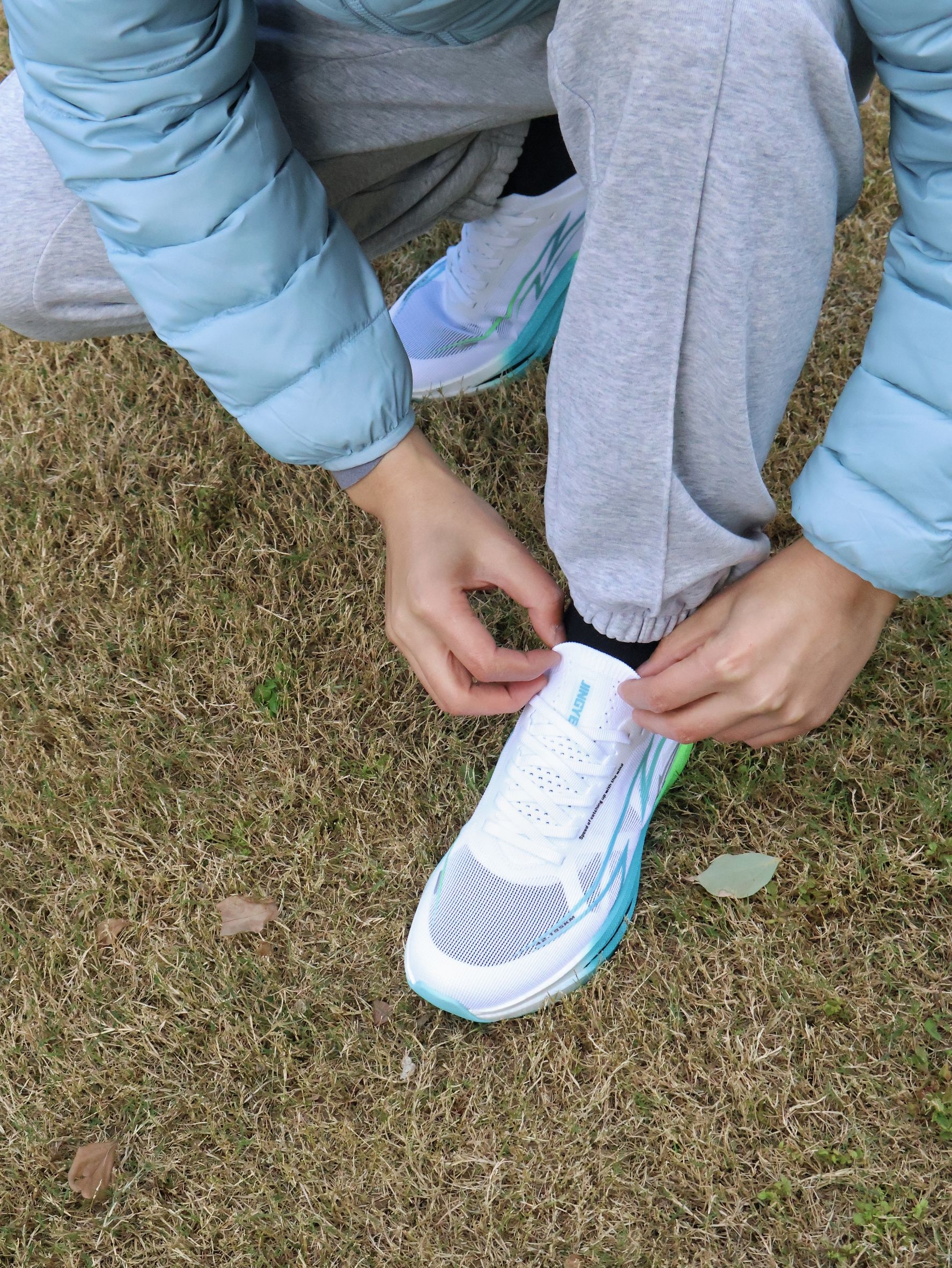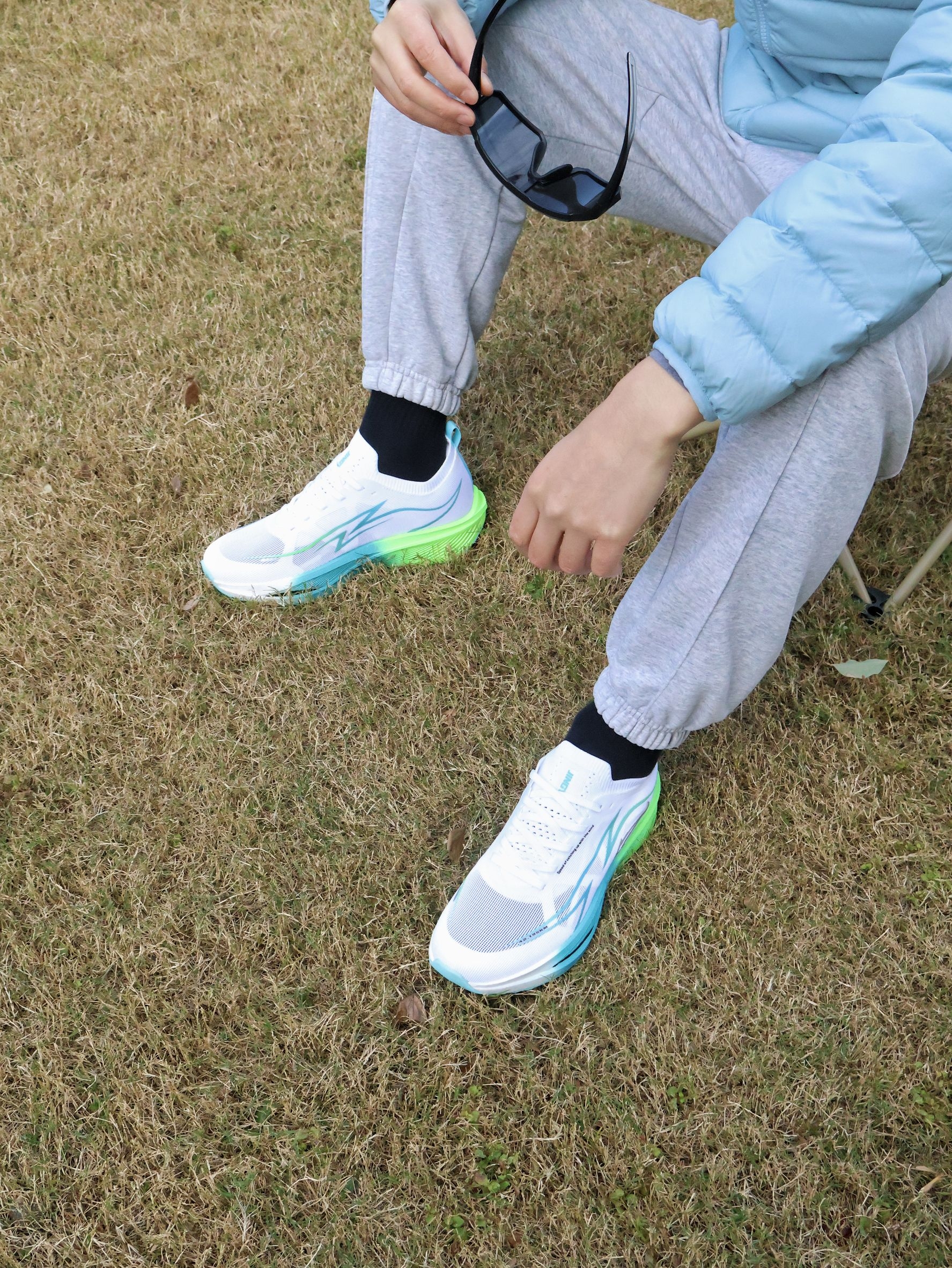 户外帅气的跑鞋|运动怎么能少了它~ 冬日户外运动跑鞋是我的好搭子~ 今天在公园户外活动下~ 上身简约排骨羽绒服~ 干净配色很帅气~ 搭配简约束脚卫裤~ 自竞也 舒适碳板跑鞋~鞋子的版型是很有型的~ 白蓝绿的拼色很帅气~ 整体的回弹也是很好的~ 适合冬日的户外和运动~ 尺码可以正常选码哦~不偏码哈~ 冬日户外跑鞋就穿它辣~