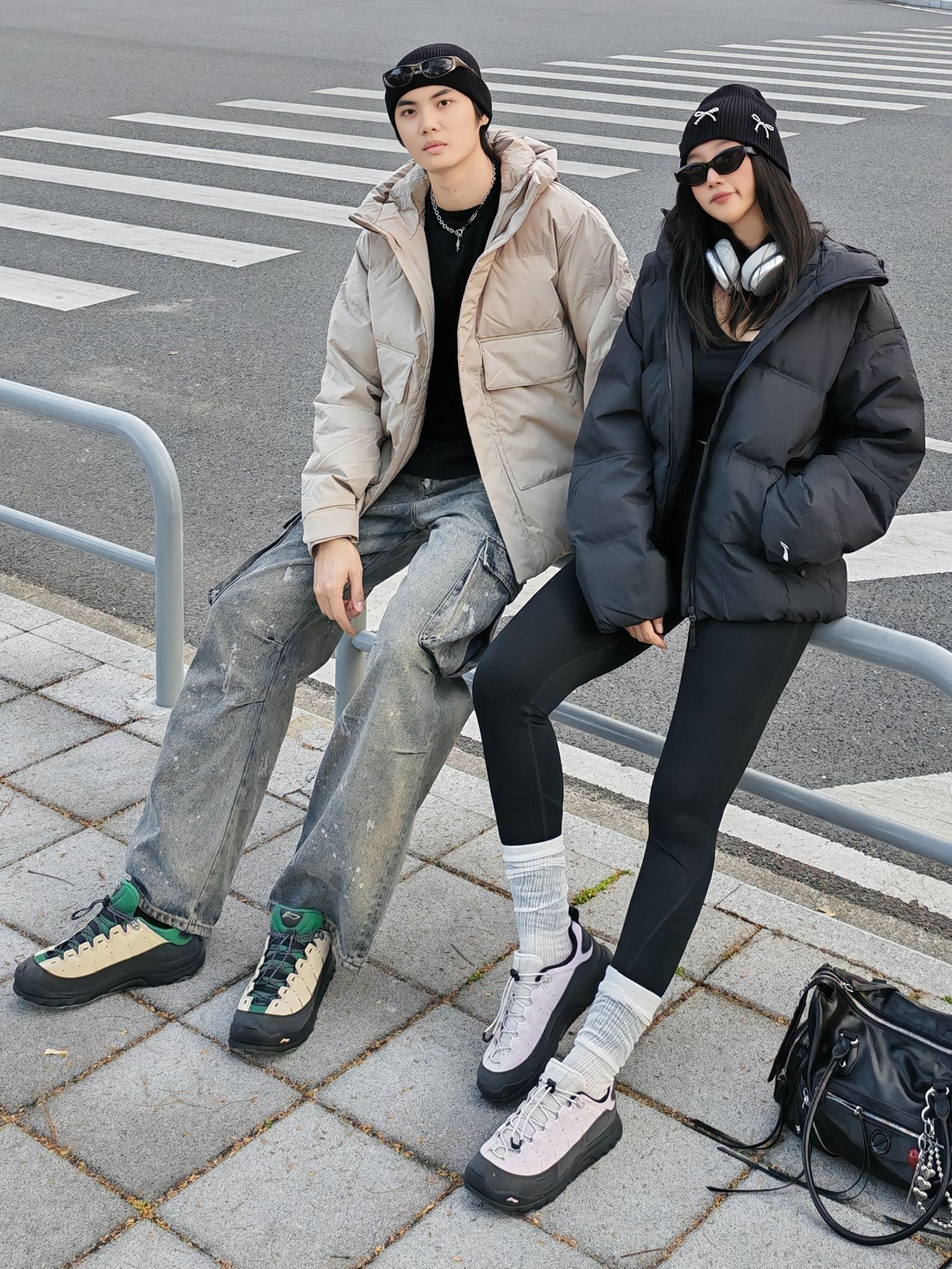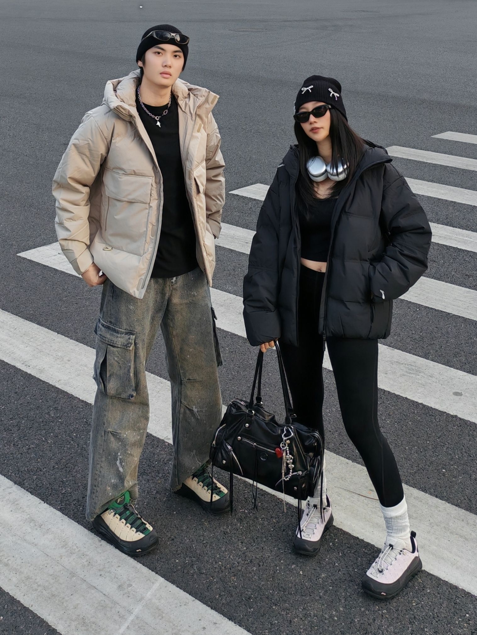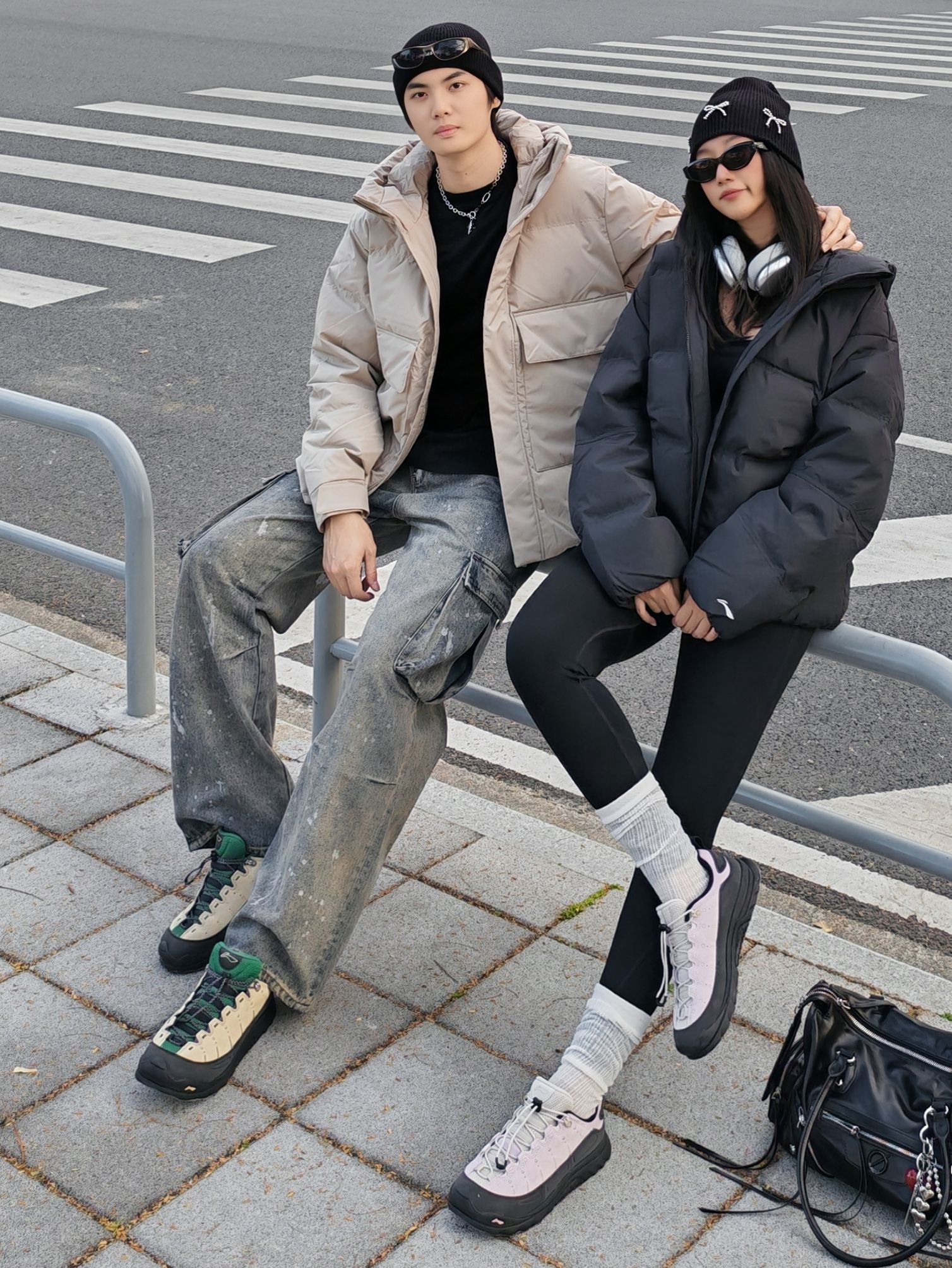 hi 这里是镭子的情侣穿搭分享 李宁 户外CF溯 面包羽绒服+做旧工装裤,这一身慵懒又痞帅👦 女友一身全黑辣妹风,李宁 短款羽绒服+瑜伽裤,露腰小心机显瘦又辣🌶️ 同元素毛线帽+李宁 CF溯 林韵 徒步鞋呼应,黑白配色适配度满分~ 街头氛围感直接拉满,降温天也能时髦不臃肿!