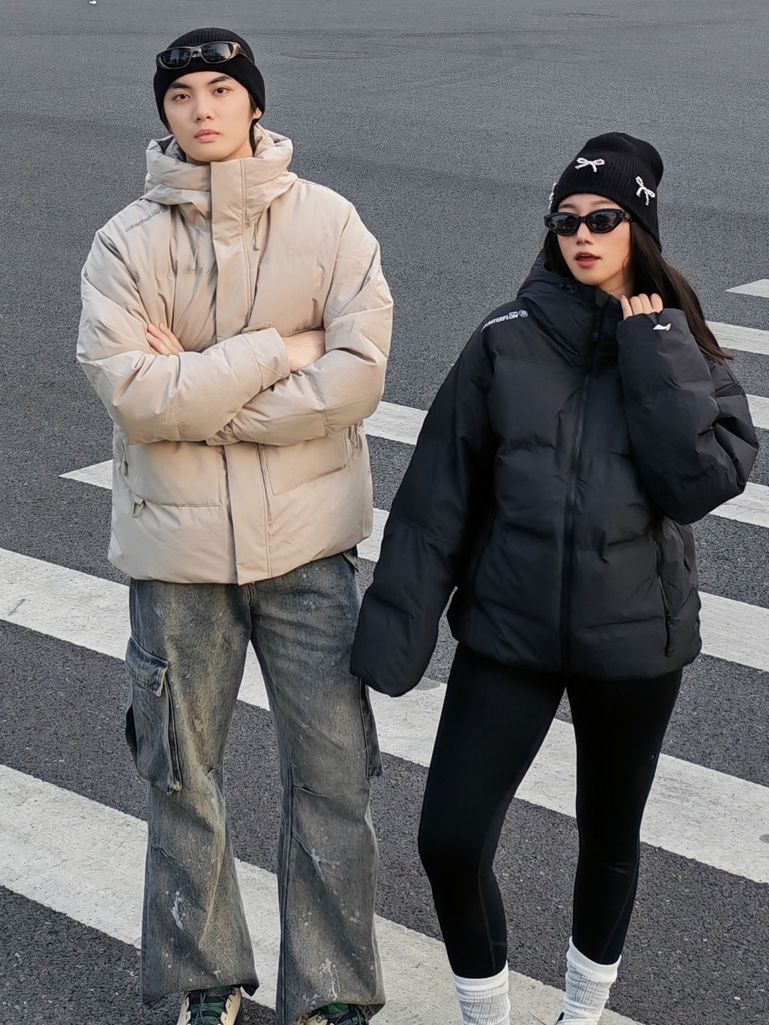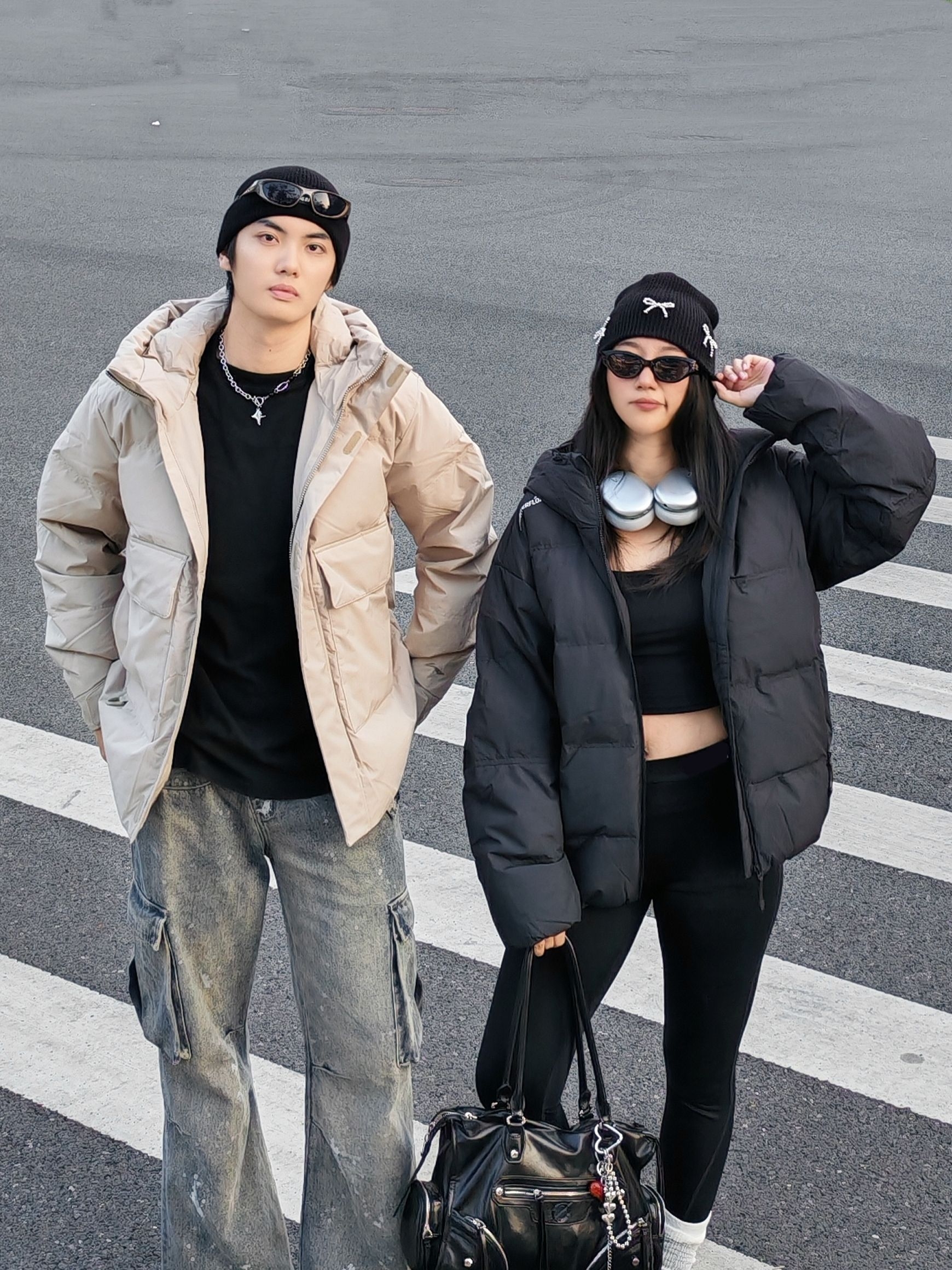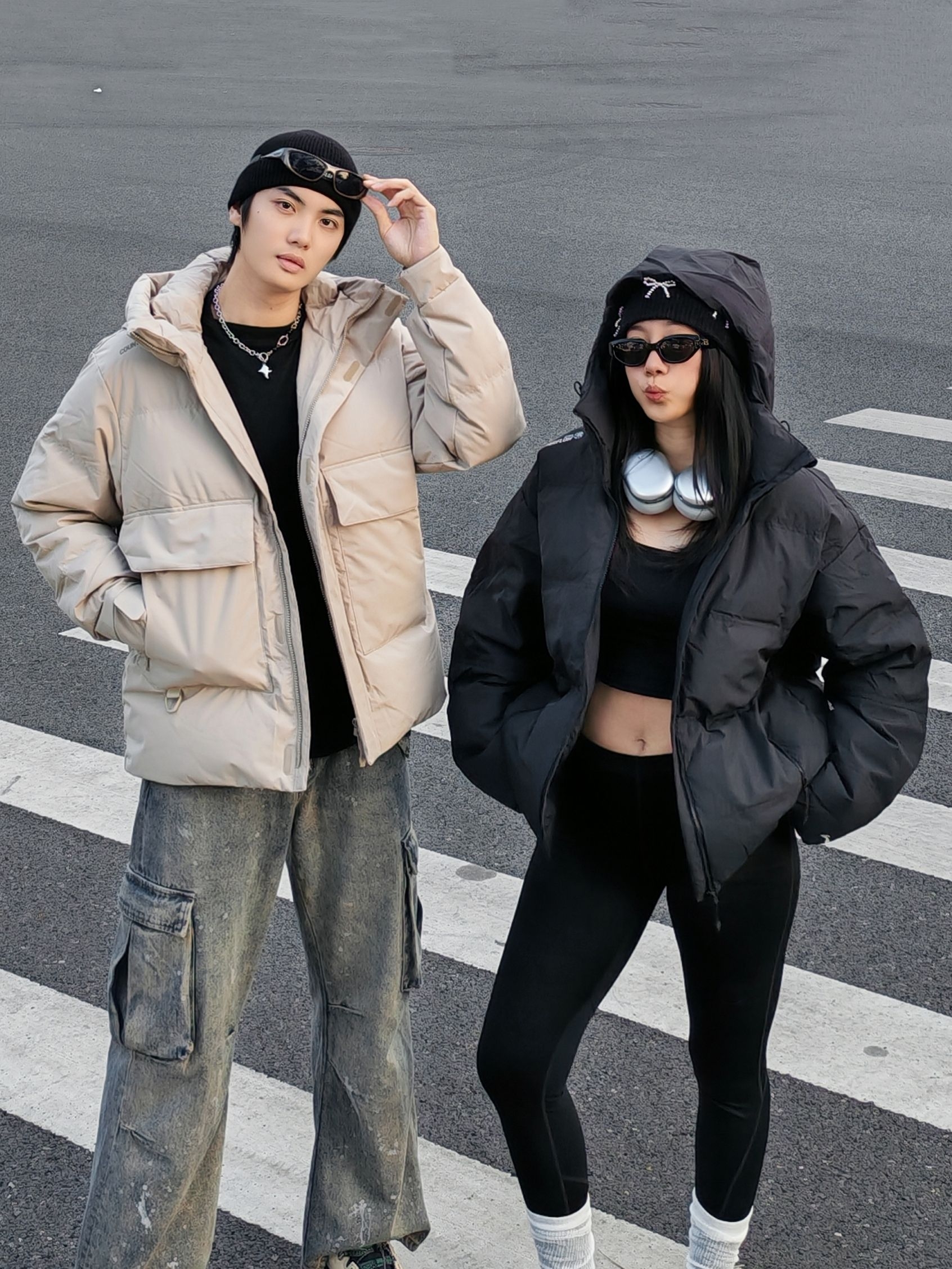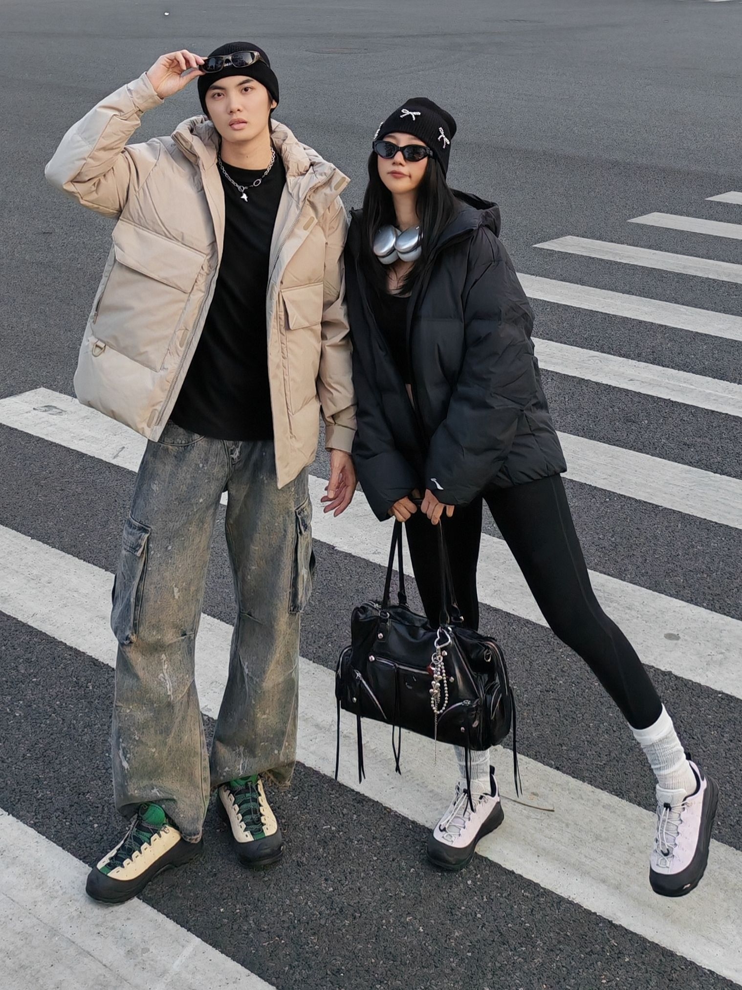 hi 这里是镭子的情侣穿搭分享 李宁 户外CF溯 面包羽绒服+做旧工装裤,这一身慵懒又痞帅👦 女友一身全黑辣妹风,李宁 短款羽绒服+瑜伽裤,露腰小心机显瘦又辣🌶️ 同元素毛线帽+李宁 CF溯 林韵 徒步鞋呼应,黑白配色适配度满分~ 街头氛围感直接拉满,降温天也能时髦不臃肿!