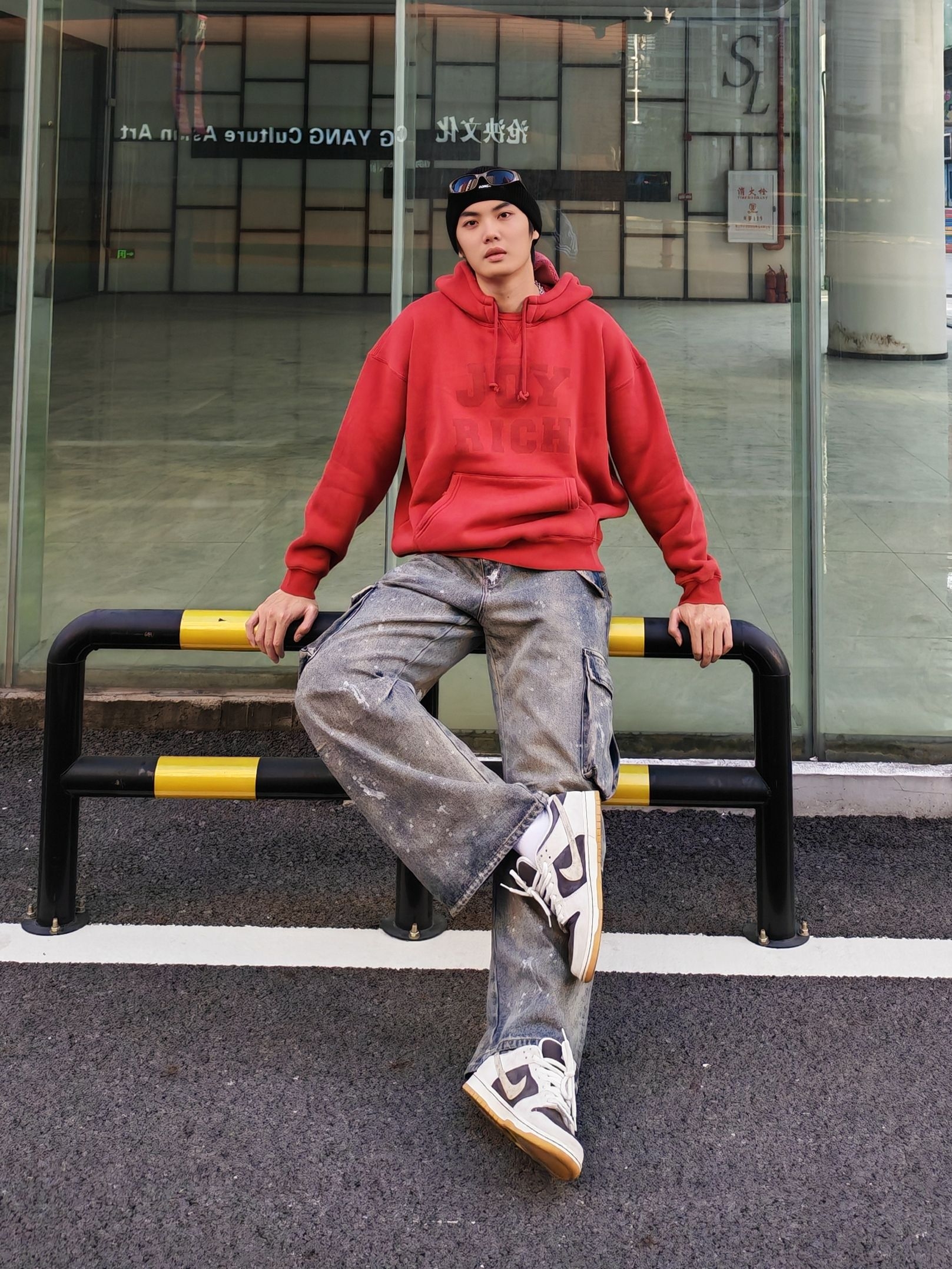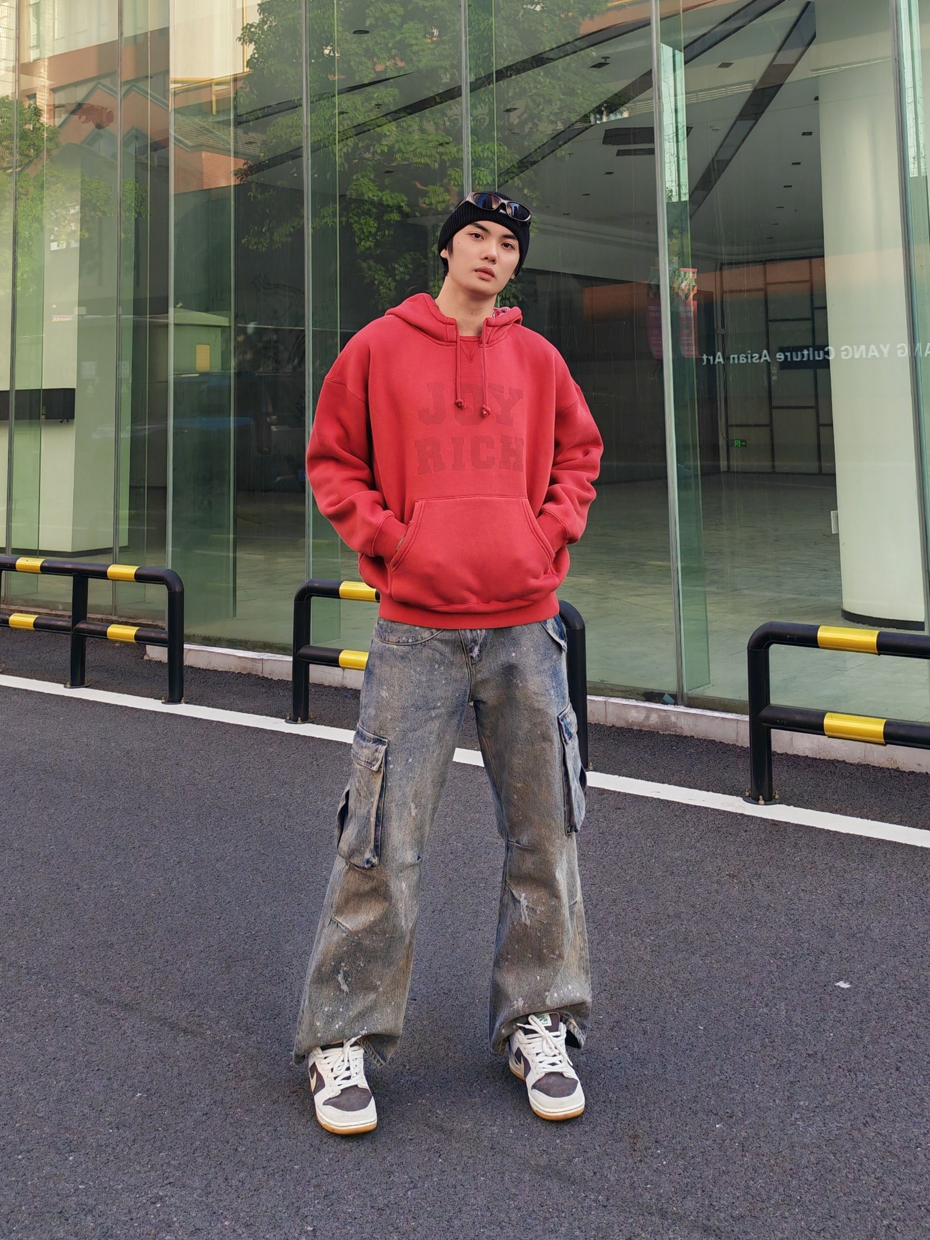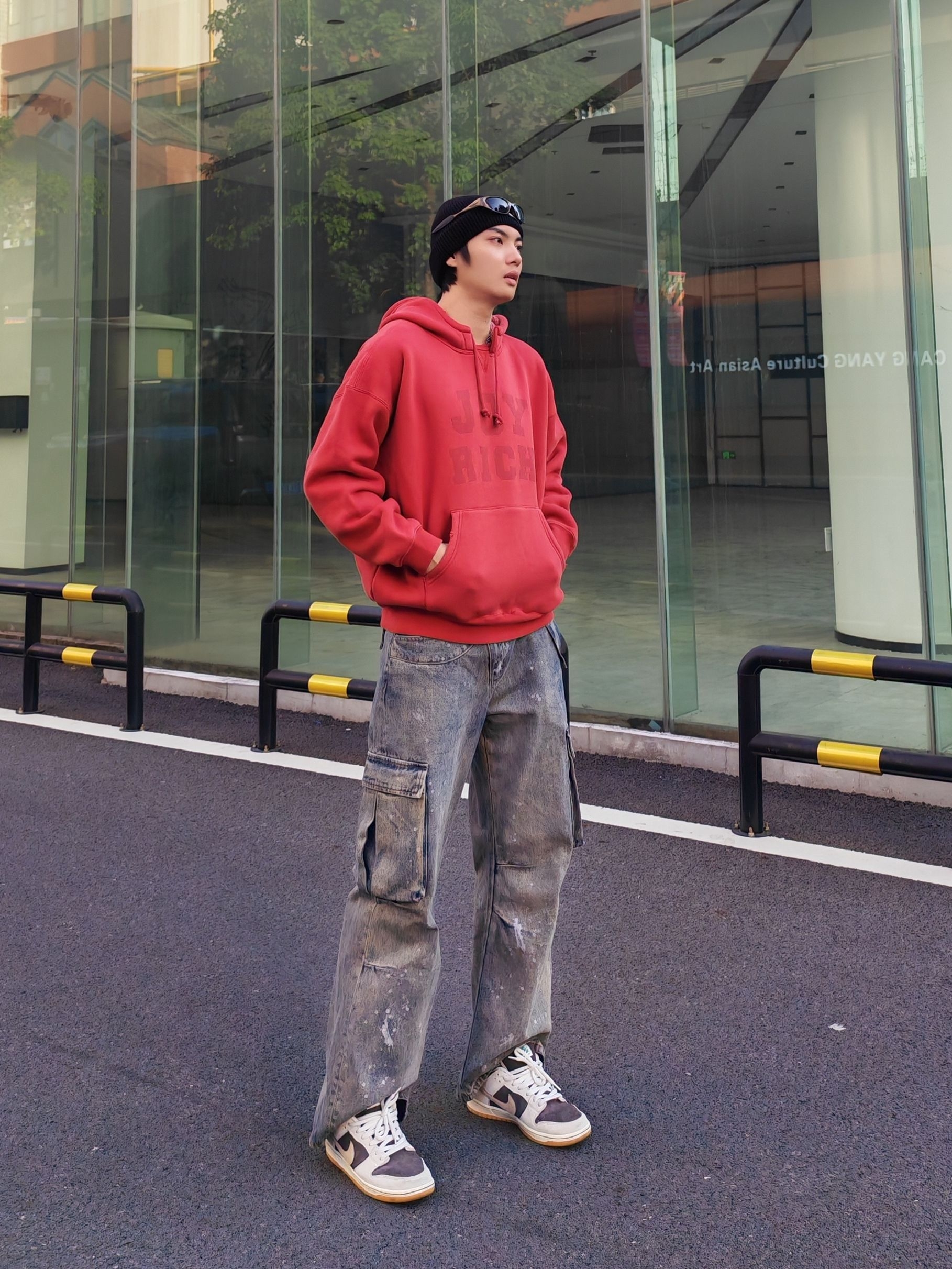 hi 这里是酷爱穿搭分享的镭子 正红色连帽卫衣超显白,oversize版型自带慵懒感 搭配做旧泼墨阔腿工装牛仔,复古又有细节 脚下是奶茶底拼色球鞋,中和一身的硬朗 随便往路边一坐,潮酷氛围感直接拉满!