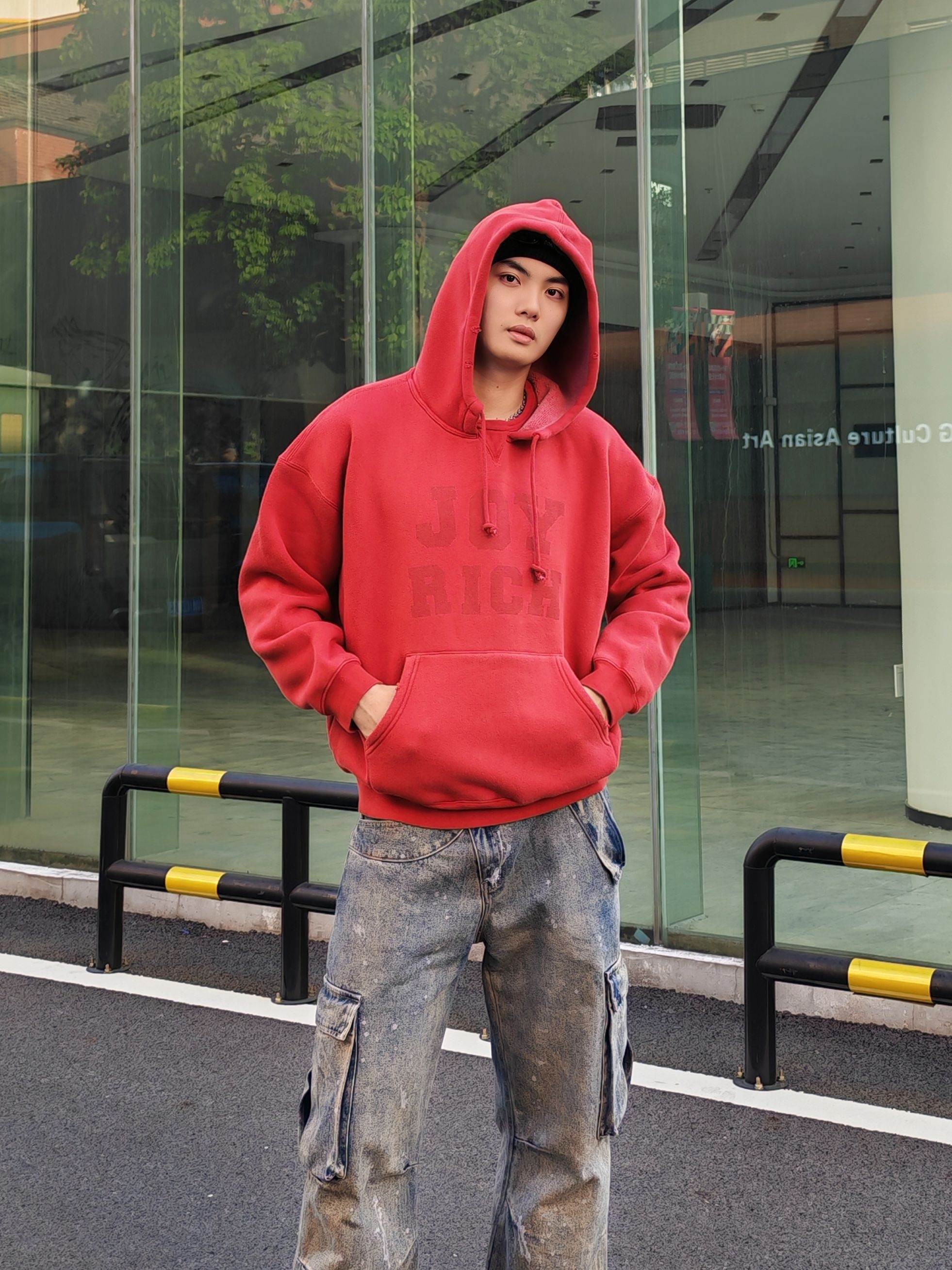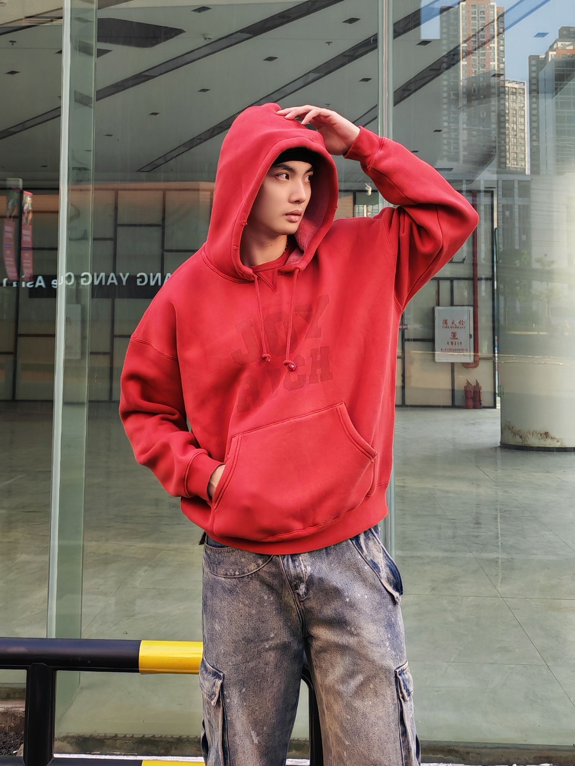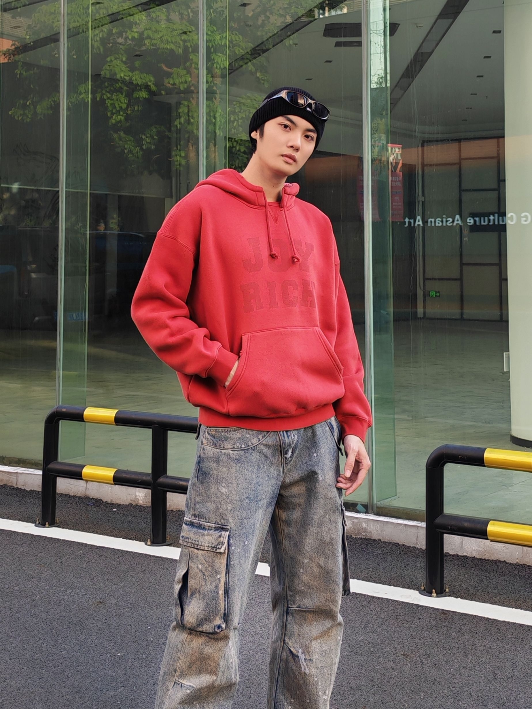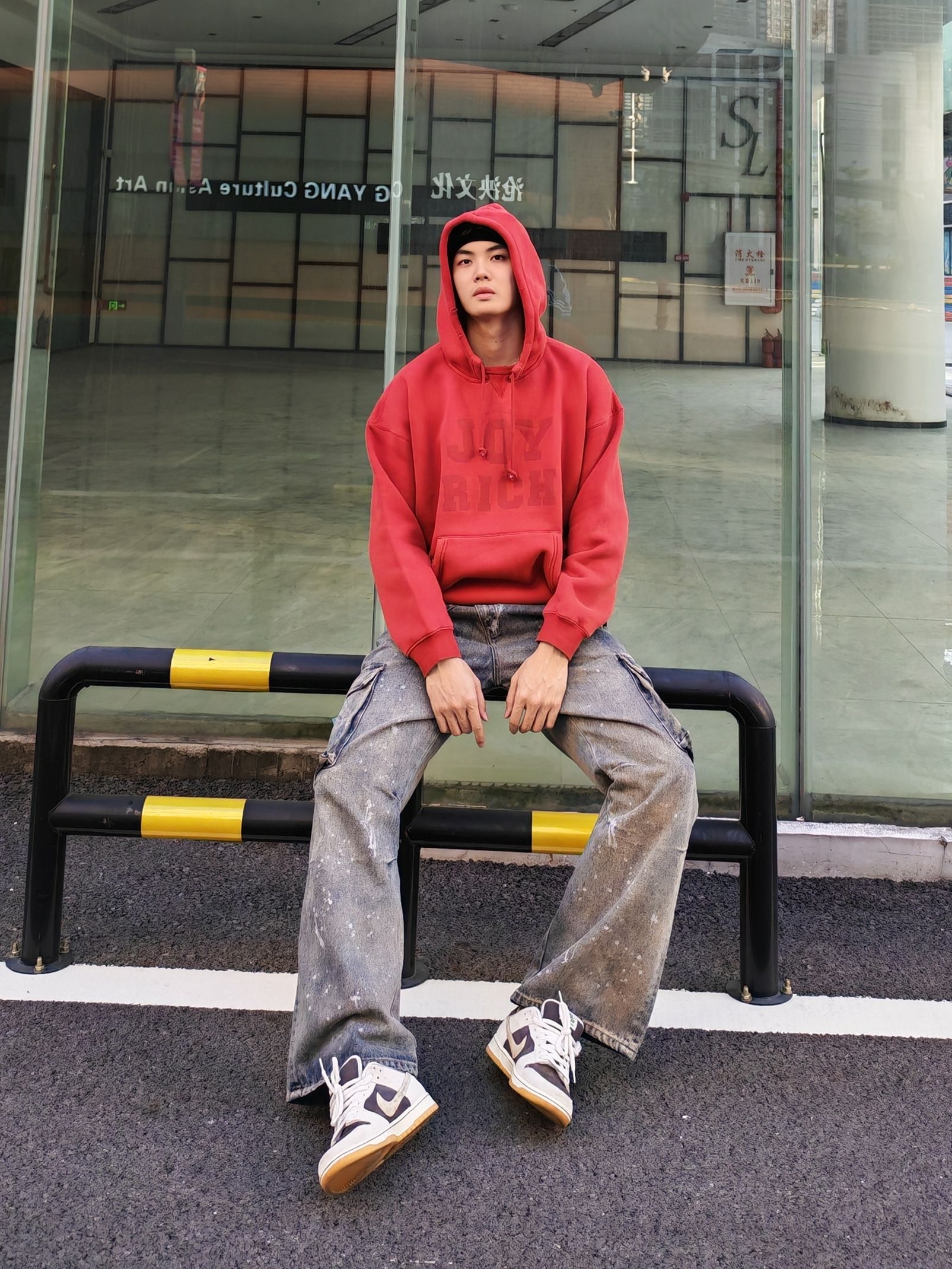 hi 这里是酷爱穿搭分享的镭子 正红色连帽卫衣超显白,oversize版型自带慵懒感 搭配做旧泼墨阔腿工装牛仔,复古又有细节 脚下是奶茶底拼色球鞋,中和一身的硬朗 随便往路边一坐,潮酷氛围感直接拉满!