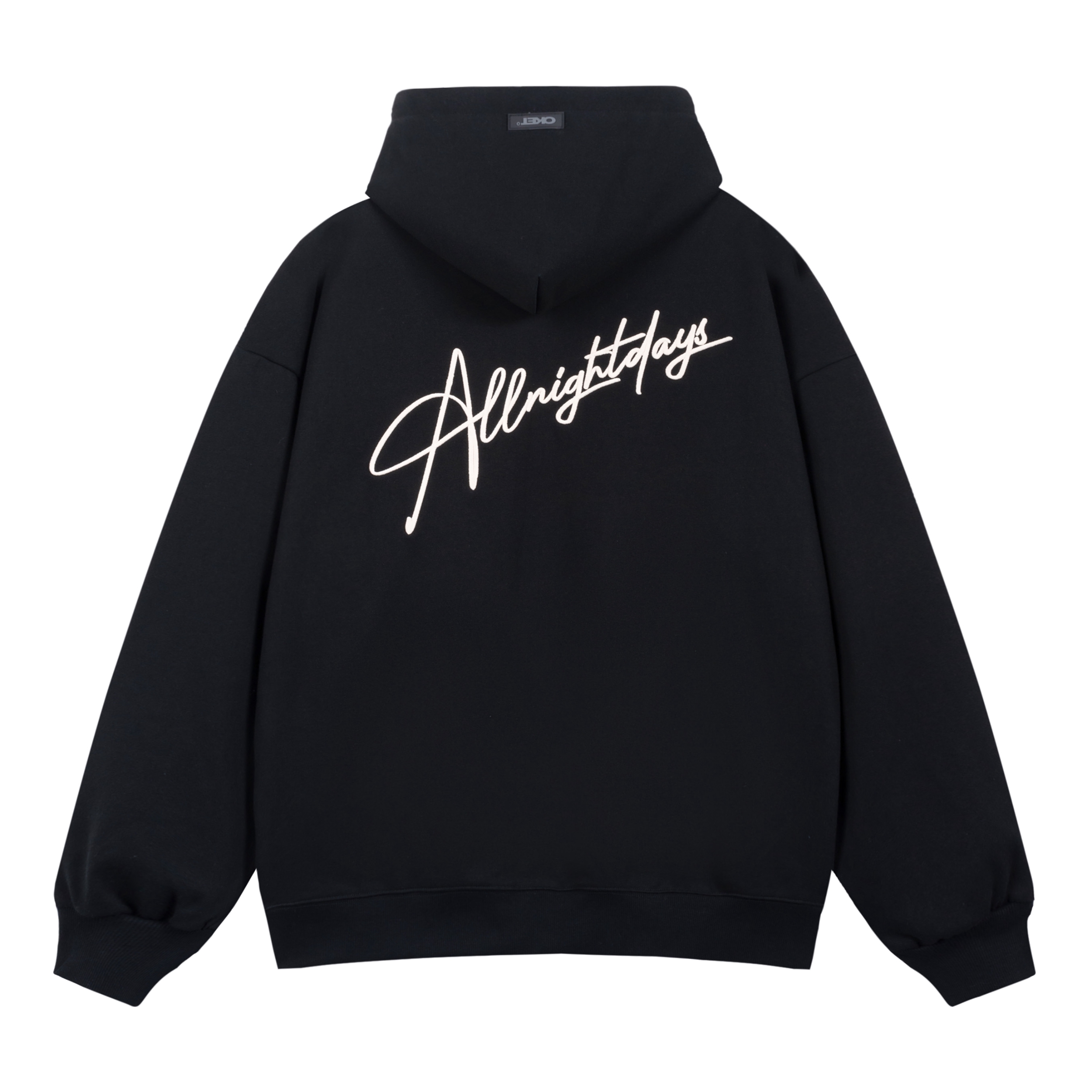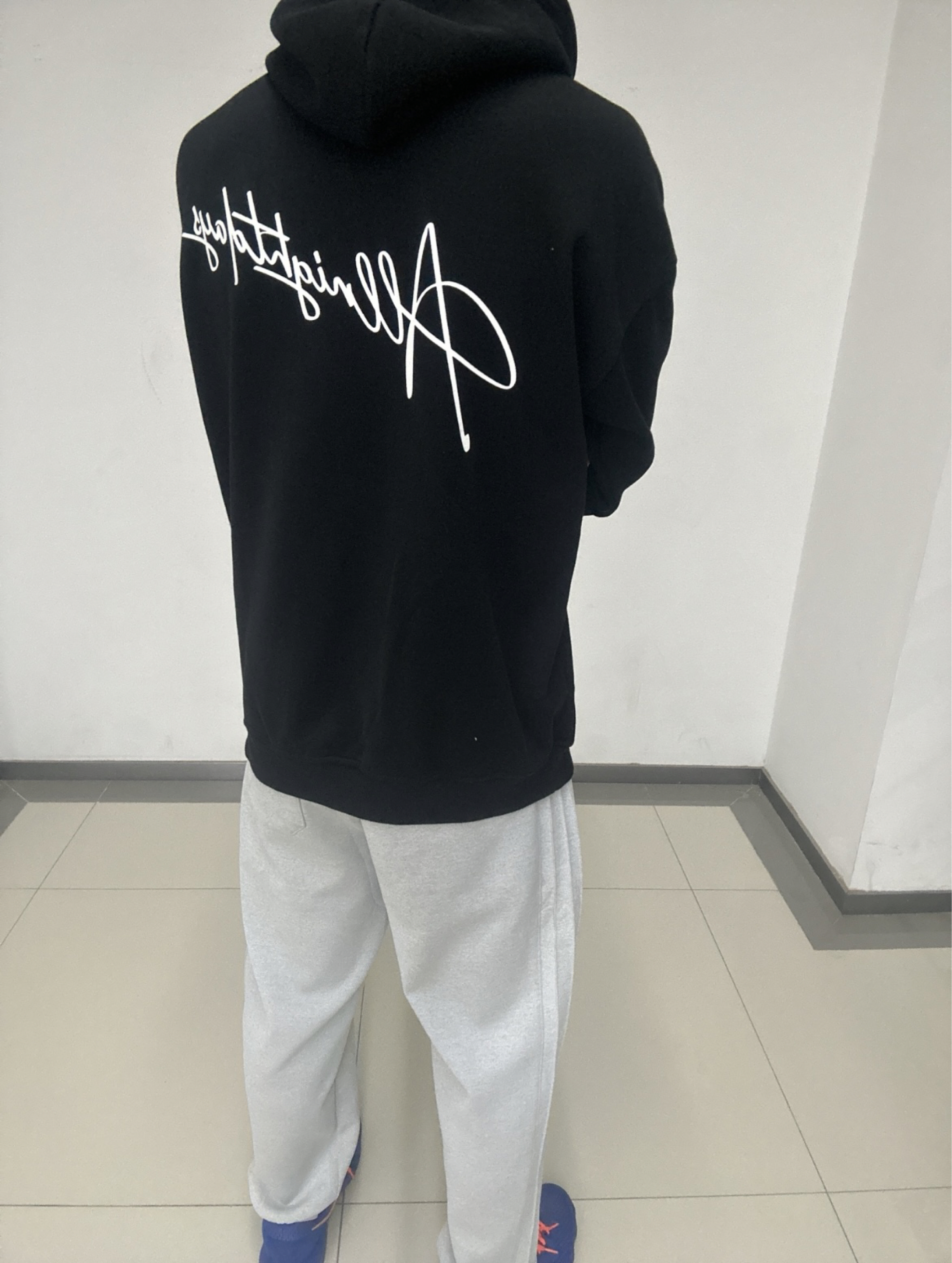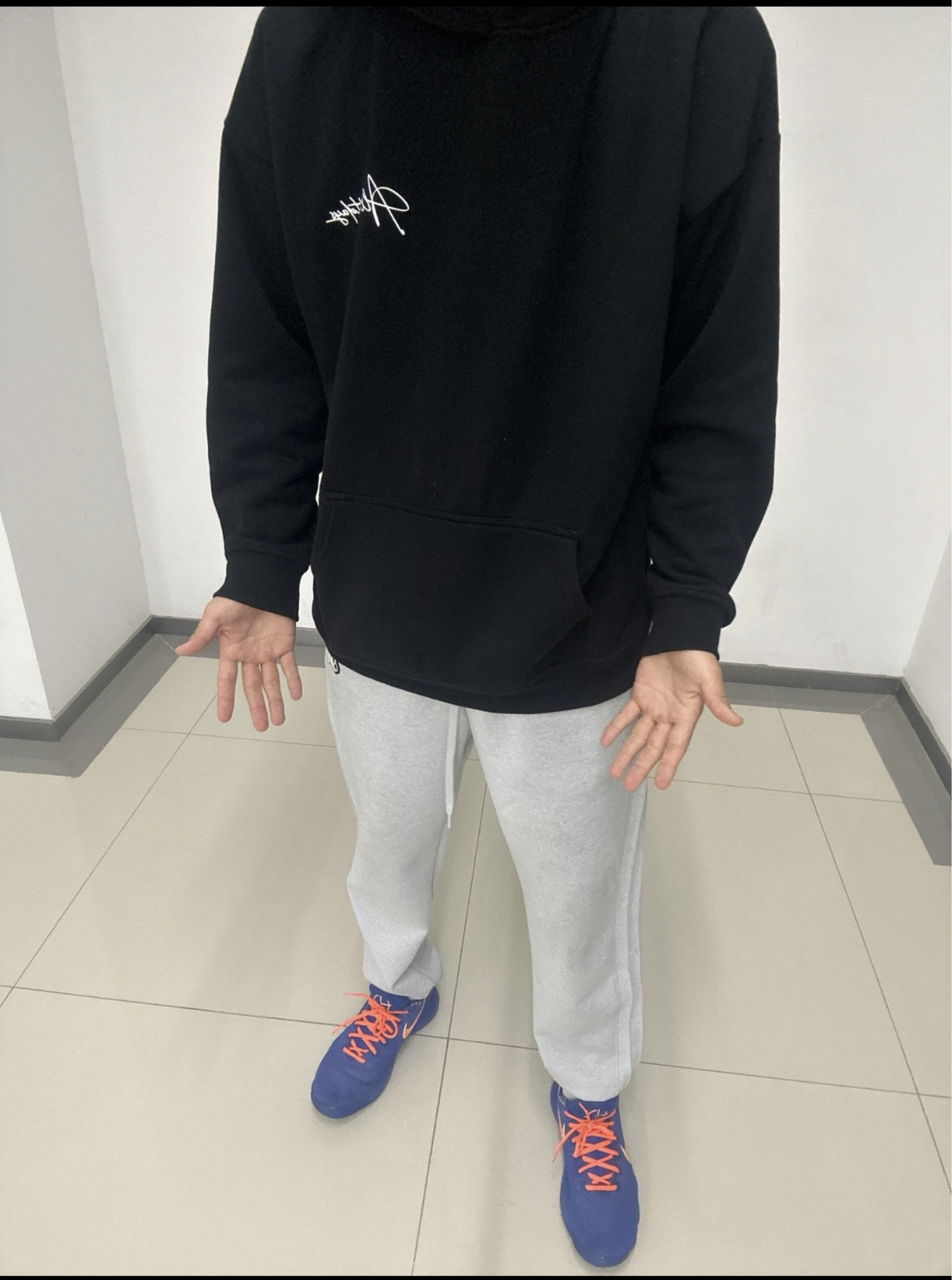 这件卫衣是黑色的连帽款式,整体为纯色,仅在左胸位置有一个白色的签名式刺绣Logo,设计简约又有细节。 卫衣的版型宽松,衣身长度适中,下摆是常规的直边剪裁,搭配了一个袋鼠口袋,方便放置小物件。袖子是长袖设计,袖口为罗纹收边,领口也是连帽款的罗纹领口。 整体风格休闲舒适,带有运动感,很适合日常穿搭。