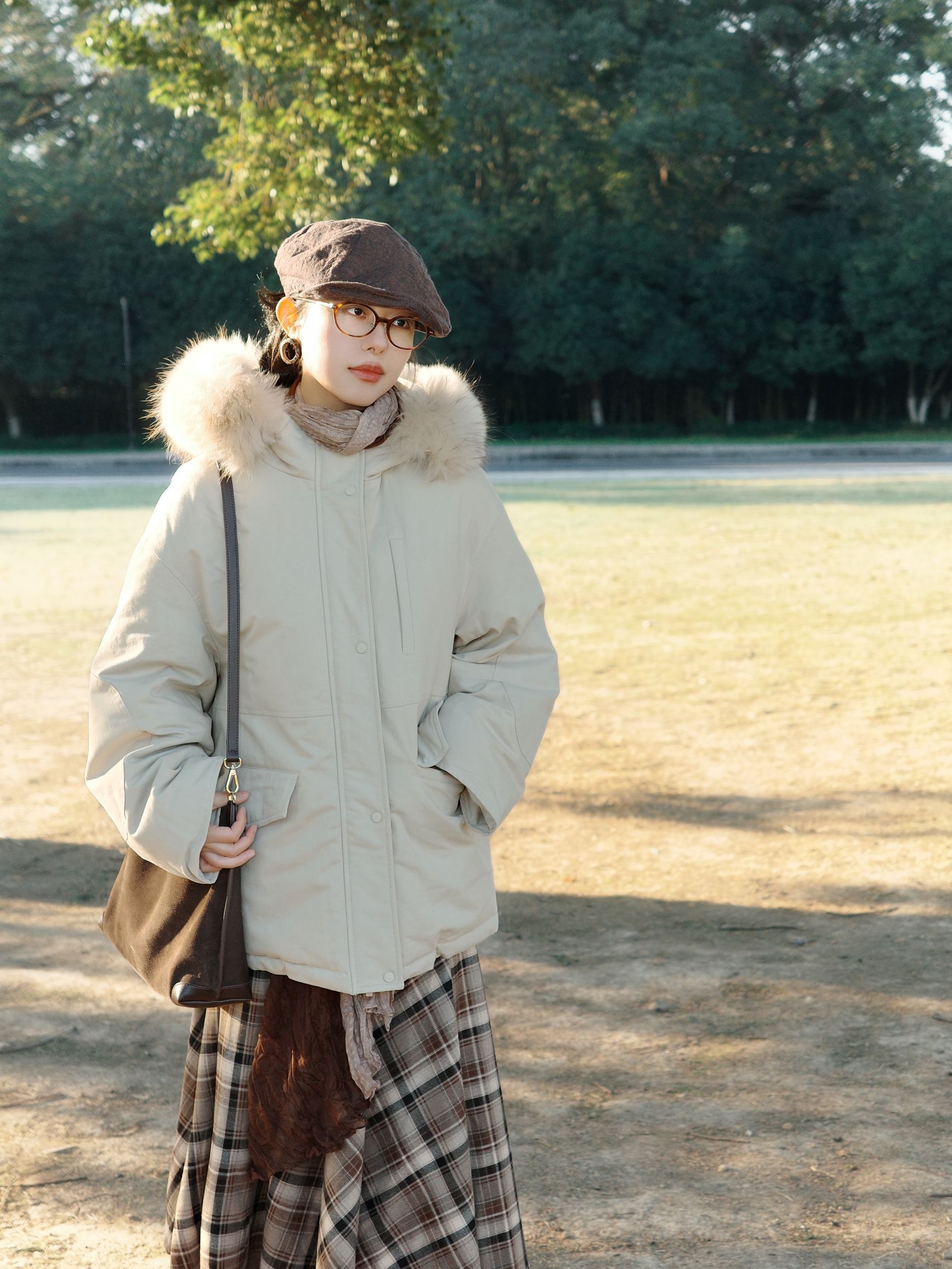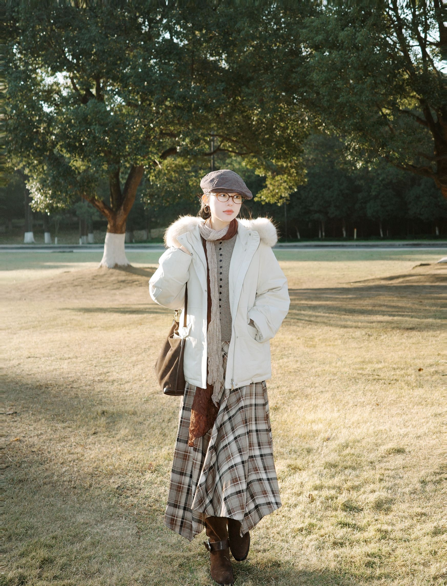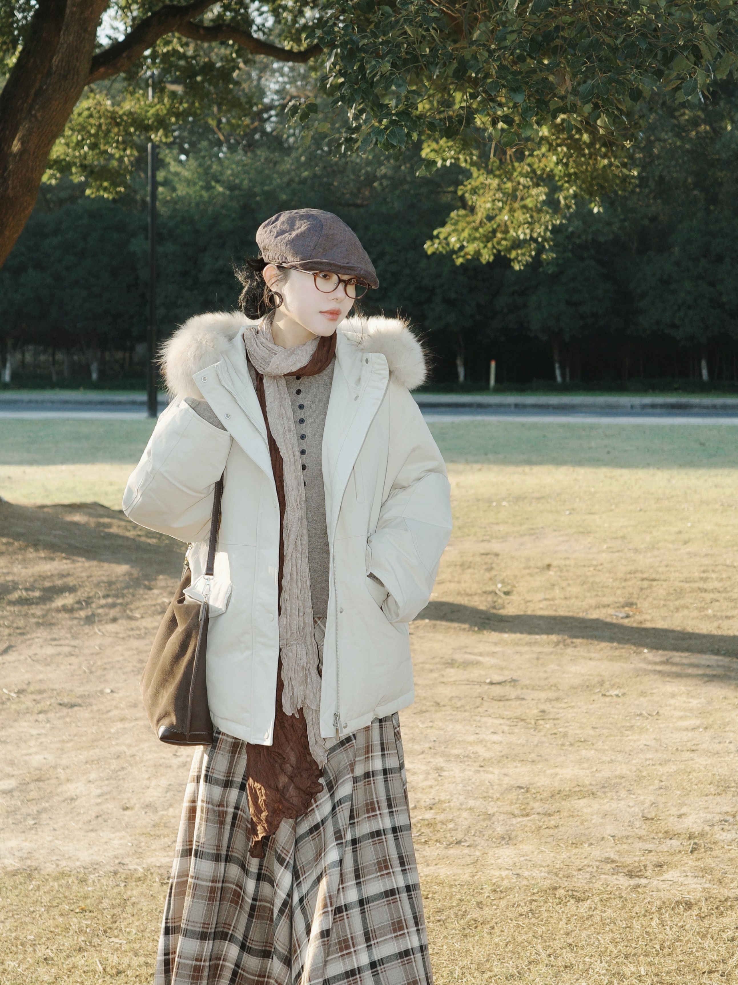 秋末冬初的风开始带着凉意,太阳照在身上暖烘烘的,这套搭配刚好把温度和氛围都抓牢。 米白色派克羽绒服带着蓬松毛领,内搭卡其色针织打底下叠穿棕色格纹连衣裙,脖子上绕着拼色围巾,搭配的细节里全是小心思,整体很有复古氛围感。 米白、卡其、棕色的配色像把深秋的暖色调穿在身上,不管是去公园散步还是坐在长椅上晒太阳,这套搭配都能让身体和心情一起放松下来,实用又好看。