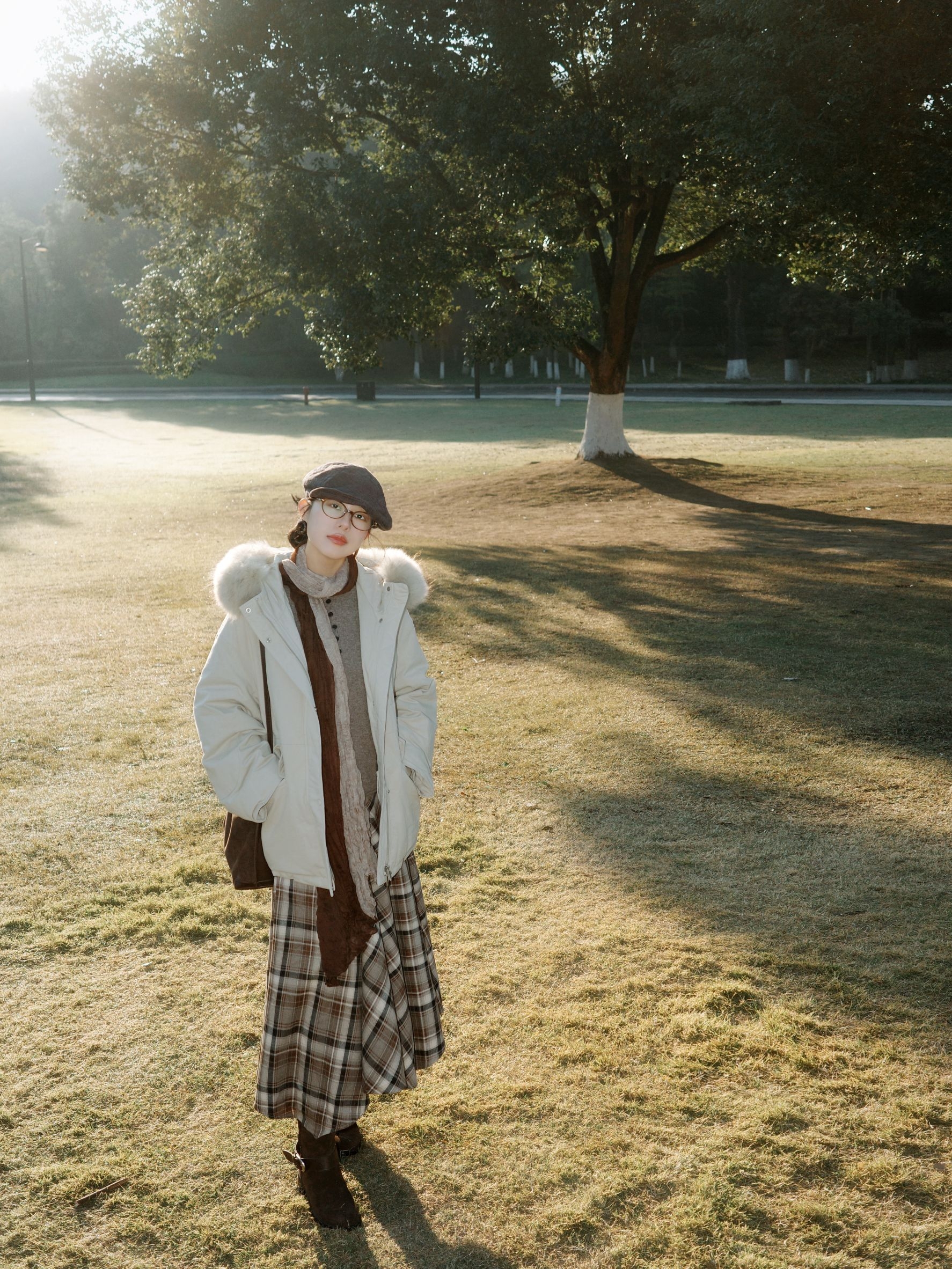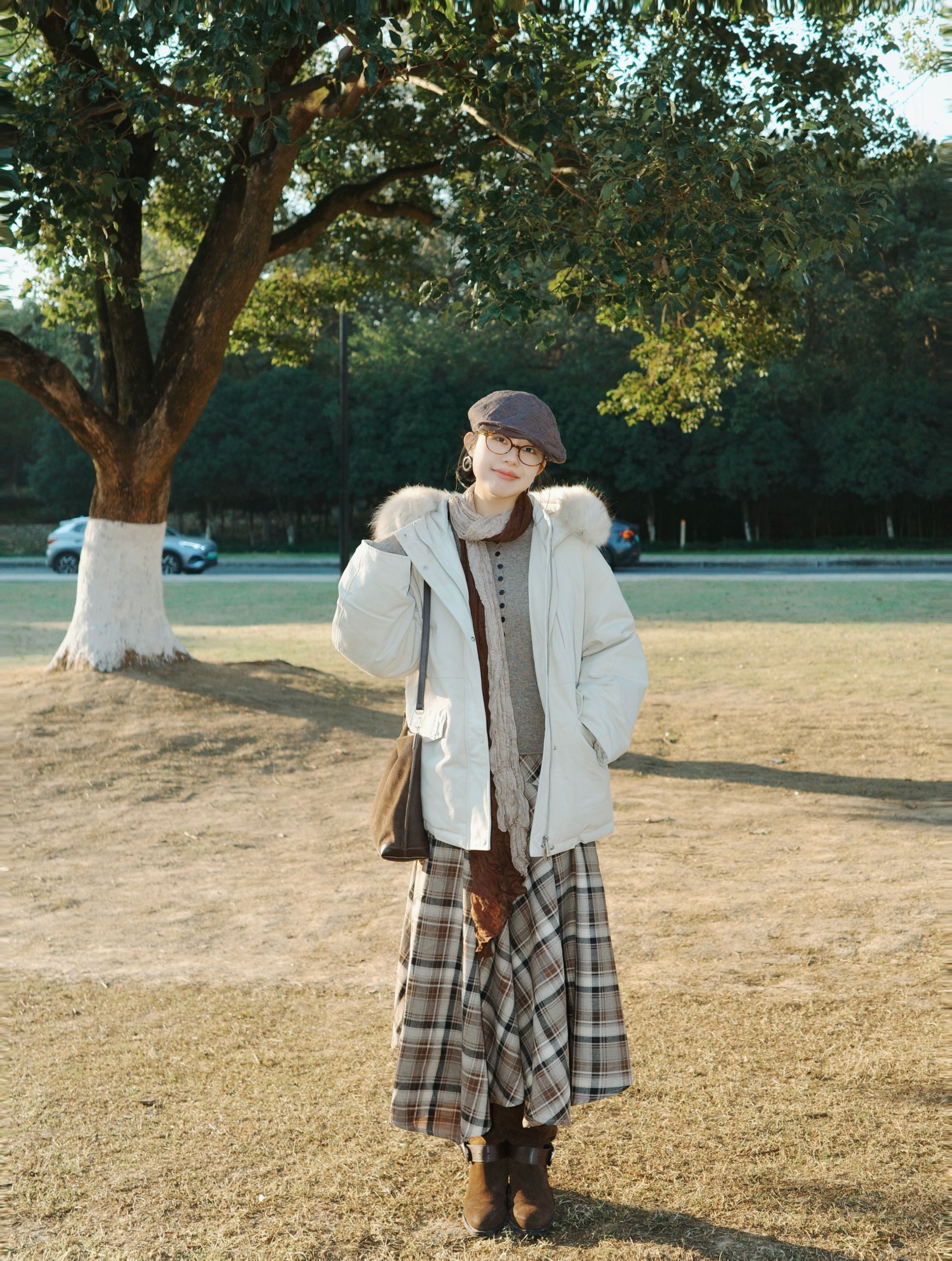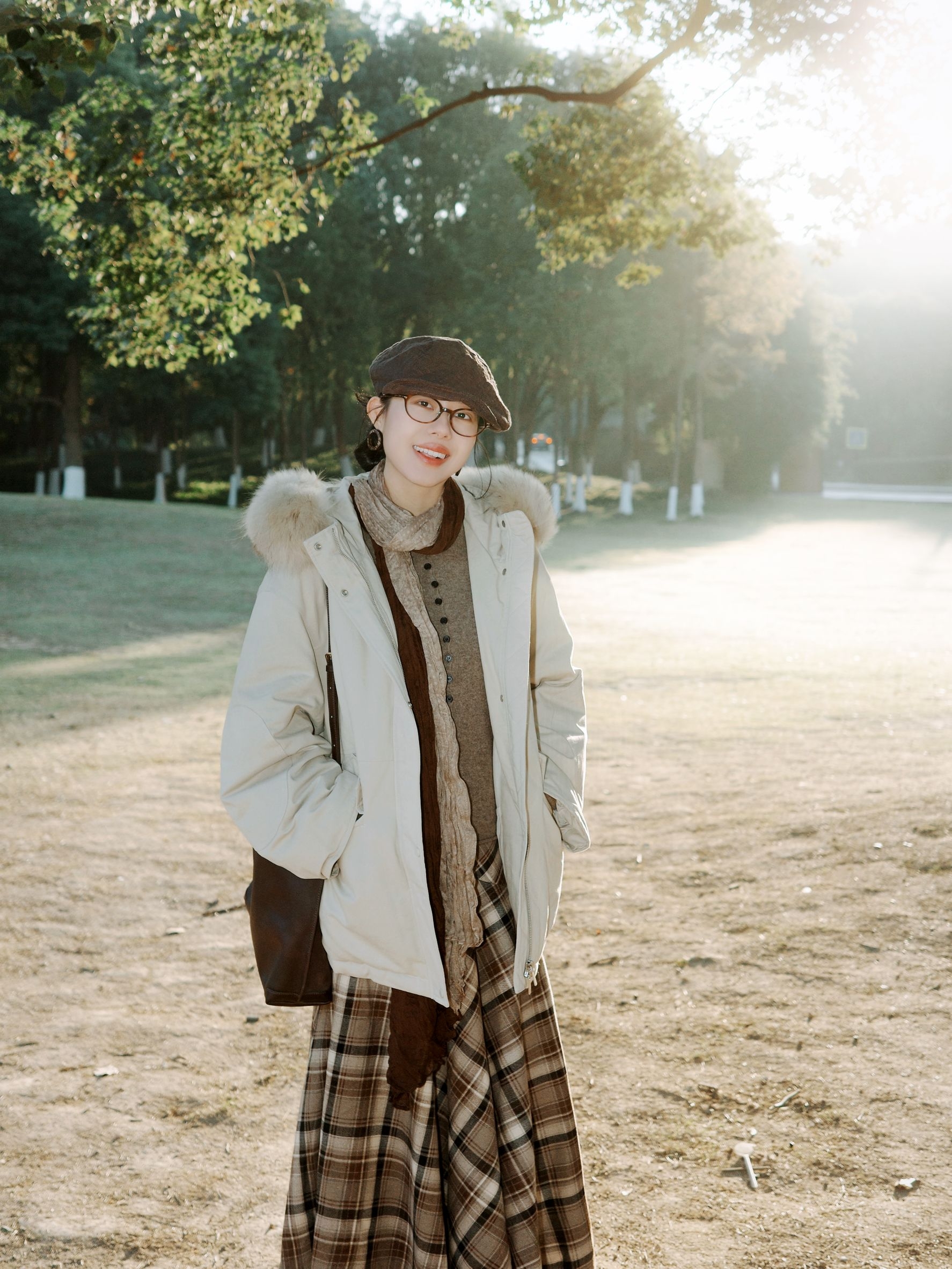 秋末冬初的风开始带着凉意,太阳照在身上暖烘烘的,这套搭配刚好把温度和氛围都抓牢。 米白色派克羽绒服带着蓬松毛领,内搭卡其色针织打底下叠穿棕色格纹连衣裙,脖子上绕着拼色围巾,搭配的细节里全是小心思,整体很有复古氛围感。 米白、卡其、棕色的配色像把深秋的暖色调穿在身上,不管是去公园散步还是坐在长椅上晒太阳,这套搭配都能让身体和心情一起放松下来,实用又好看。