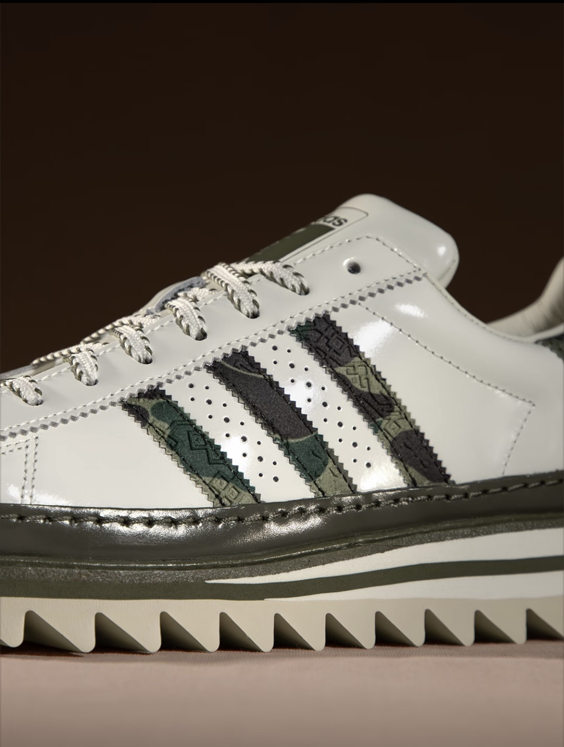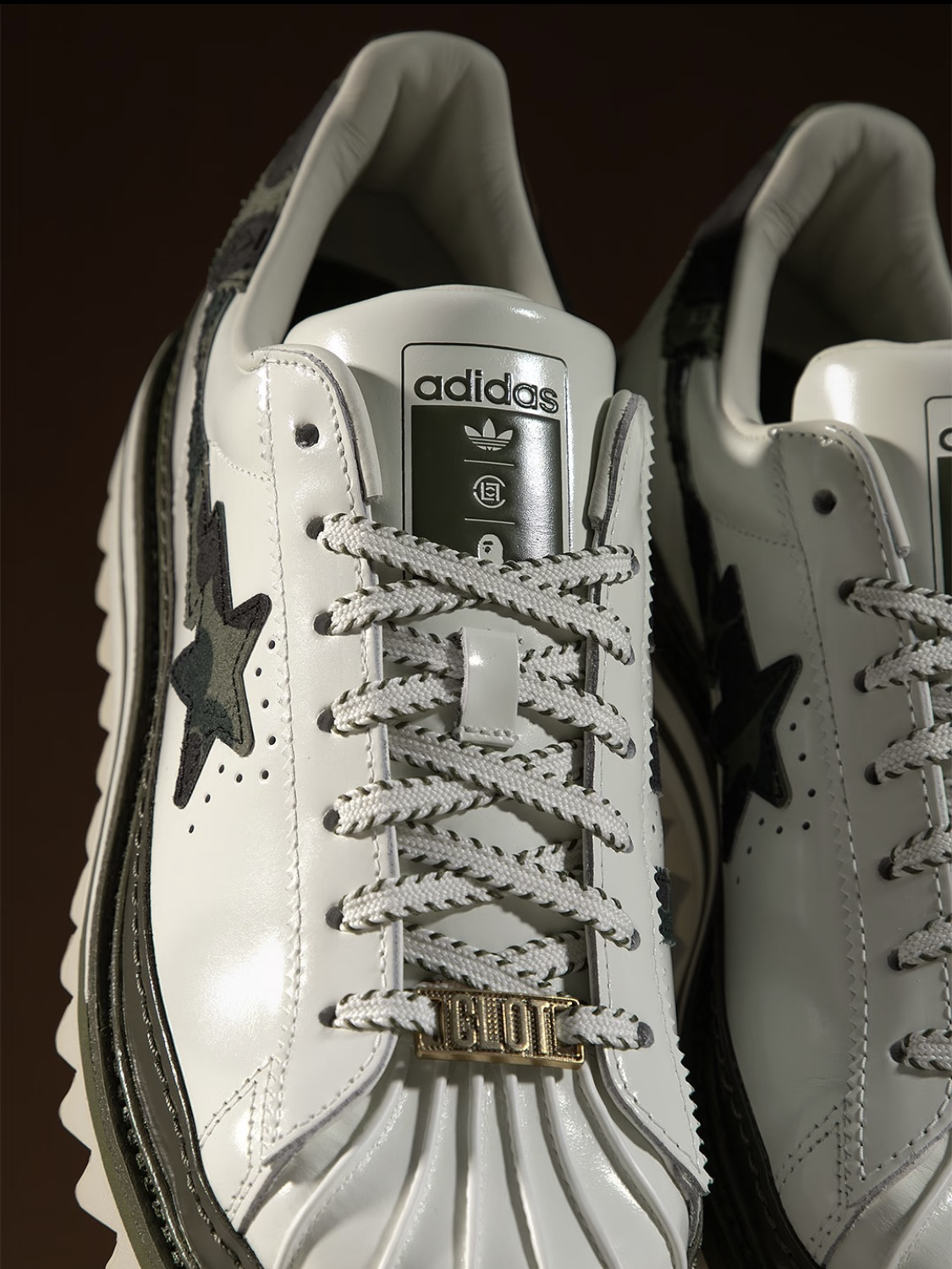 此次设计将 BAPE® 传奇的 1ST CAMO 迷彩与 CLOT 的丝绸纹理相互结合,覆盖于 adidas 三条纹、BAPE® STA 标志与后跟之上,形成极具辨识度的视觉焦点。同时,沙色波纹外底配合锯齿状结构,让 Superstar 的轮廓焕然一新,突破传统印象。 喜欢赶快入手~