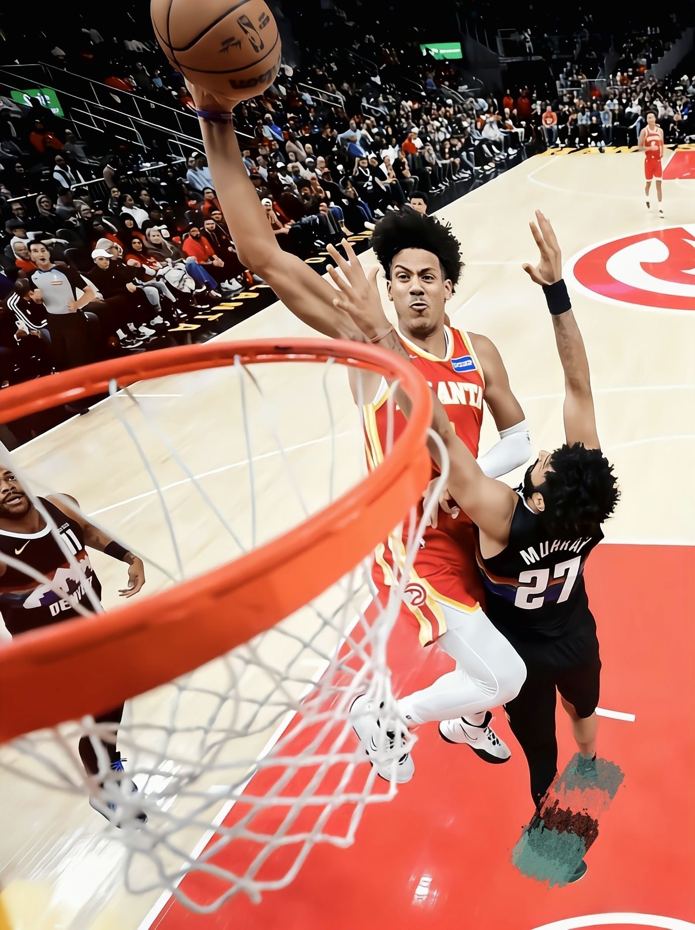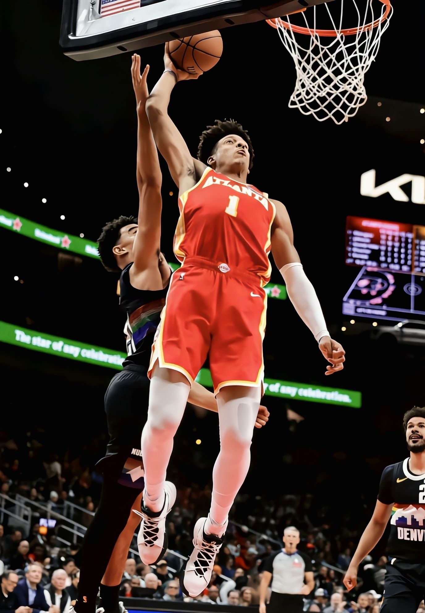 看完老鹰主场133-134憾负掘金那场,杰伦-约翰逊38分钟砍21分18板16助攻的三双太炸了——但他脚上这双Nike Kyrie7,居然是老鞋新穿? 从比赛里看实战:杰伦这种冲筐型前锋,快攻突破、抢板落地的频率超高,Kyrie7的前掌气垫反馈看着很跟脚,他连续变向突破约基奇那几下没拖沓;鞋面是那种紧致的编织材质,他抢板被对抗时脚没晃,包裹感应该够顶。 观赏性不用多说,白黑配色在红色球衣衬...