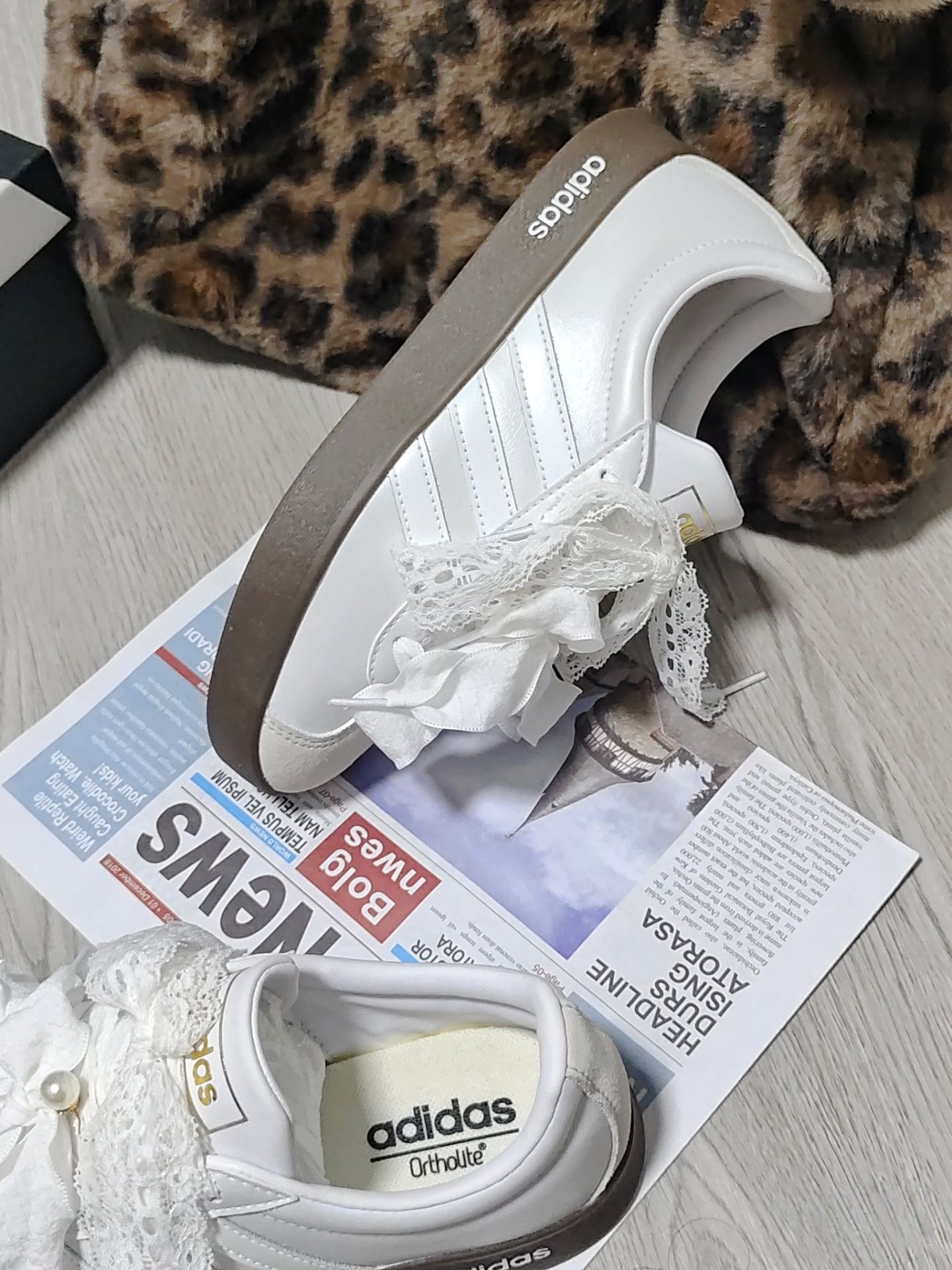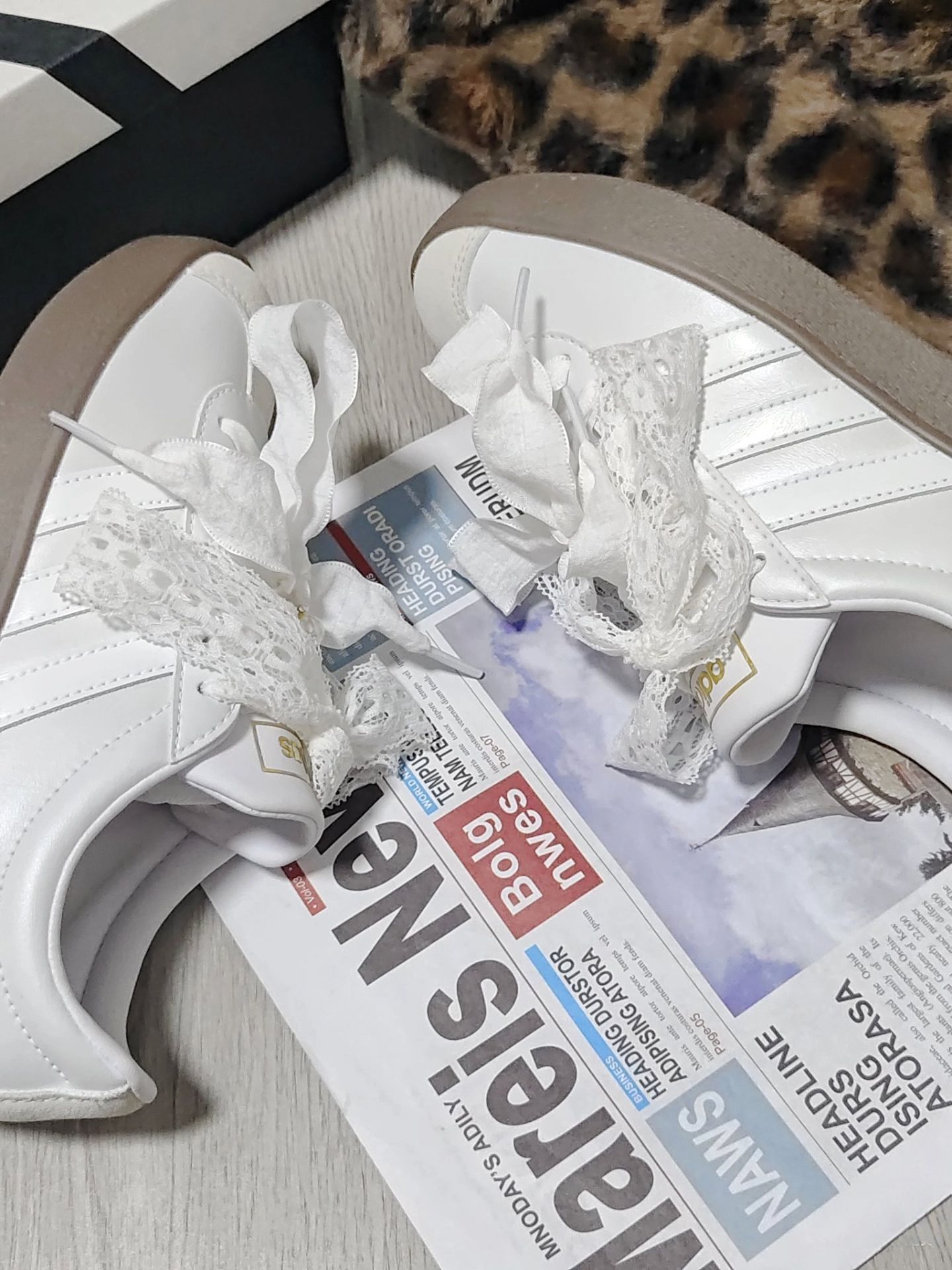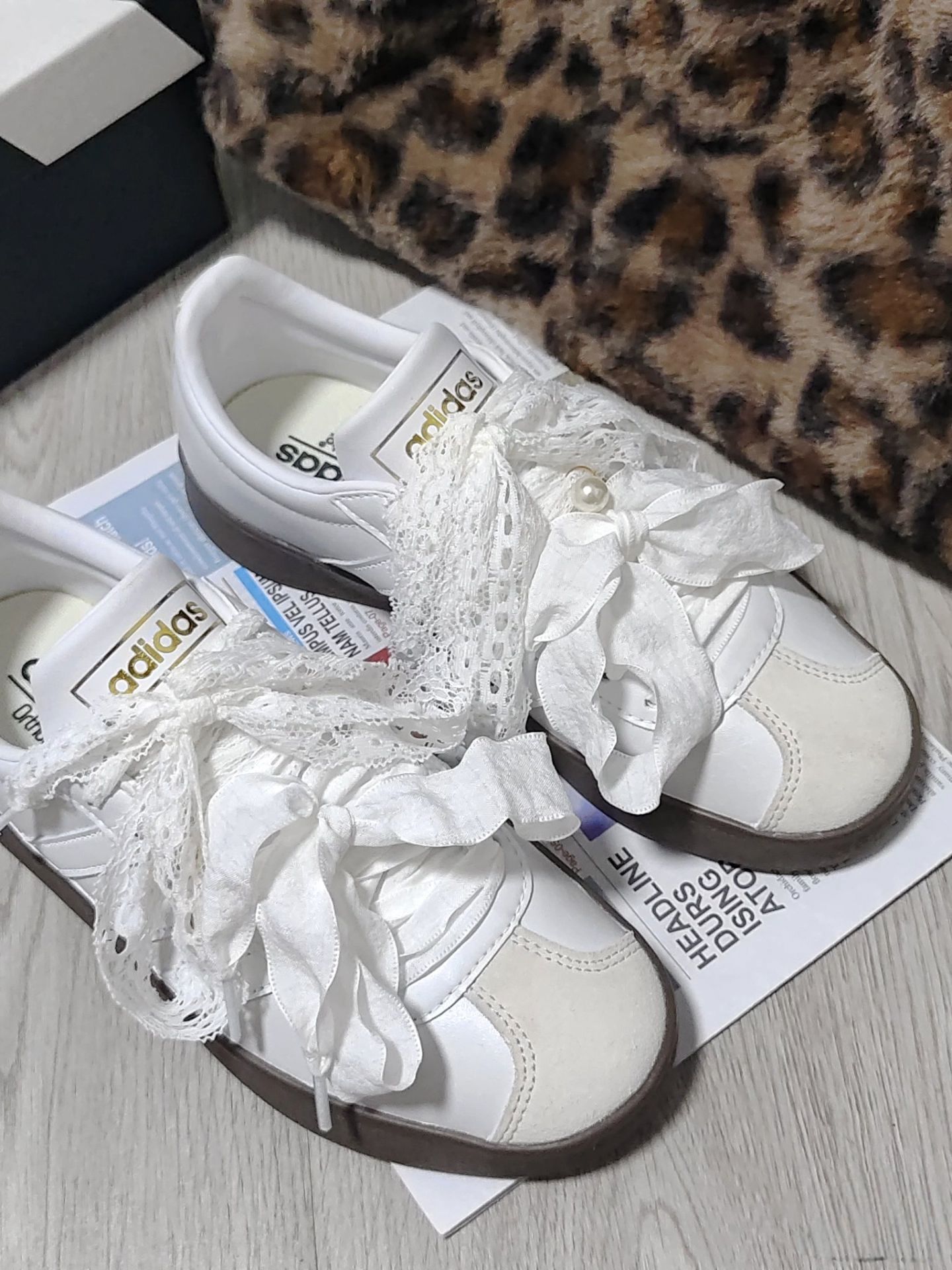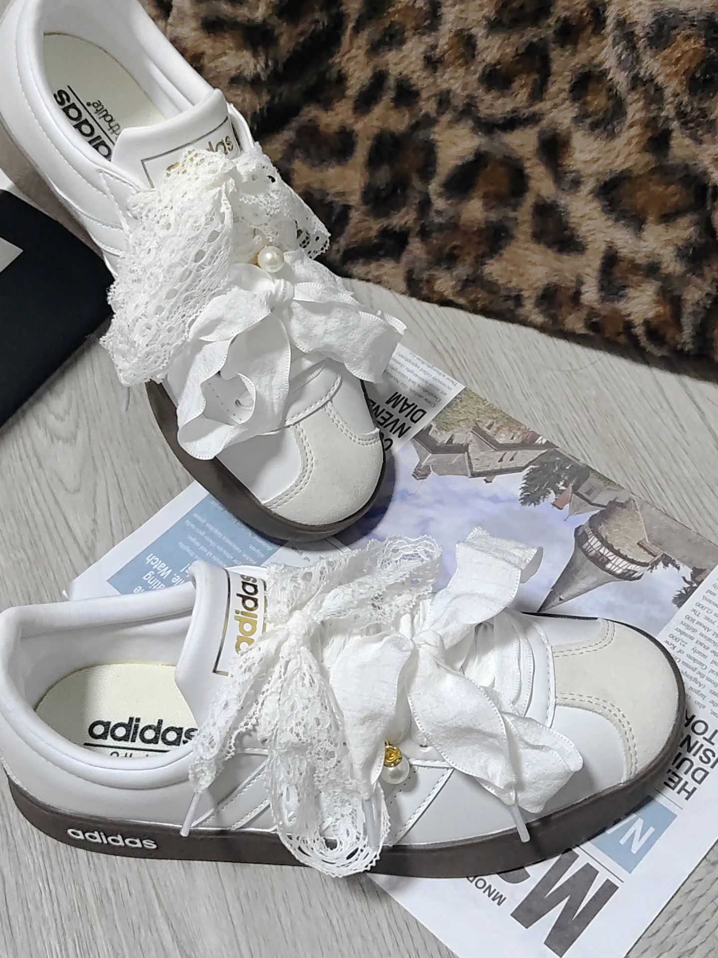 最近挖到了一双超好看滴宝藏定制鞋👟 本来就爱阿迪小白鞋的基础款,结果看到这双加了蕾丝、蝴蝶结和小珍珠的定制款,直接把“甜妹感”拉🈵了! 上脚真的巨好看🥰,配上小裙子,走路上感觉自己都在发光✨