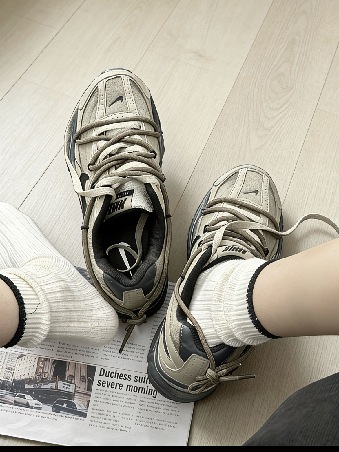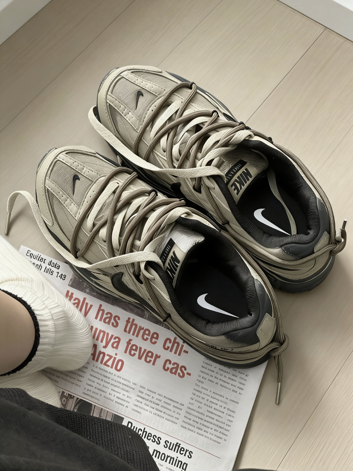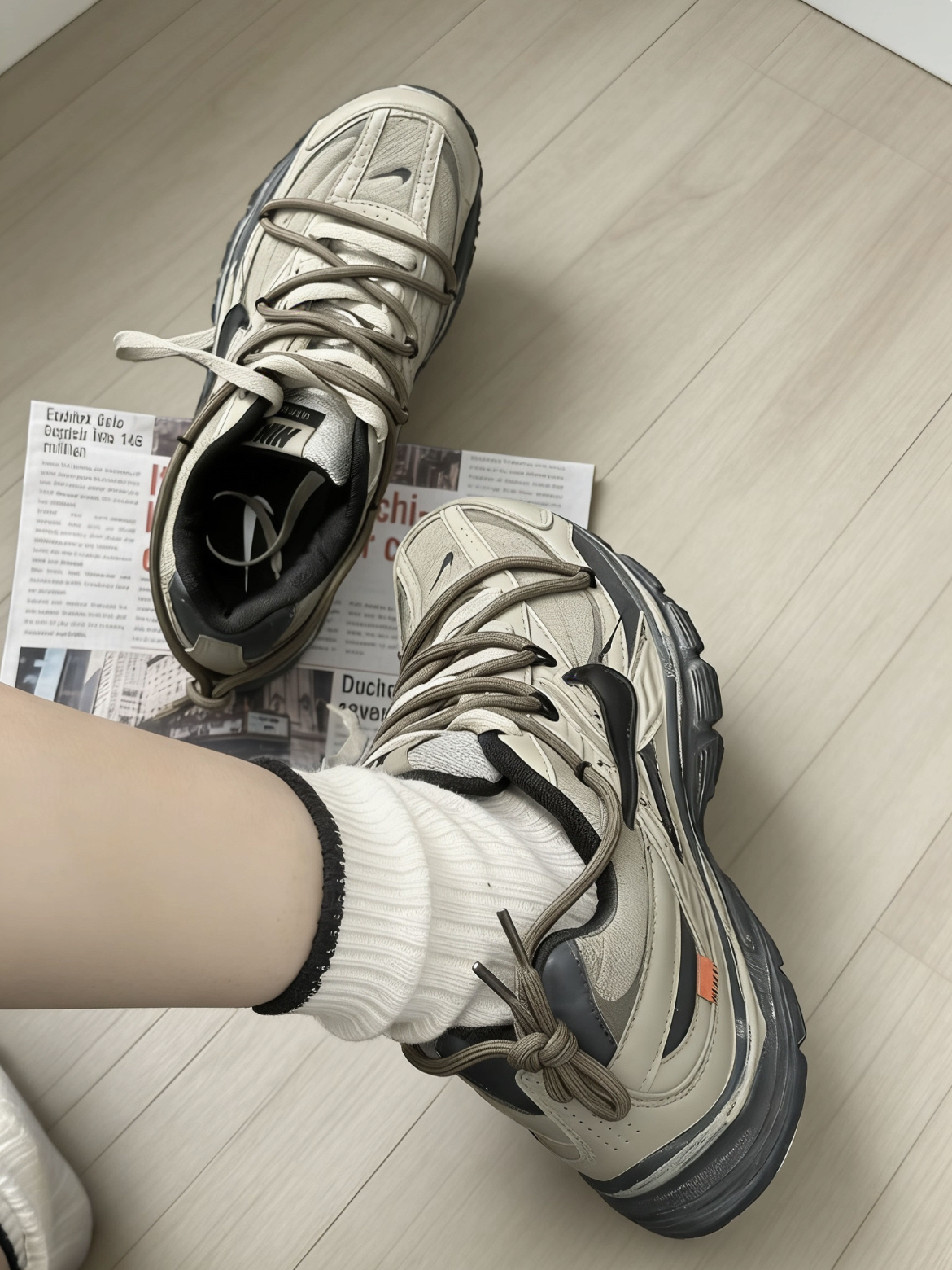 这双Nike做旧款老爹鞋,脏脏旧旧的感觉还挺有味道的,配上经典钩子标,复古感一下就出来了。 平时搭工装裤穿挺帅的,配帽衫就是简单舒服的休闲风。鞋面是那种做旧麂皮的,脏了不太好打理,但也就因为这个才有那个感觉。 出门玩穿了几天,拍照什么的都挺上镜的,属于比较有风格的一双鞋。