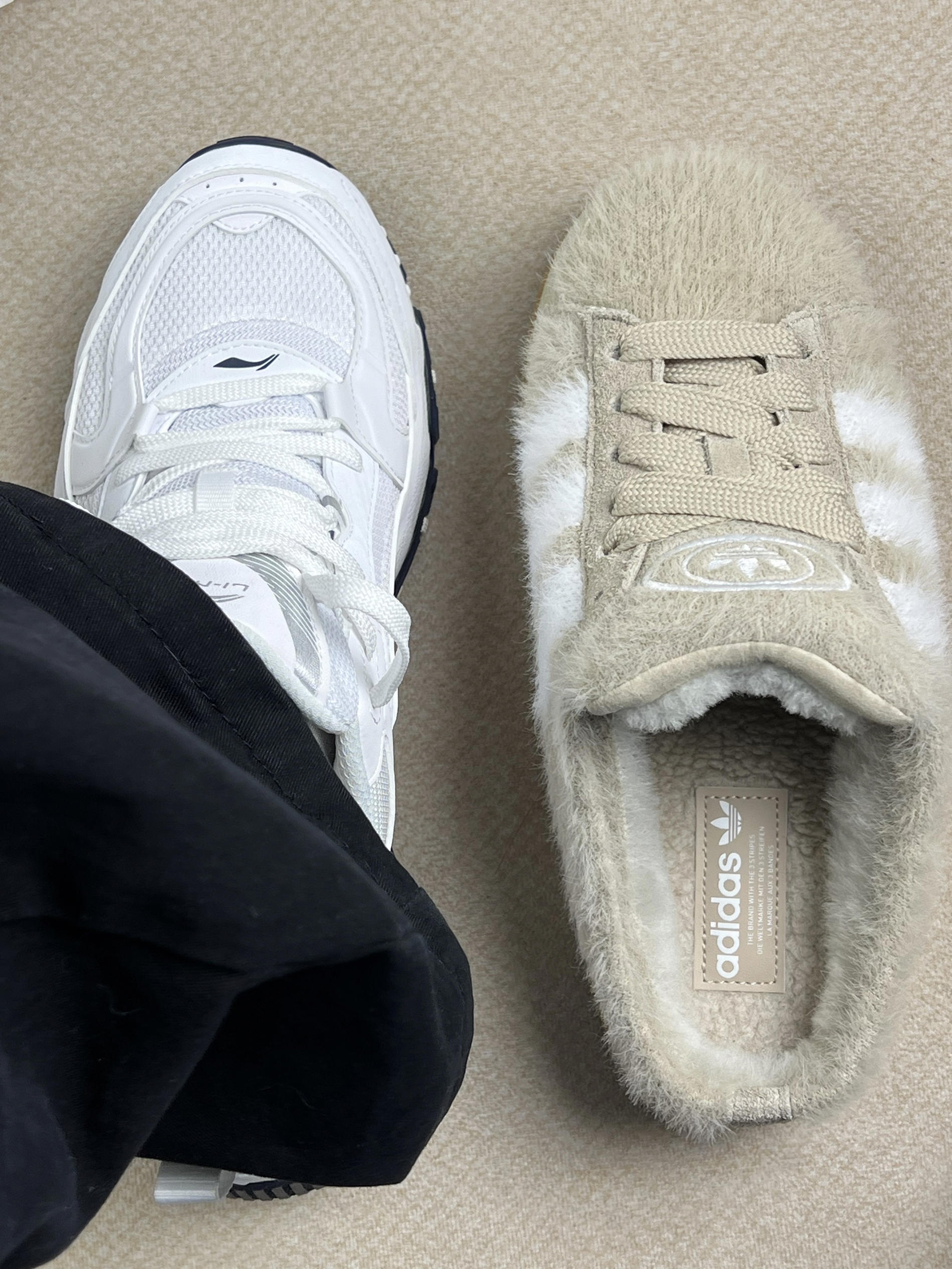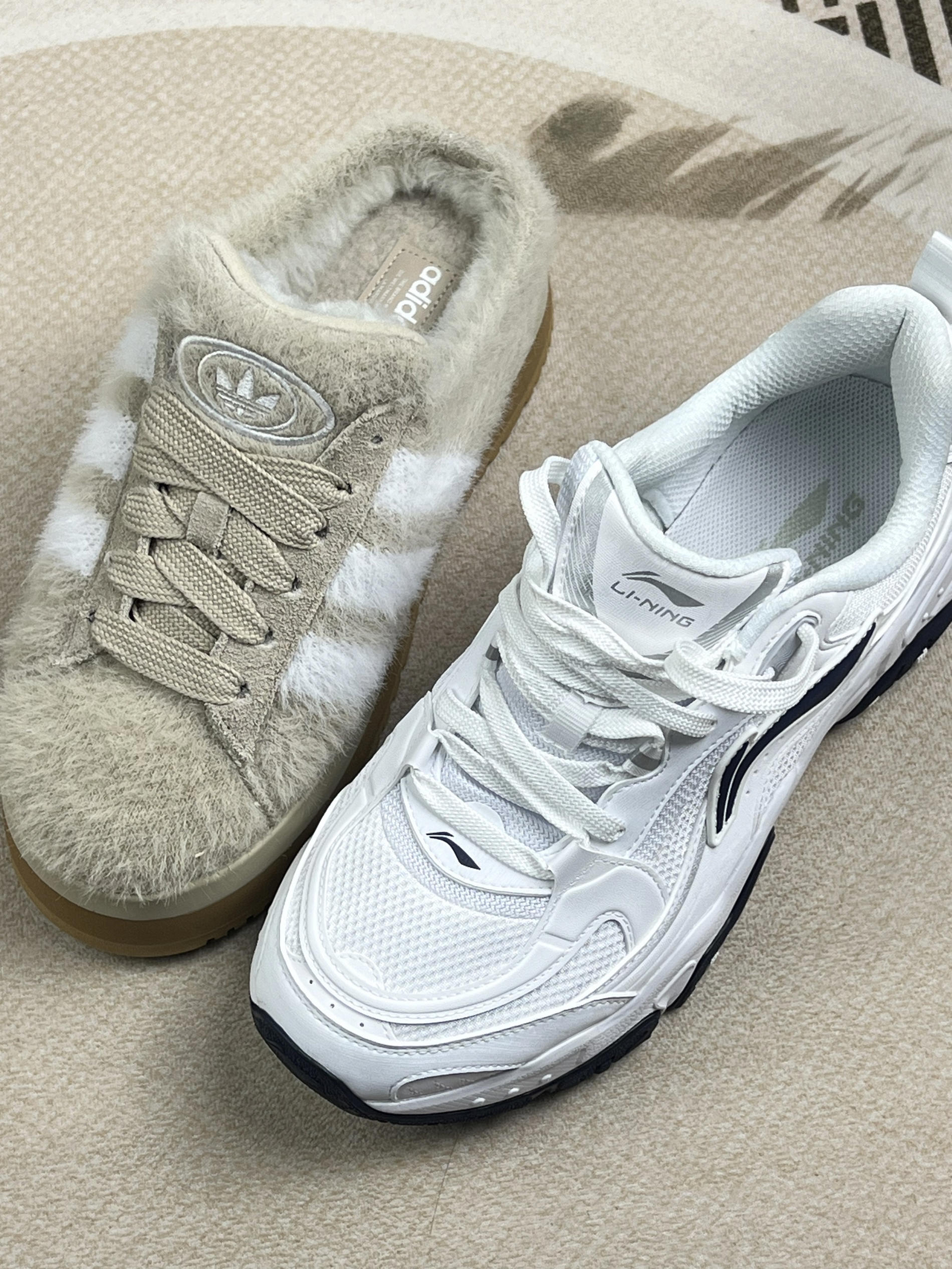 这组对比图真的太真实了!左边李宁白鞋负责外出精致,右边阿迪毛毛拖承包居家舒适,放在一起就是当代年轻人的生活缩影👟 李宁白鞋的外出表现 网面材质透气性确实能打,春夏穿完全不闷脚✨ 但浅色鞋头太容易脏,咖啡渍得立即处理。最喜欢后跟的提环设计,通勤赶地铁时穿脱超方便!不过鞋底防滑纹路在瓷砖上表现一般,雨天要小心~ 阿迪毛毛拖的居家体验 绒面内里像踩在云朵上,取快递时一脚蹬就能出门。不过鞋底...