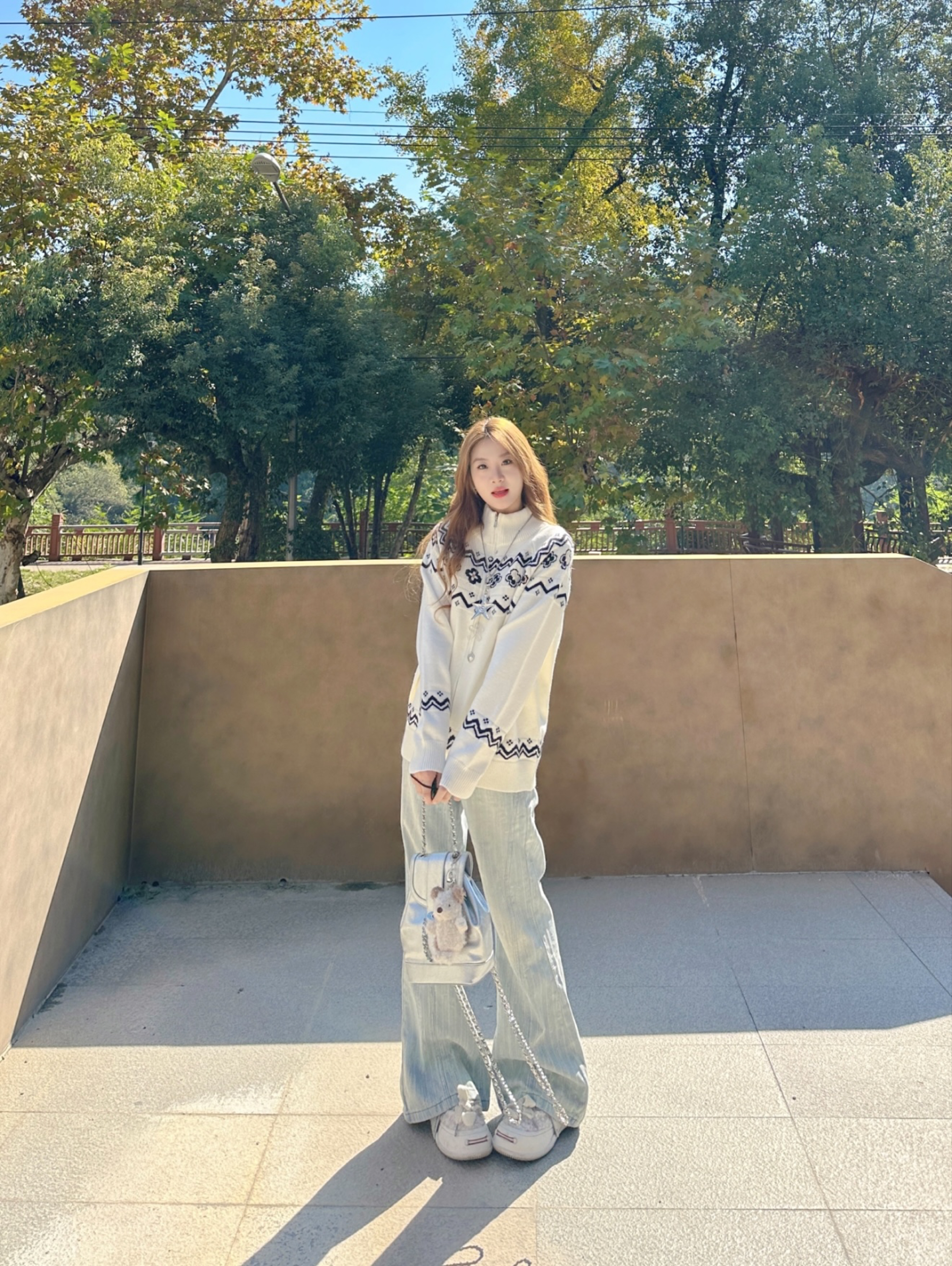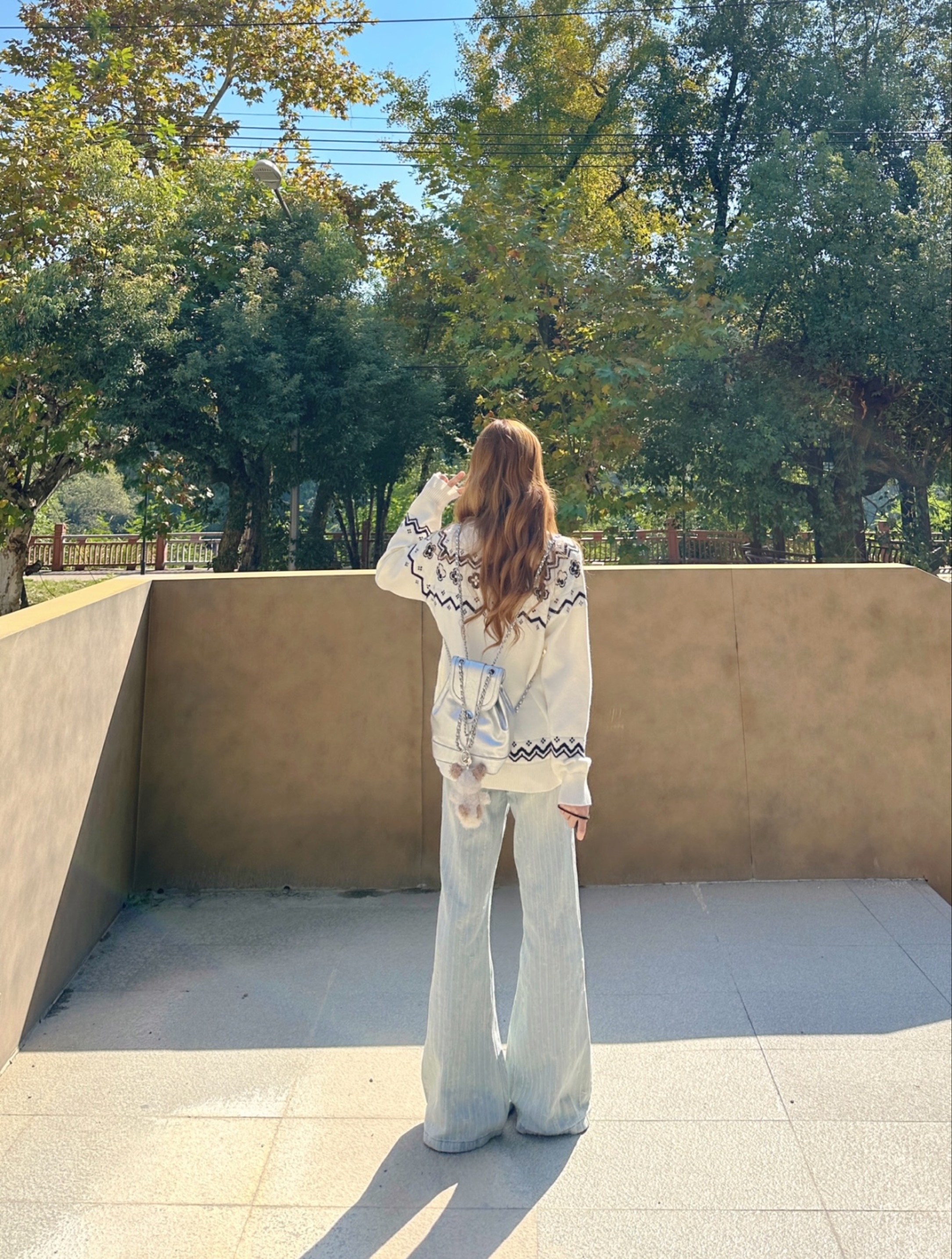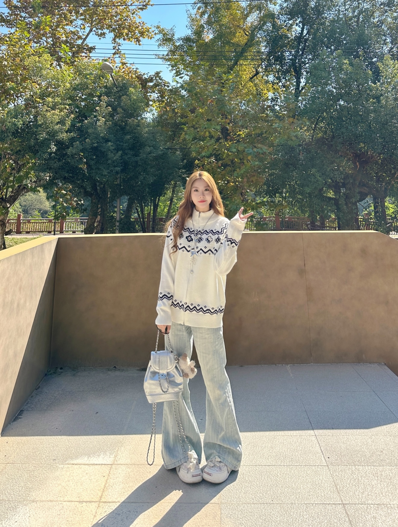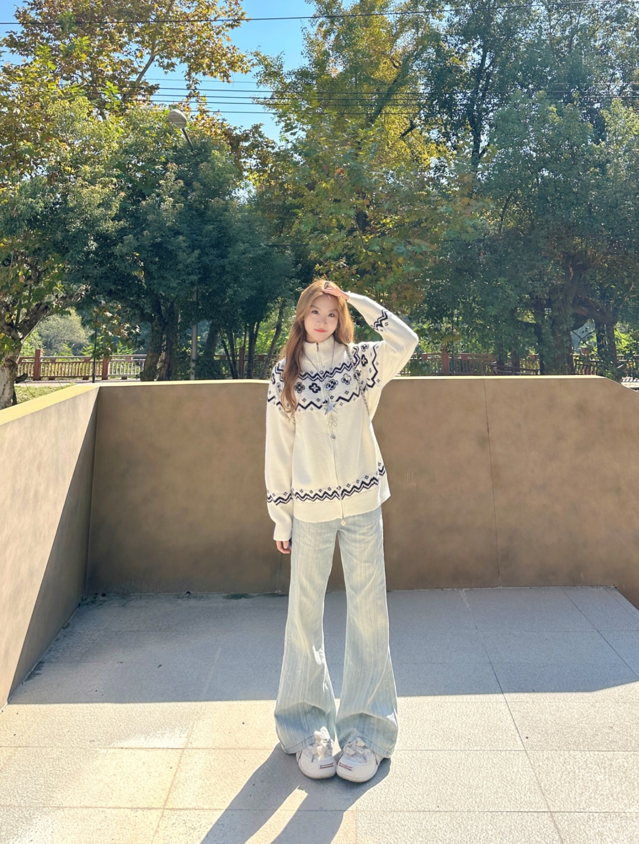 又到了穿费尔岛毛衣的季节了 自带秋冬氛围感 软糯毛衣带着复古花纹 和秋冬的适配度简直是满分 衣服的元素已经很多了 就搭配了一条简单的浅蓝色微喇牛仔裤 拉长比例又显瘦~ 秋天这样穿出门很慵懒松驰又暖又chill